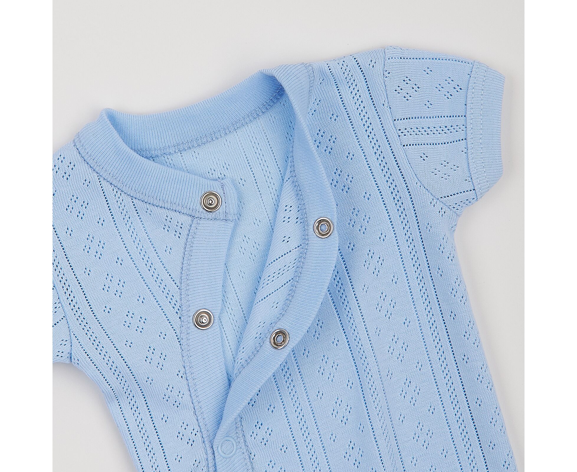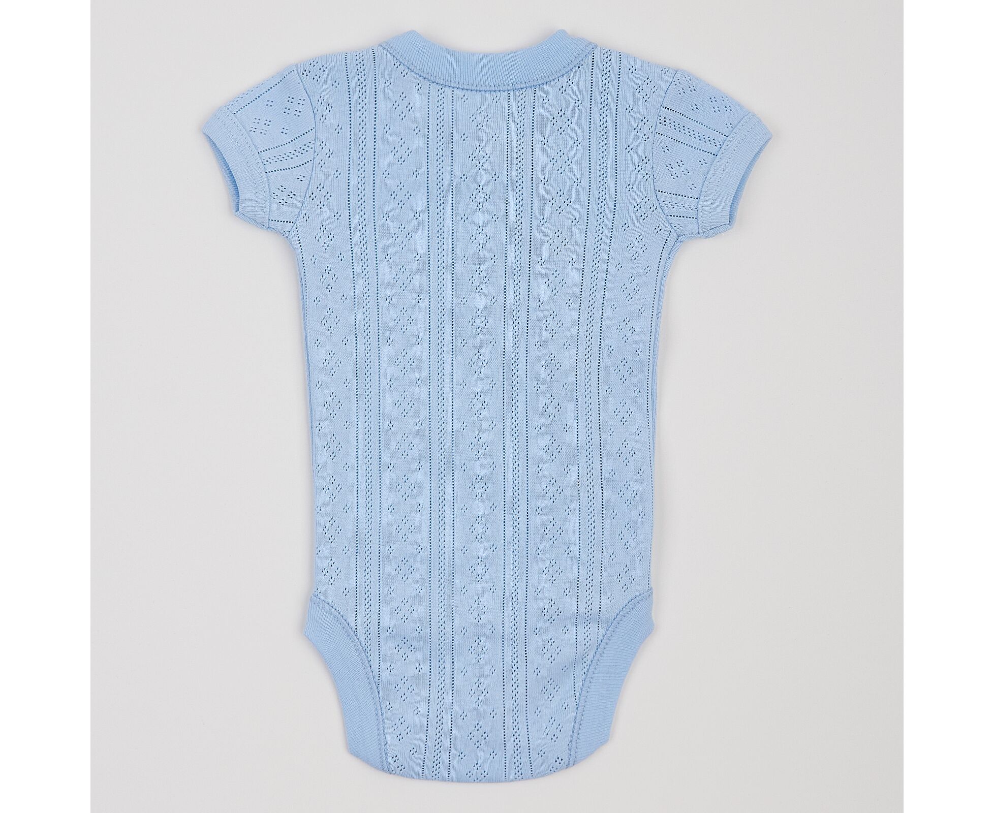 Легкий бодік з коротким рукавом, для новонароджених, з наздвичайно легкої, приємної на дотик, 100% бавовняної трикотажної тканини - ажур. Застбіка асиметрична по переду на кнопки та між ніжками. Всі зрізи та низ рукавів оброблені окантовкою з цієї ж тканини.
