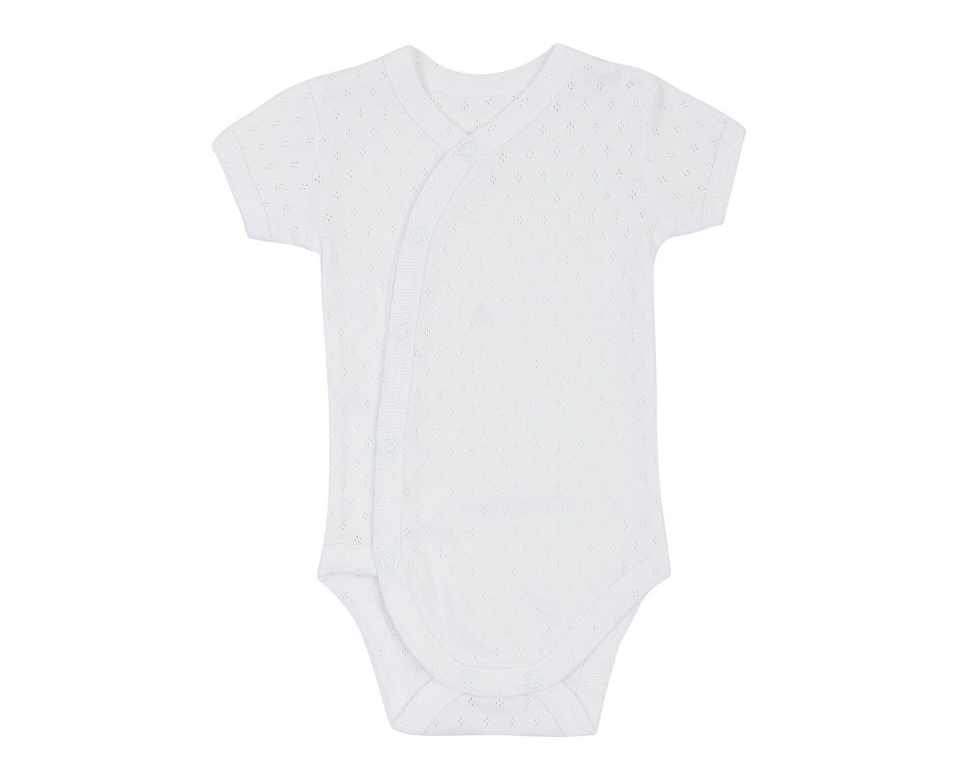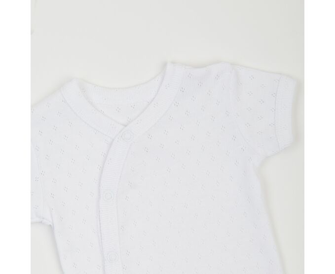 Легкий бодік для дівчинки, з наздвичайно легкої, приємної на дотик, 100% бавовняної трикотажної тканини - ажур. Застбіка асиметрична по переду на кнопки та між ніжками. Всі зрізи та них рукавів оброблені окантовкою з цієї ж тканини.
