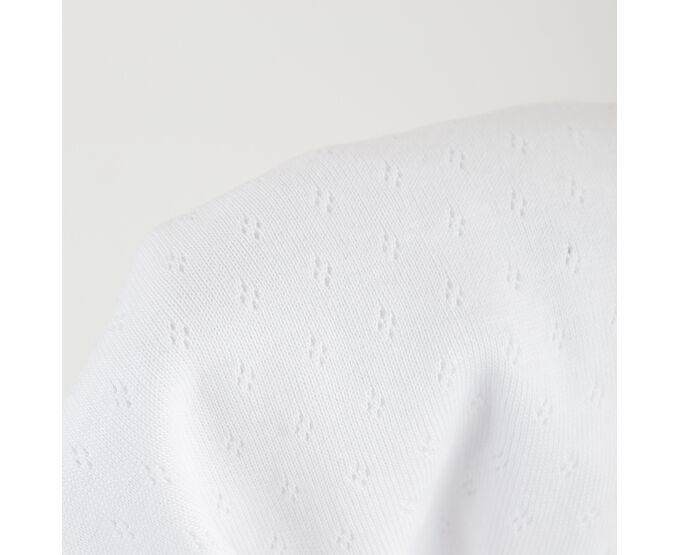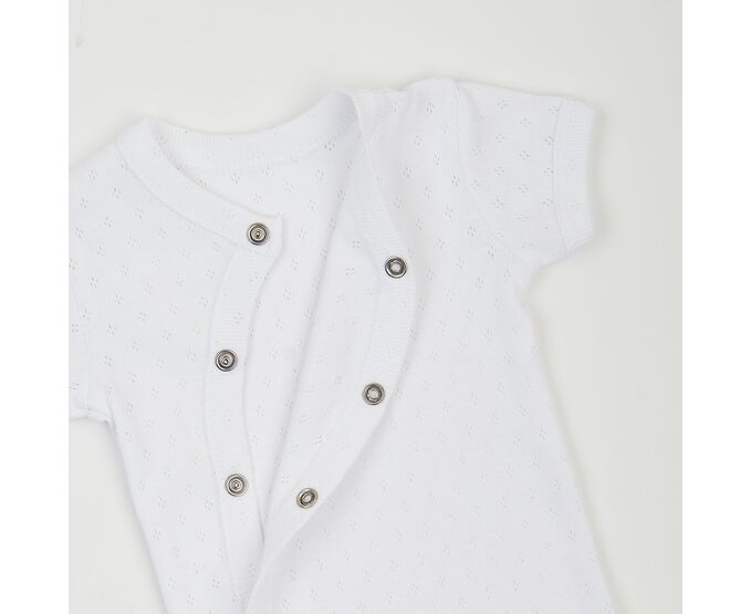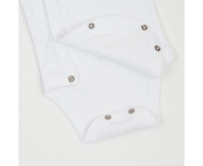 Легкий бодік для дівчинки, з наздвичайно легкої, приємної на дотик, 100% бавовняної трикотажної тканини - ажур. Застбіка асиметрична по переду на кнопки та між ніжками. Всі зрізи та них рукавів оброблені окантовкою з цієї ж тканини.
