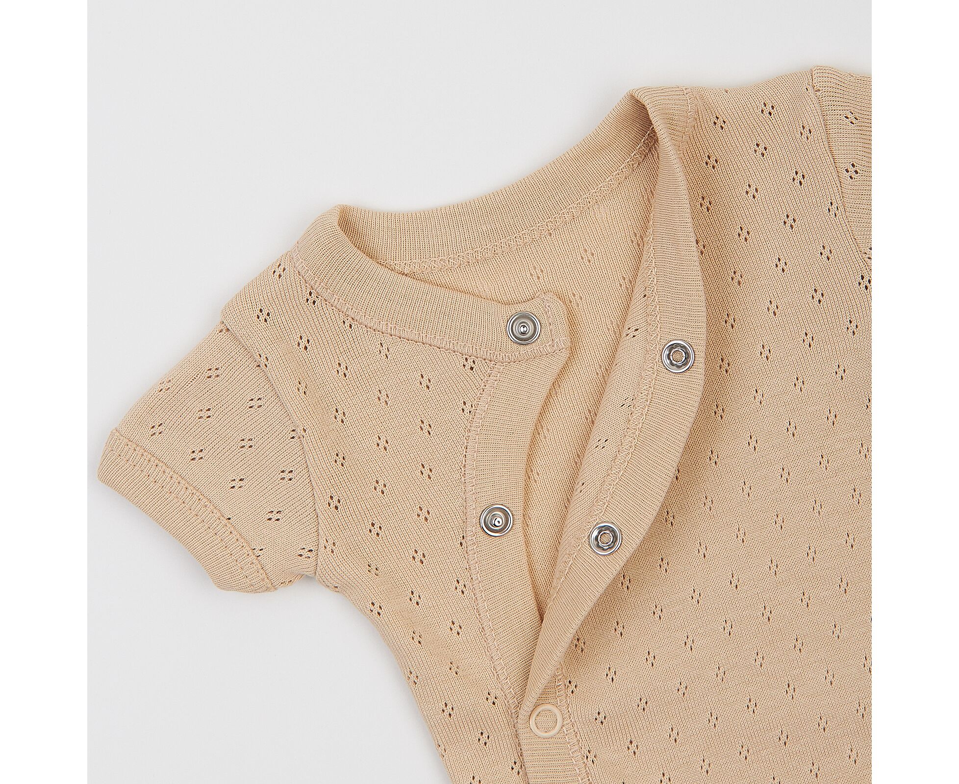 Легкий бодік з коротким рукавом, для новонароджених, з наздвичайно легкої, приємної на дотик, 100% бавовняної трикотажної тканини - ажур. Застбіка асиметрична по переду на кнопки та між ніжками. Всі зрізи та низ рукавів оброблені окантовкою з цієї ж тканини.