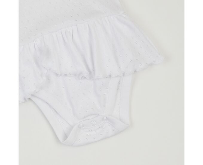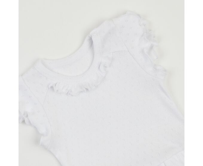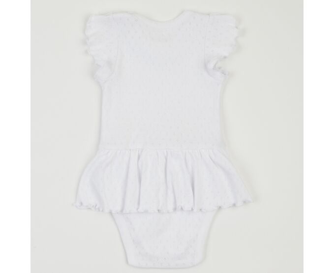 Літній бодік для дівчинки, з наздвичайно легкої, приємної на дотик, 100% бавовняної трикотажної тканини - ажур. Застбіка на кнопки по плечу та між ніжками. Рукав-крильце, рюш по горловині переду та волан по лінії талії, імітуючий спідничку, надають виробу романтичного стилю.