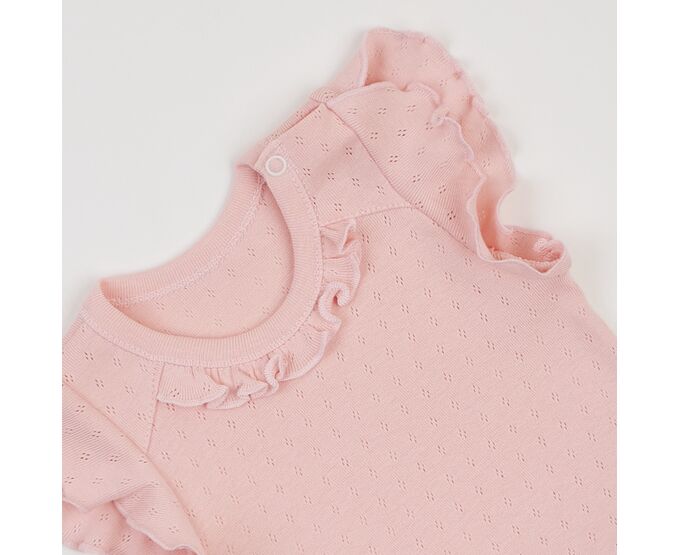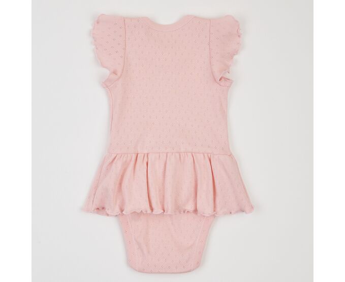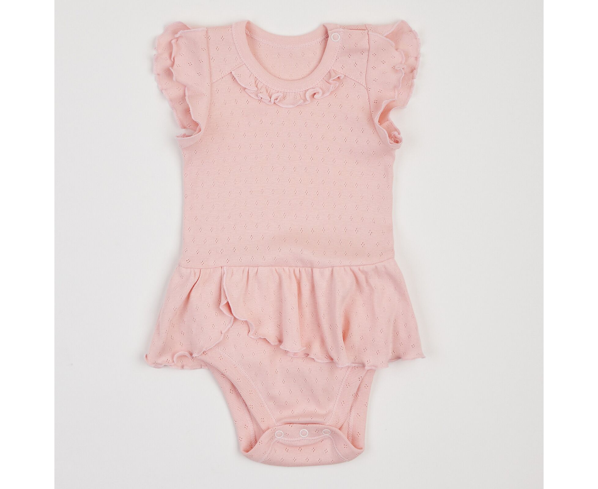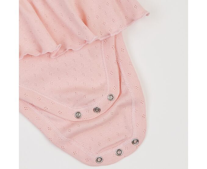 Літній бодік для дівчинки, з наздвичайно легкої, приємної на дотик, 100% бавовняної трикотажної тканини - ажур. Застбіка на кнопки по плечу та між ніжками. Рукав-крильце, рюш по горловині переду та волан по лінії талії, імітуючий спідничку, надають виробу романтичного стилю.