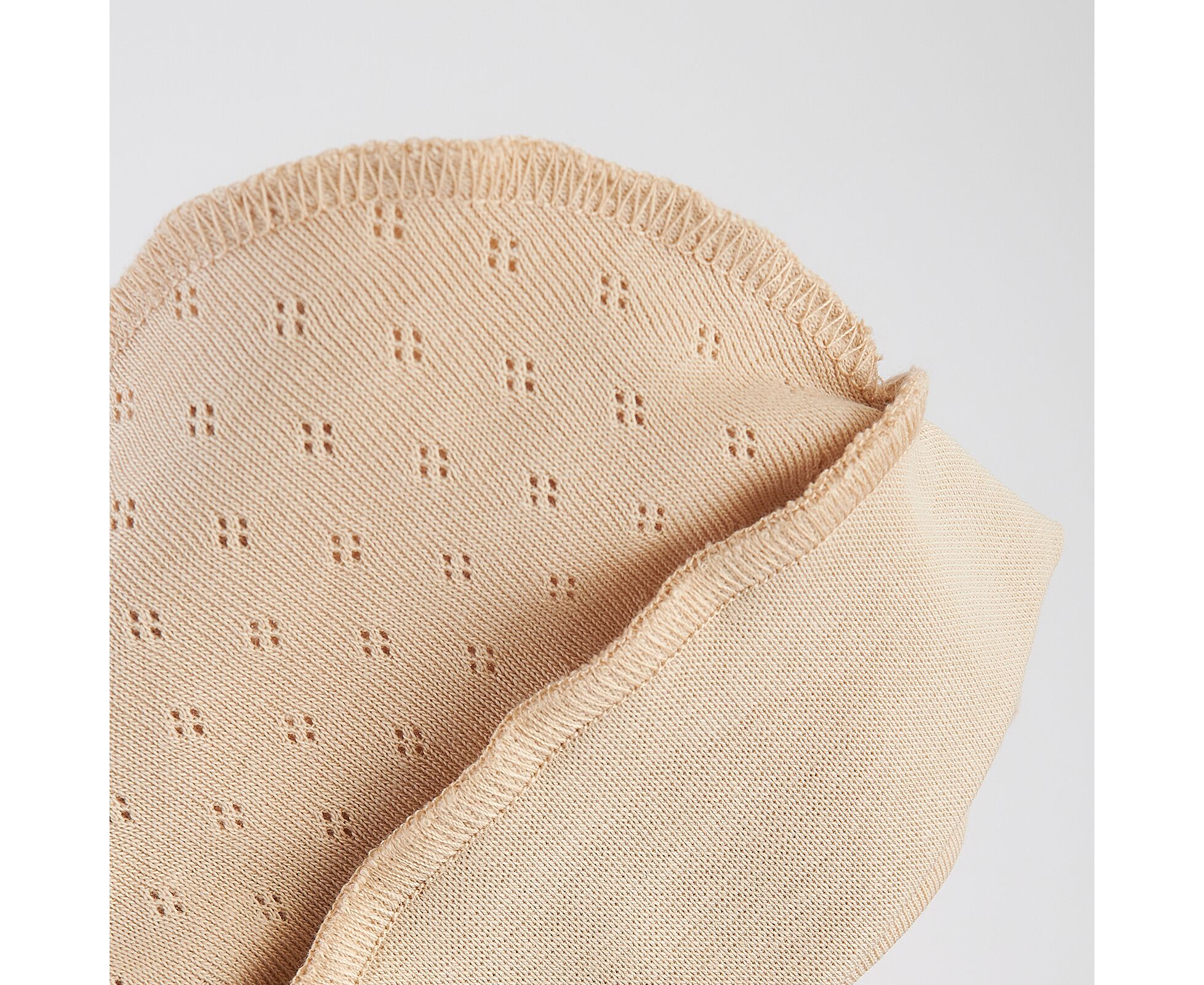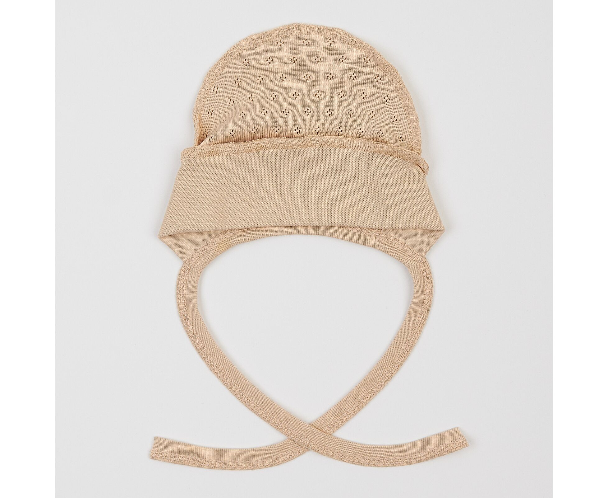 Чепчик для новонародженого, з наздвичайно м'якої, приємної на дотик 100% бавовняної трикотажної тканини - ажур. Передня деталь з еластичного полотна забезпечує ідеальну посадку та щільне прилягання. Шви виробу назовні і не торкаються шкіри дитини, виключаючи будь-який дискомфорт та подразнення.
