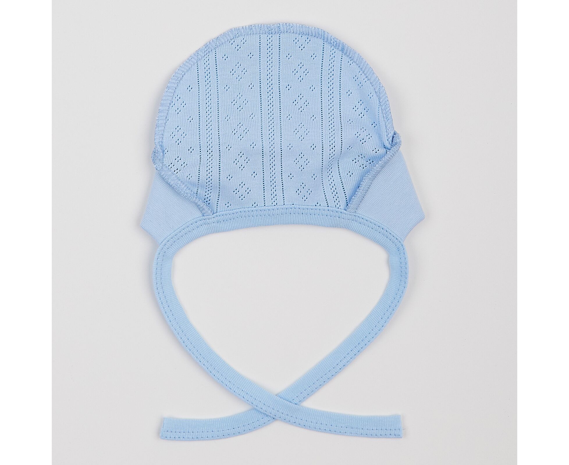 Чепчик для новонародженого, з наздвичайно м'якої, приємної на дотик 100% бавовняної трикотажної тканини - ажур. Передня деталь з еластичного полотна забезпечує ідеальну посадку та щільне прилягання. Шви виробу назовні і не торкаються шкіри дитини, виключаючи будь-який дискомфорт та подразнення.