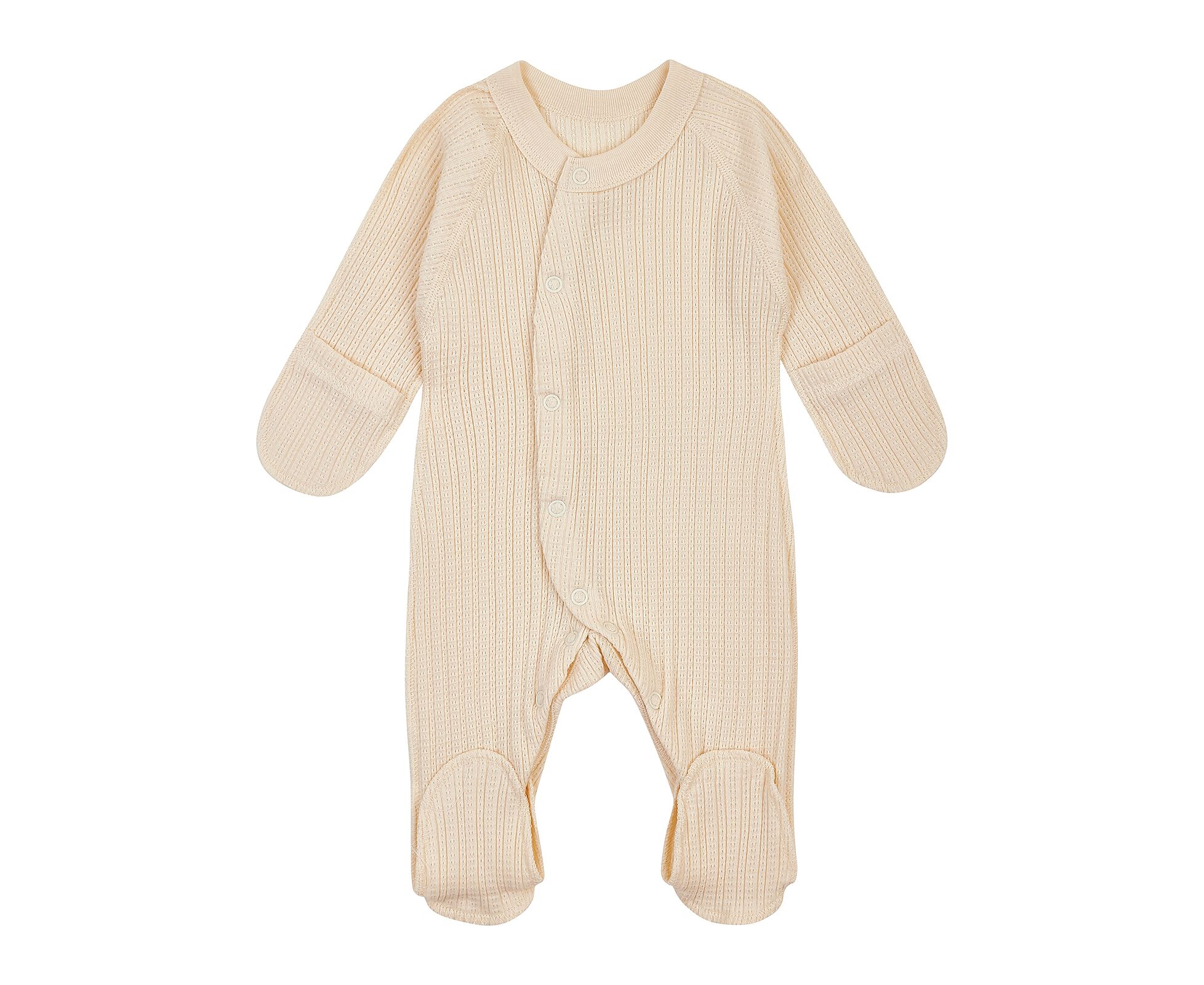 Легкий комбінезон для новонароджених, з наздвичайно м'якої, приємної на дотик 100% бавовняної трикотажної тканини - ажур. Застібка асиметрична на кнопки по борту та по ніжкам. Рукав із закритою ручкою для безпеки Вашого малюка. Комбінезон зі швами назовні, що не торкаються шкіри дитини, виключаючи будь-який дискомфорт та подразнення.