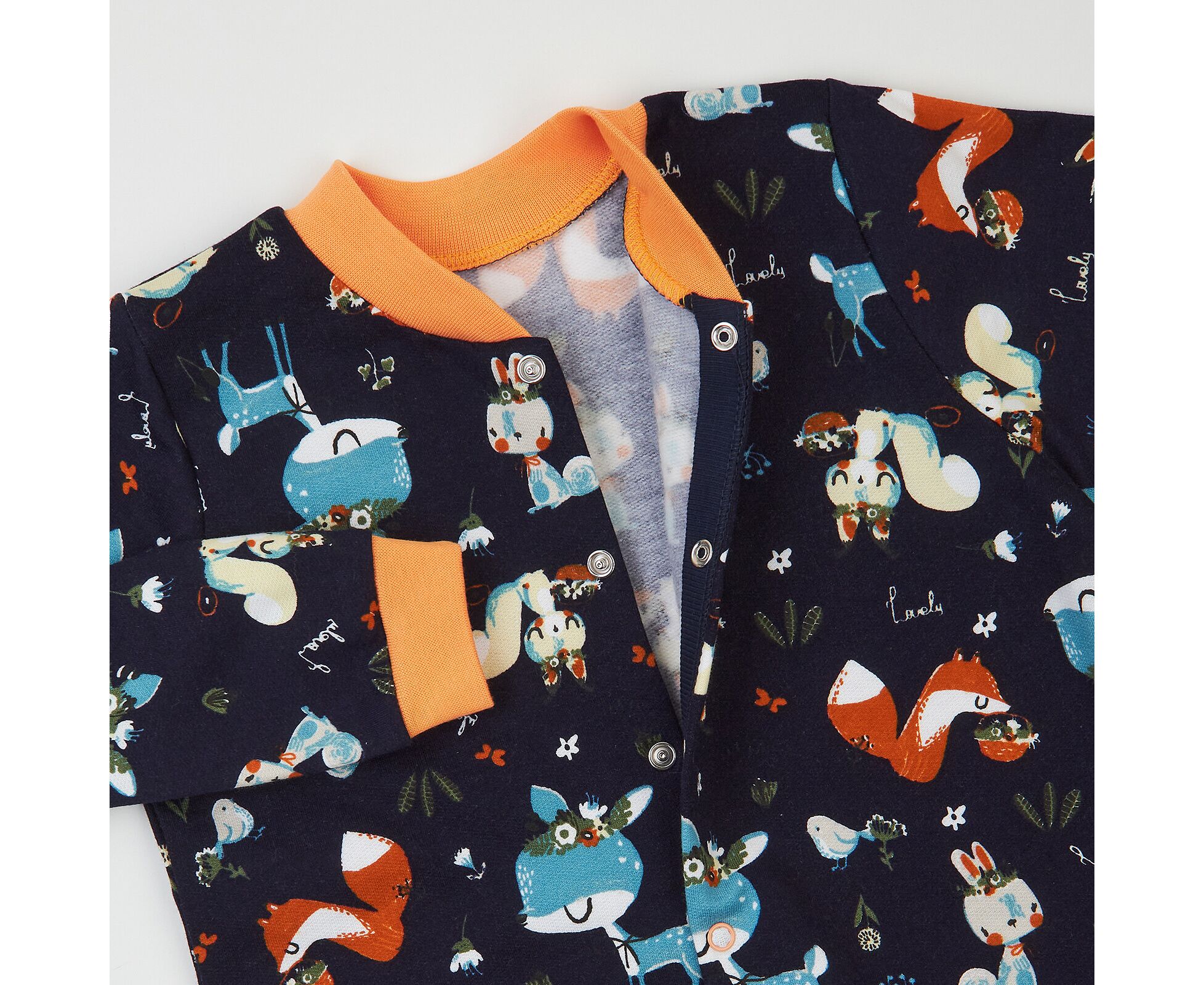 Теплий чоловічок з м'якого, приємного на дотик футеру з начосом. Застібка по борту та частково по ныжкам на кнопки. Стійка, манжети рукавів та манжети по ніжкам з еластичної рібани.