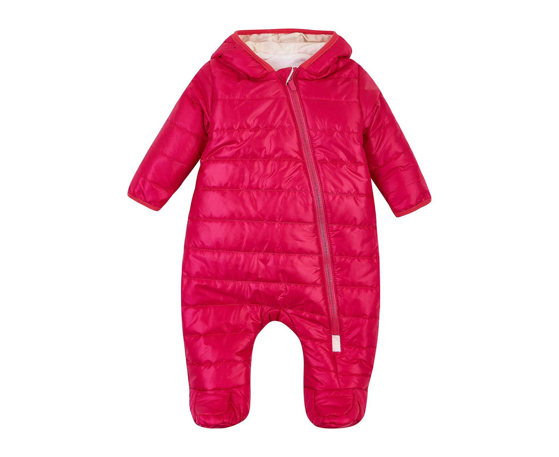 Комбінезон з каптуром та закритими ніжками,на бавовняній трикотажній підкладці, з утеплювачем (синтепух щільність 150г/кв.м.), який добре зберігає форму та об'єм, навіть після багаторазового стиснення. Застібка асиметрична, низ рукавів та передній край каптура оброблені еластичною тасьмою-пополамкою. Для полегшення надягання на дитину виворіт рукавів з гладкої тканини підкладки.