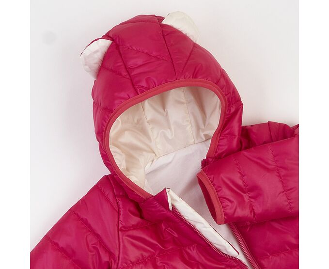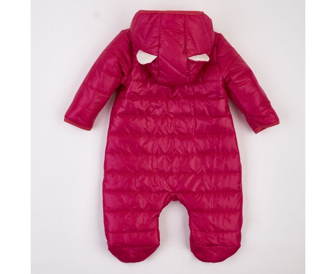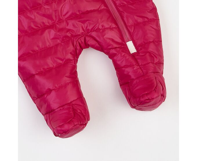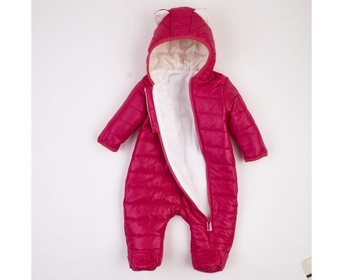 Комбінезон з каптуром та закритими ніжками,на бавовняній трикотажній підкладці, з утеплювачем (синтепух щільність 150г/кв.м.), який добре зберігає форму та об'єм, навіть після багаторазового стиснення. Застібка асиметрична, низ рукавів та передній край каптура оброблені еластичною тасьмою-пополамкою. Для полегшення надягання на дитину виворіт рукавів з гладкої тканини підкладки.
