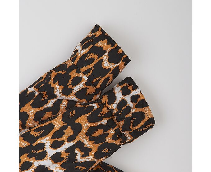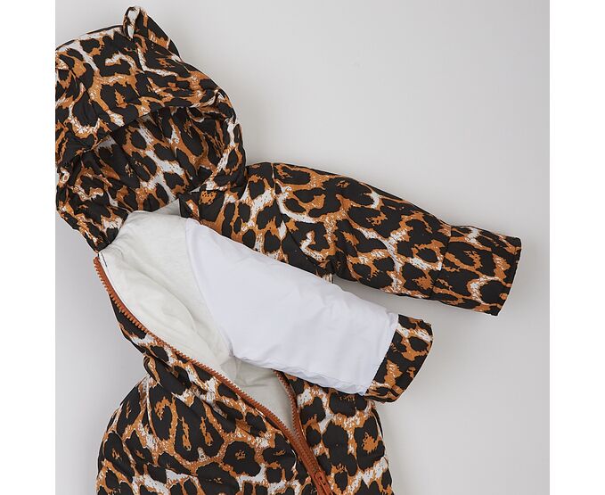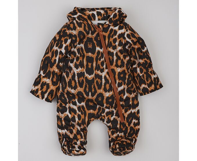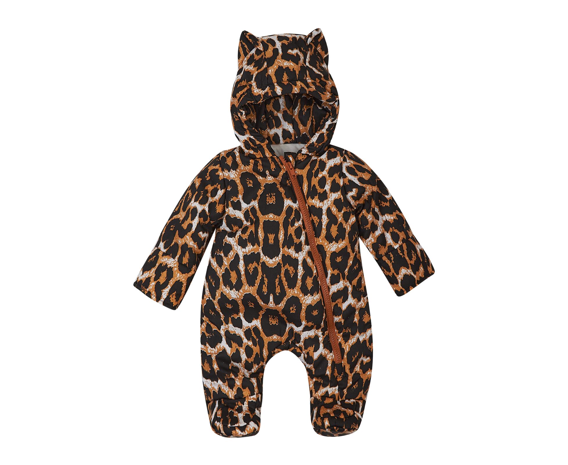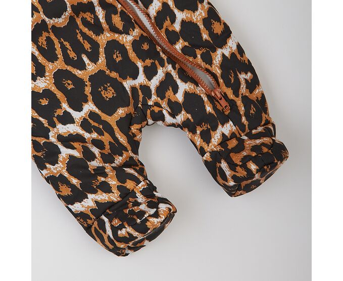 Демісезонний дитячий комбінезон з каптуром та закритими ніжками. Виготовлений з якісної матової плащовки модного леопардового принту, з особливим просоченням, яке забезпечує водовідштовхувальні та вітрозахисні властивості. Комбінезон з утеплювачем синтепух щільністю 150г/кв.м, який добре зберігає тепло, форму та об'єм, навіть після багаторазового стиснення. Підкладка комбінезону (крім каптура) з бавовняного трикотажного полотна преміум якості. Застібка асиметрична на блискавку по переду з продовженням по ніжці для зручності надягання. Низ рукавів з відворотом на еластичній гумці, що захистить долоньки вашого малюка. По передньому краю каптура еластична тасьма, для щільності прилягання каптура.