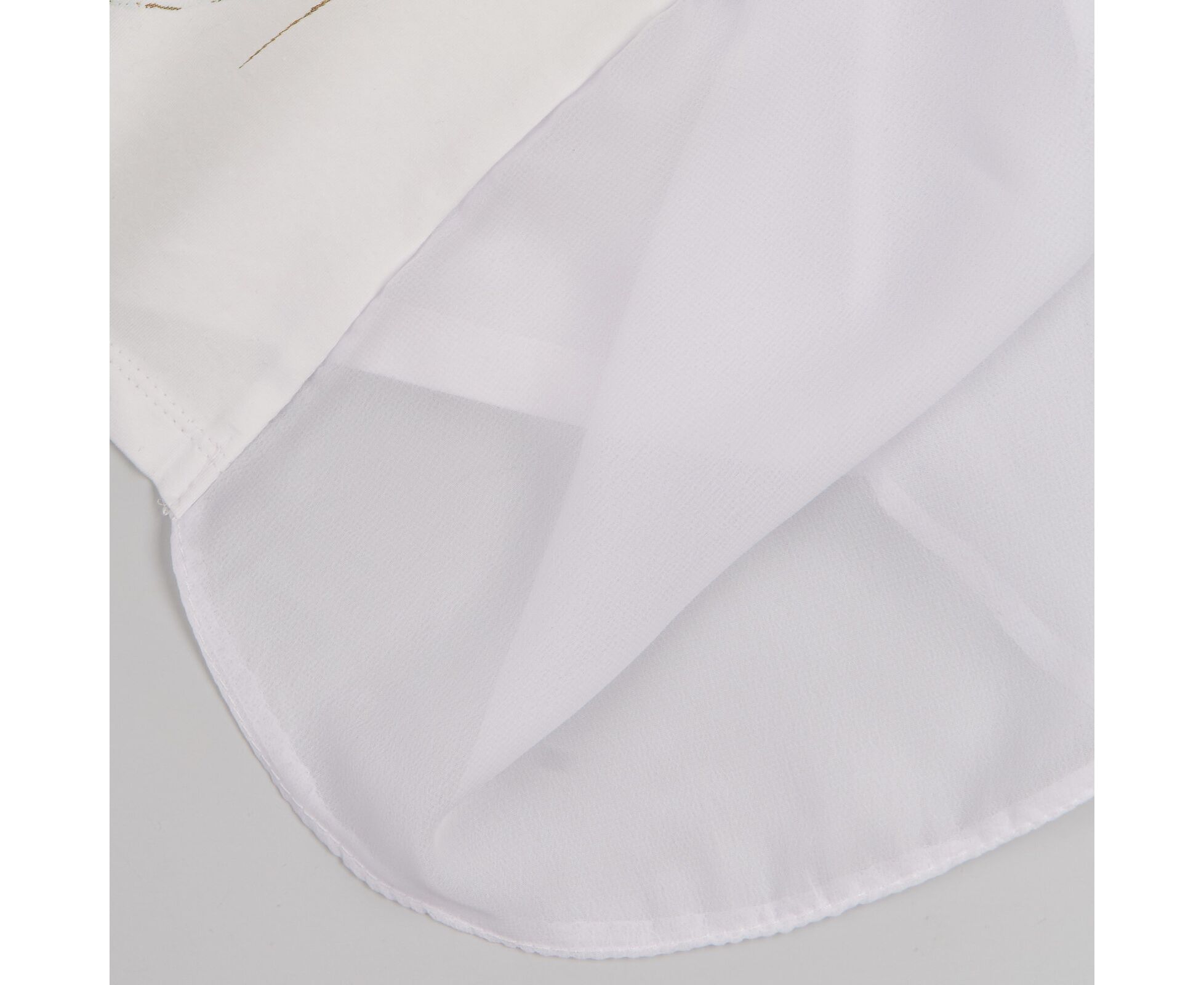 Футболка для дівчинки. Футболка з білого стрейч-куліру (97%бавовна 3%еластан), з круглим вирізом горловини з пришивною планкою, та з маленьким рукавом з манжетом-відворотом. На переді друк, оздоблений стразами. Спинка з кокеткою та основною деталлю з білого шифону.