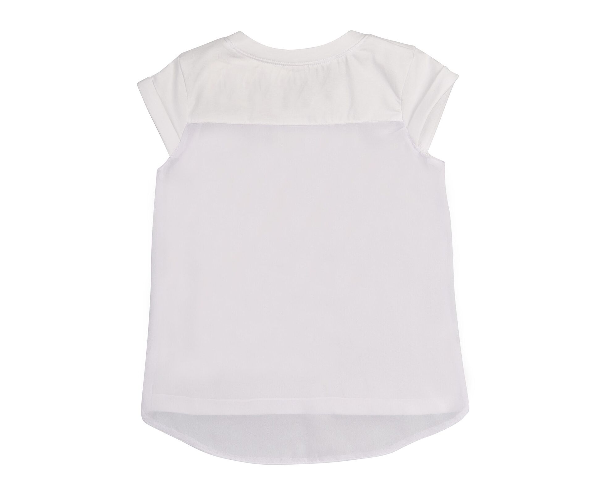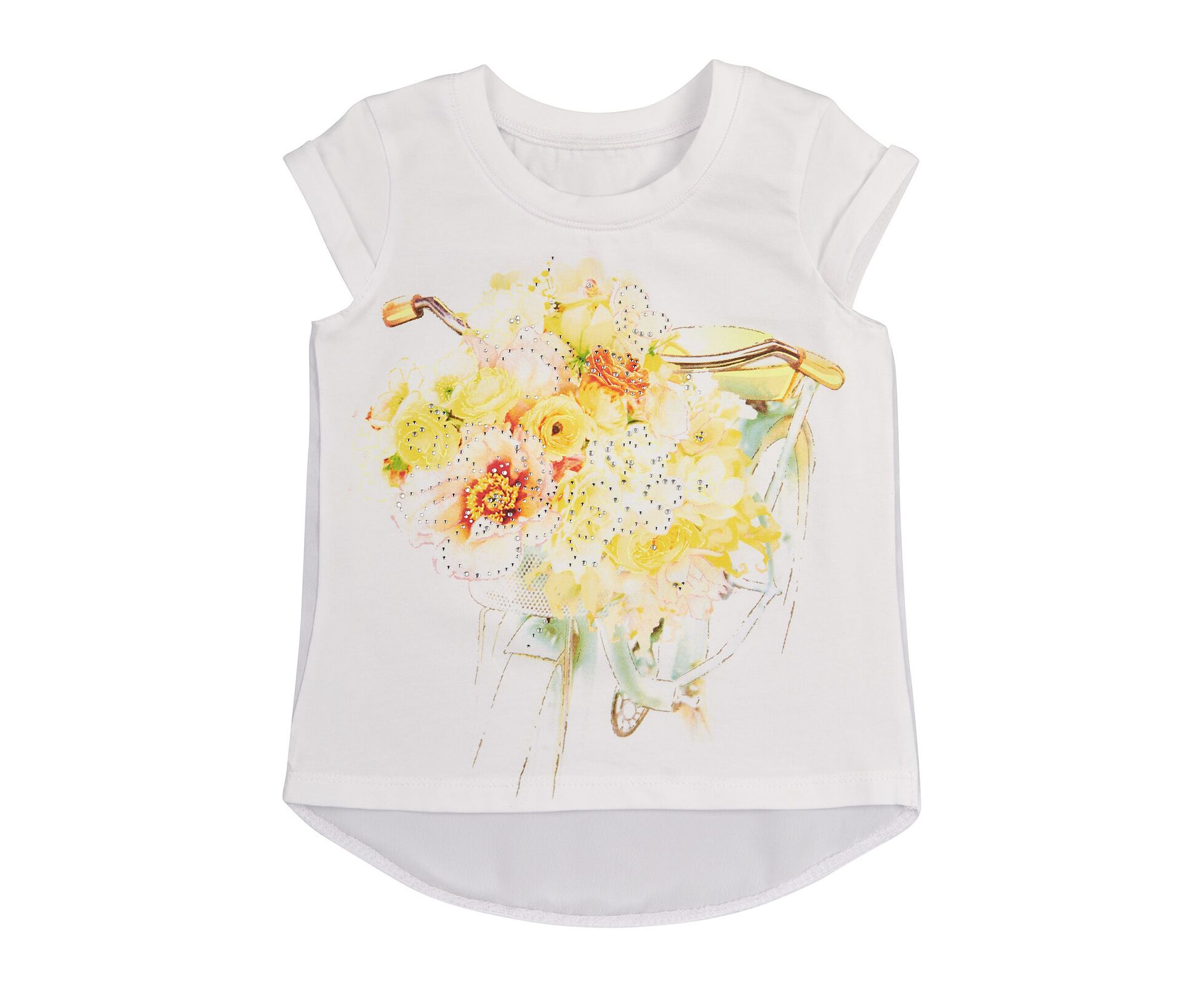 Футболка для дівчинки. Футболка з білого стрейч-куліру (97%бавовна 3%еластан), з круглим вирізом горловини з пришивною планкою, та з маленьким рукавом з манжетом-відворотом. На переді друк, оздоблений стразами. Спинка з кокеткою та основною деталлю з білого шифону.