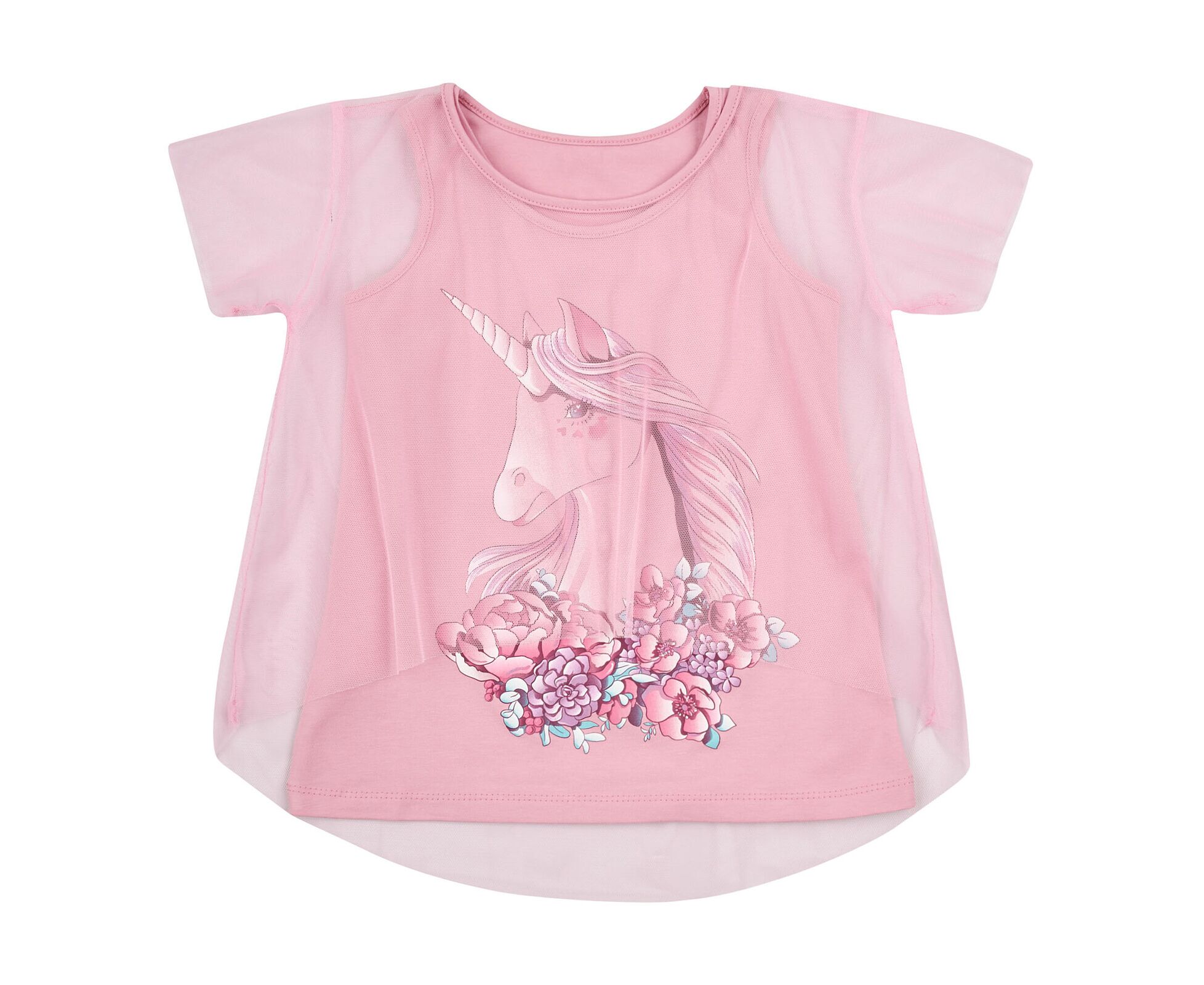Комплект для дівчинки, з стрейч-кулірової майки та накидки з напівпрозорої євросітки. Майка з стильним принтом на переді, горловина та пройми окантовані руликом. Накидка вільного широкого крою, з необробленими зрізами. Круглий визір горловини окантований руликом.