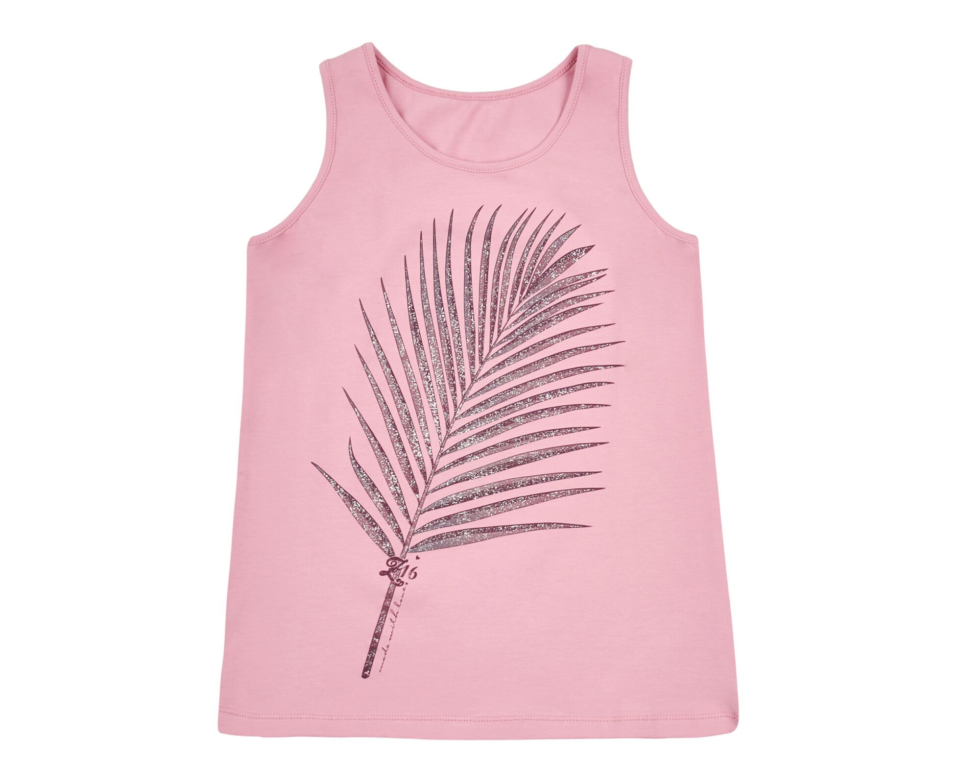 Комплект для дівчинки, з стрейч-кулірової майки та накидки з напівпрозорої євросітки. Майка з стильним принтом на переді, горловина та пройми окантовані руликом. Накидка вільного широкого крою, з необробленими зрізами. Круглий визір горловини окантований руликом.