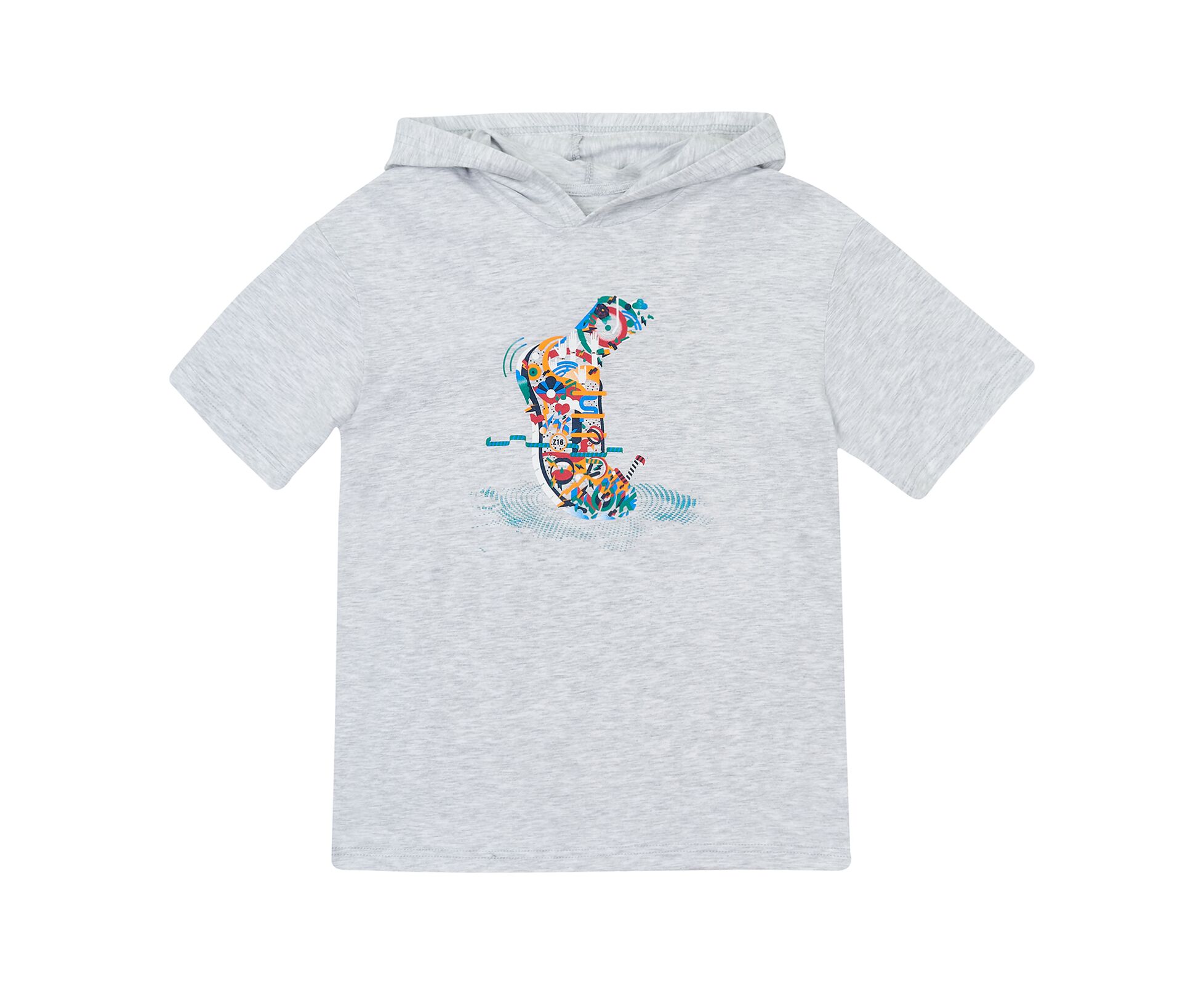 Дитяча футболка з капюшоном з стрейч-куліру кольору морської хвилі (97% бавовна 3% еластан), який добре тримає форму навіть після багаторазового прання. Перед оздоблений стильним принтом. По внутрішньому шву горловини спинки оздоблювальний лампас.