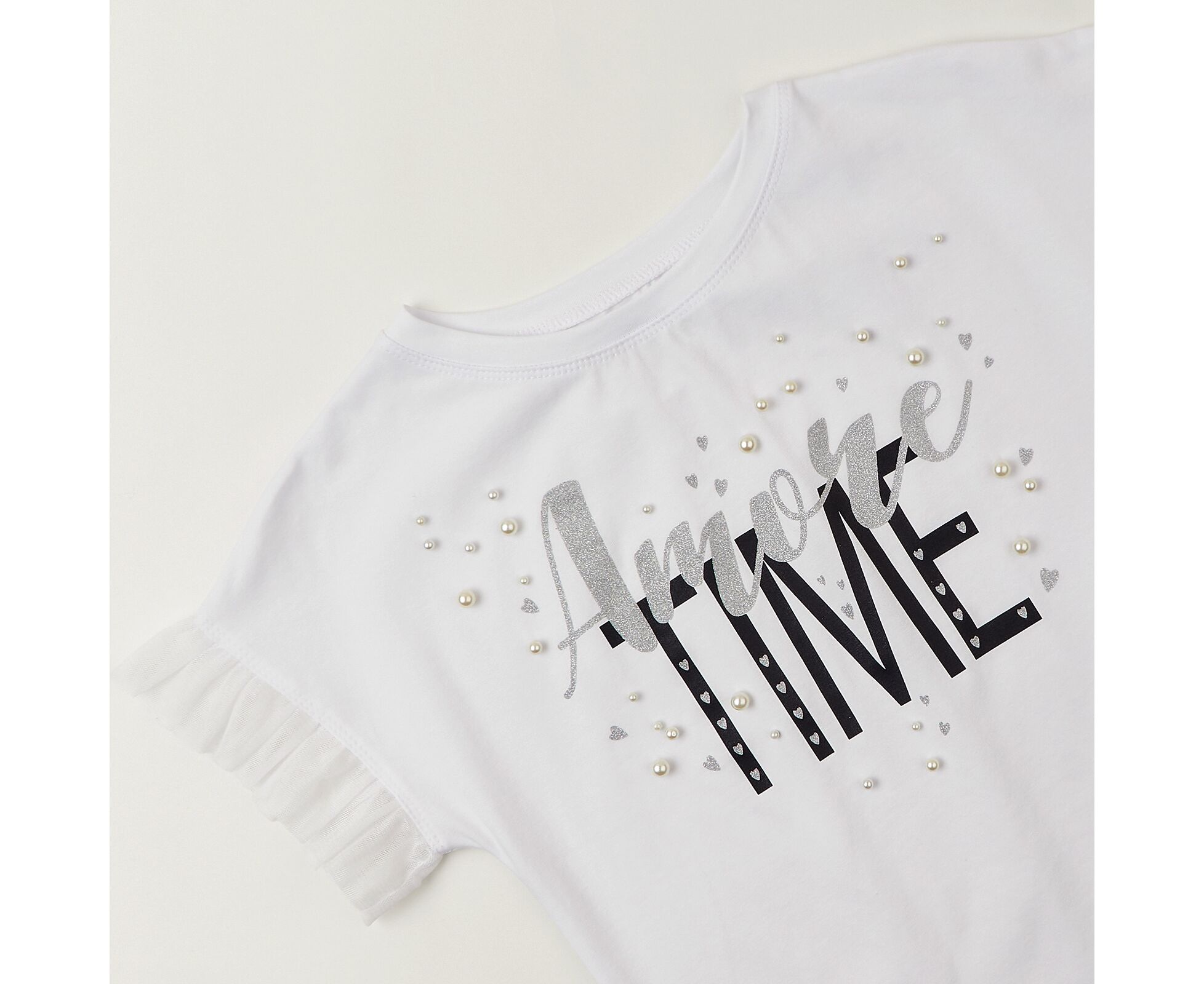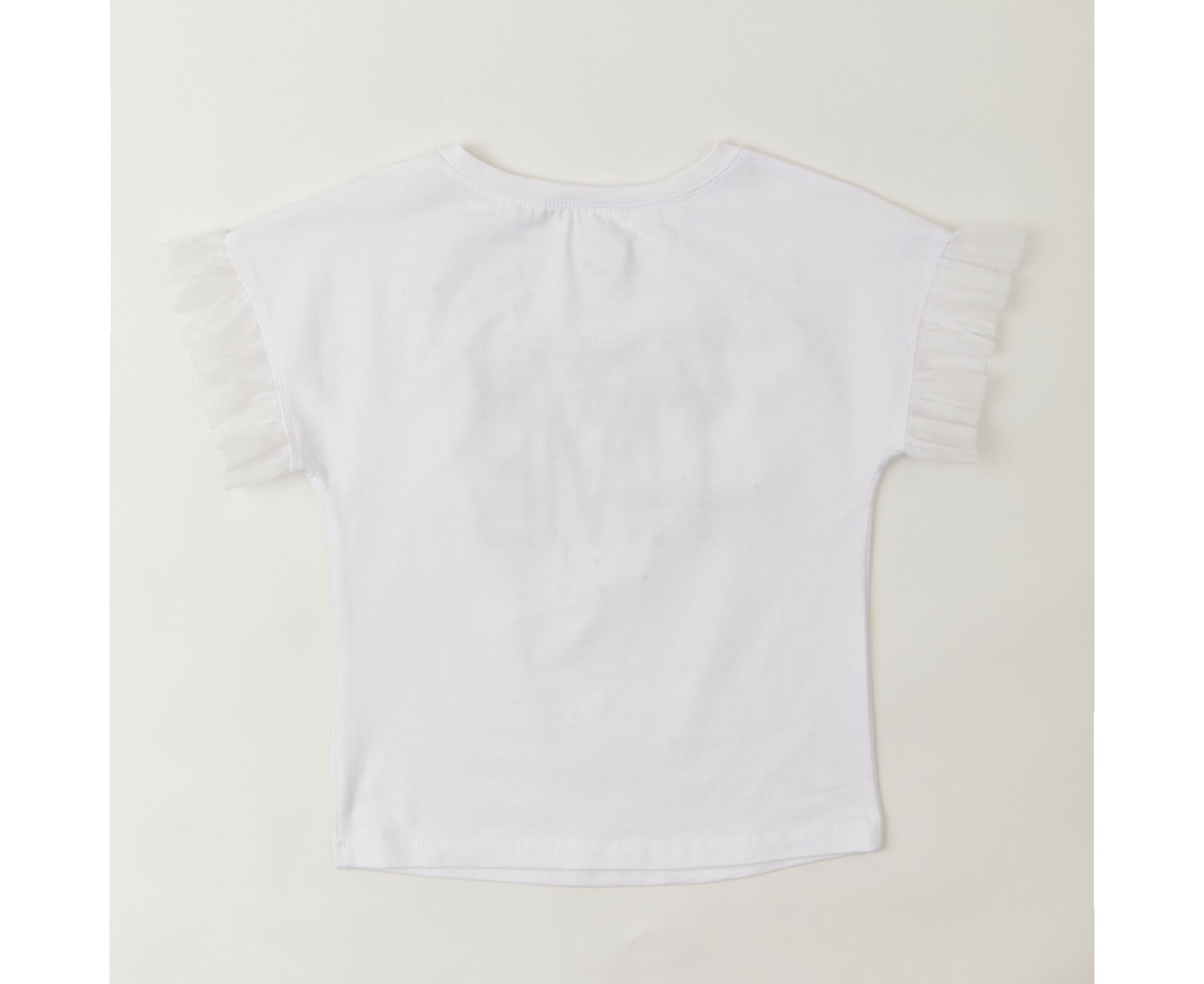 Стильна футболка в романтичному стилі з бавовняної тканини з еластаном. Горловина лодочкою, по низу приспущеного цільнокроєного рукава повітряний рюш із євросітки. На переді друк з сряблястими елементами, оздоблений намистинами-перлинами.