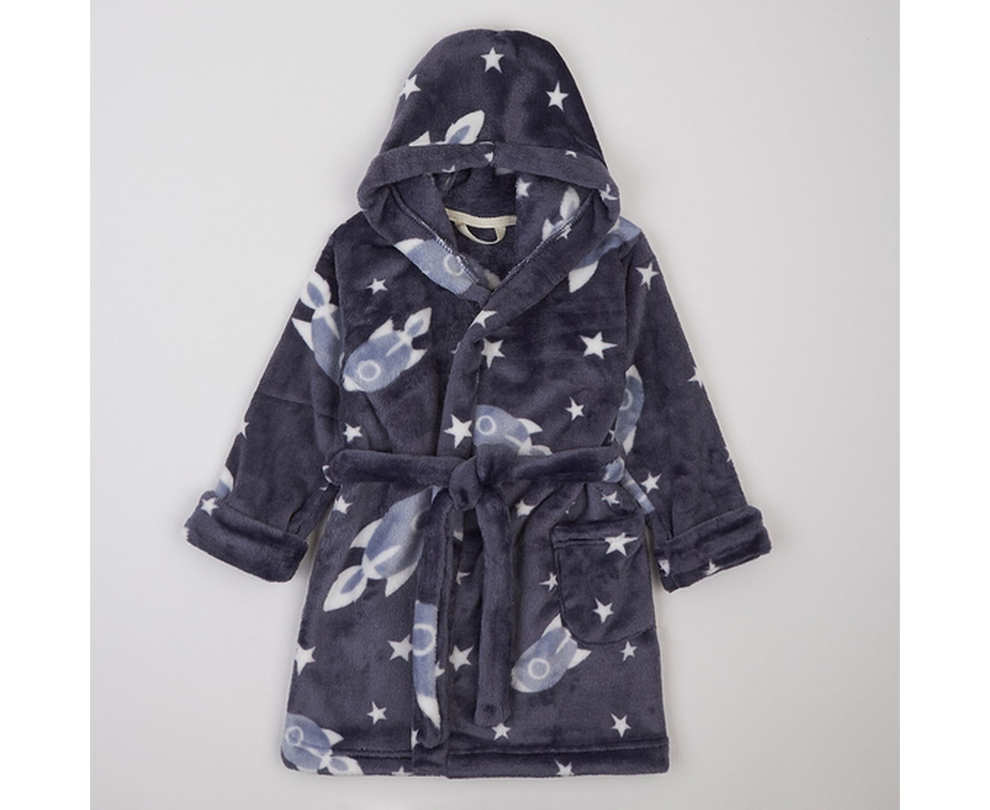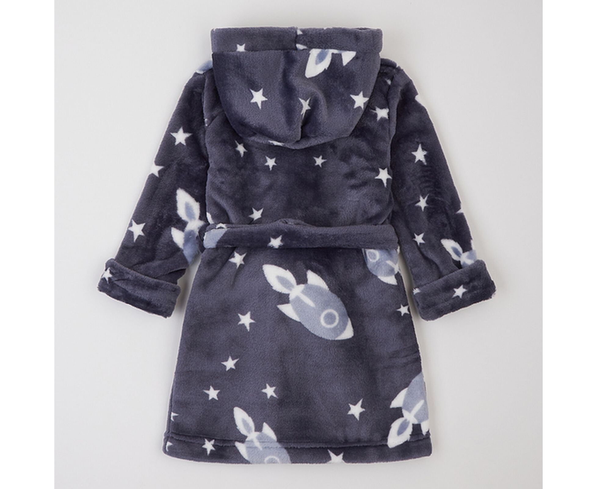 Теплий дитячий халат з каптуром з прикольними декоративними вушками, з м'якого приємного на дотик вельсофту. Шов горловини закритий бавовняною тасьмою, на пілочці накладна кишеня. Пояс продітий через шльовки. Рукава з широкими відворотами.
