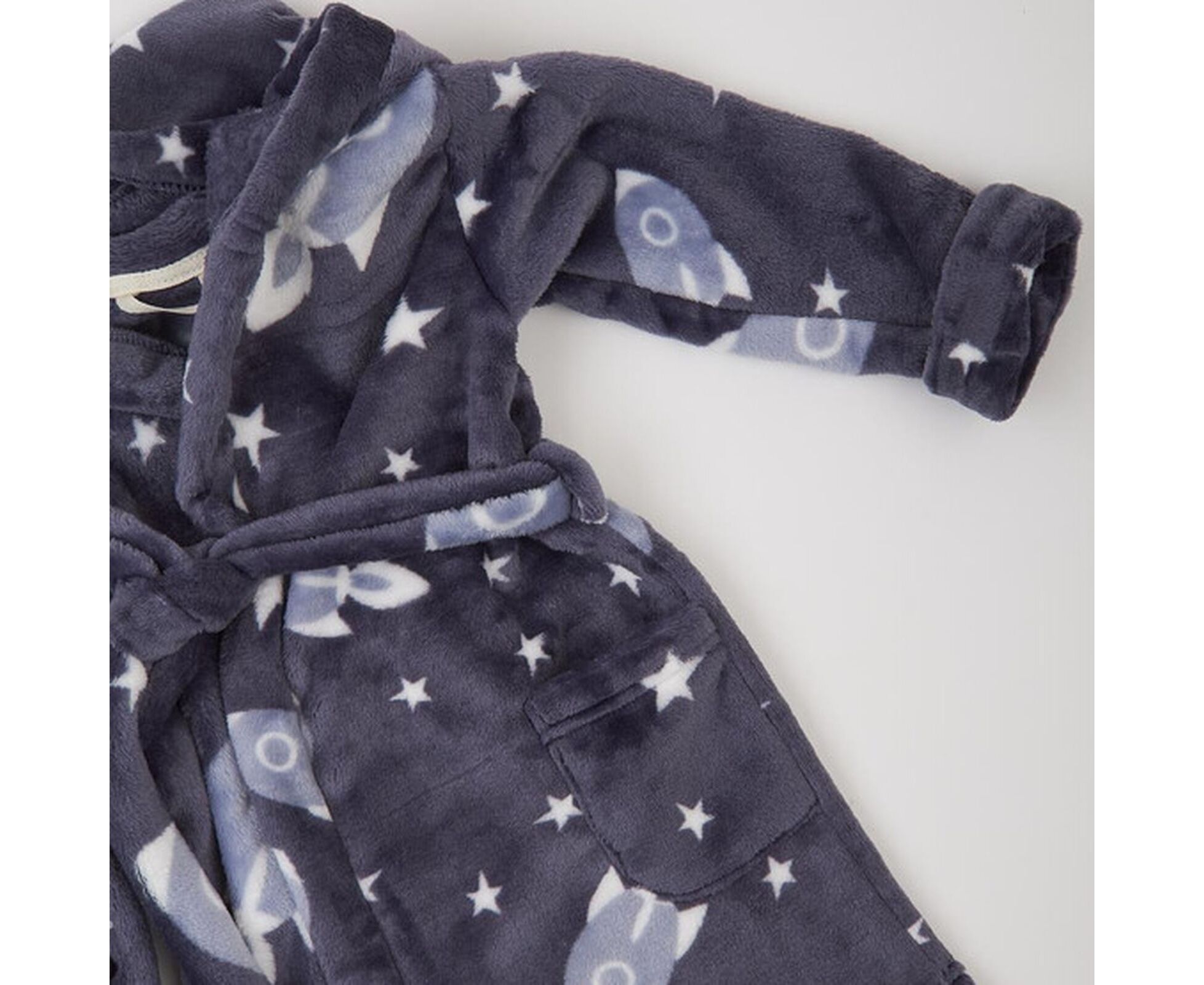 Теплий дитячий халат з каптуром з прикольними декоративними вушками, з м'якого приємного на дотик вельсофту. Шов горловини закритий бавовняною тасьмою, на пілочці накладна кишеня. Пояс продітий через шльовки. Рукава з широкими відворотами.