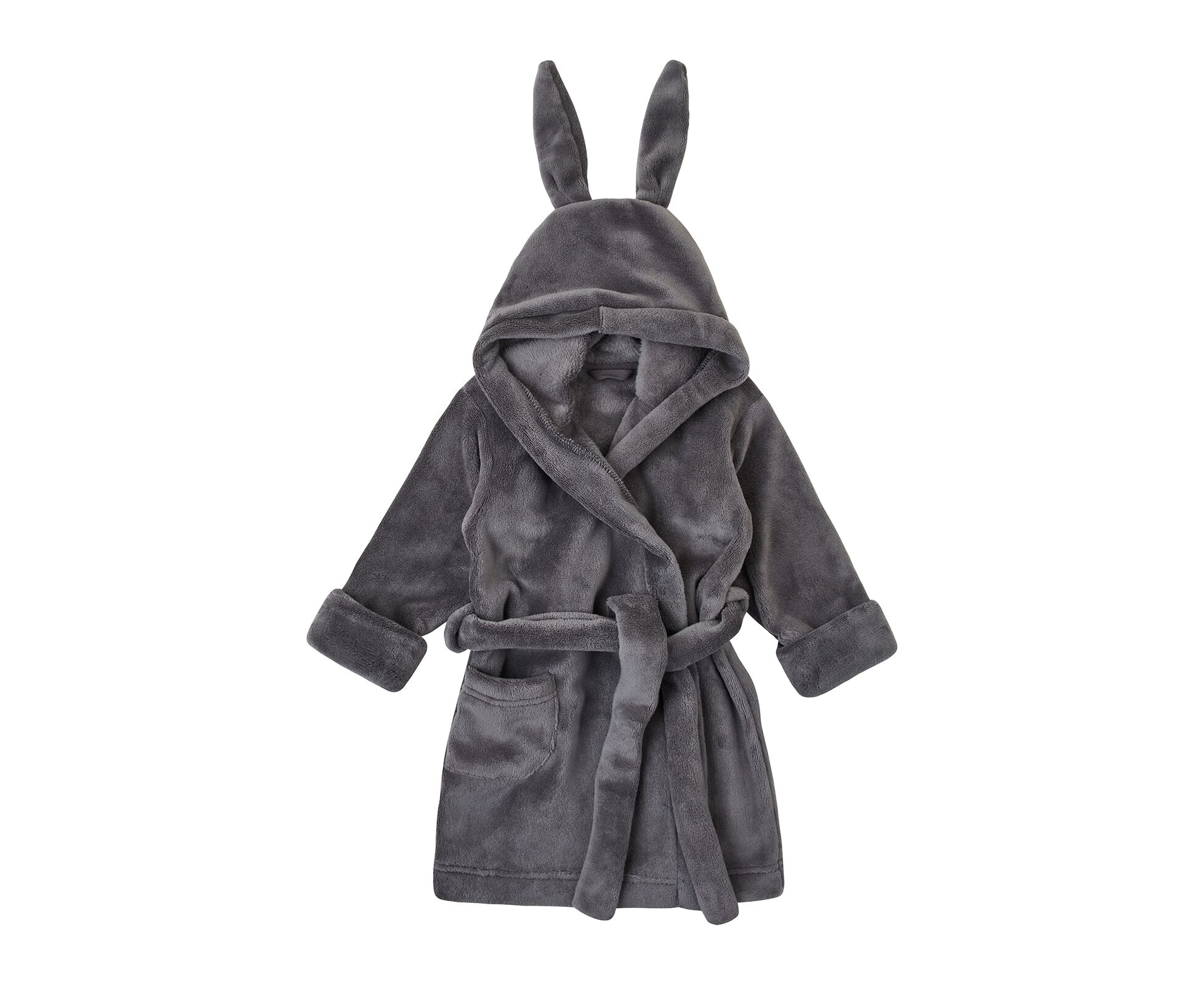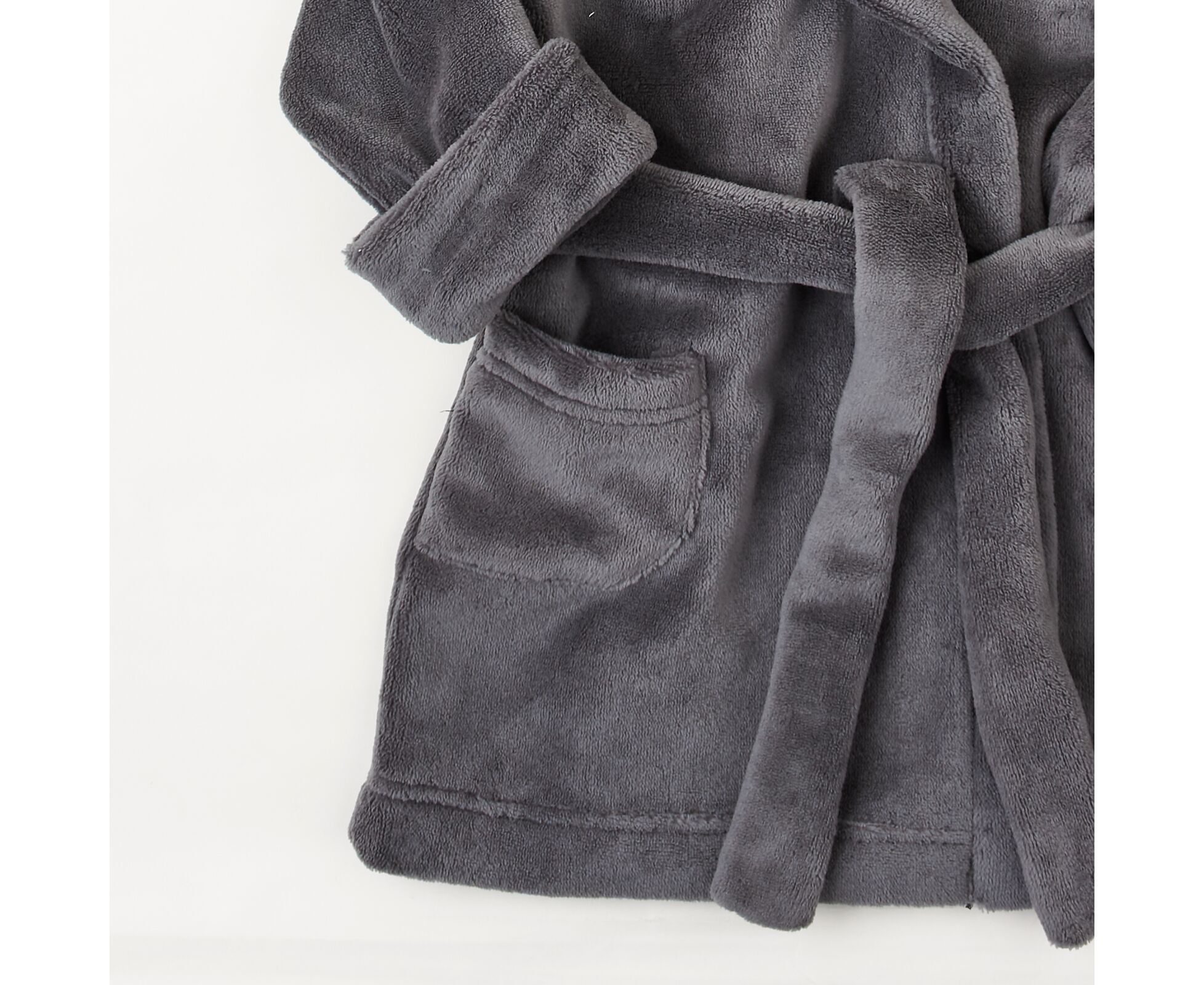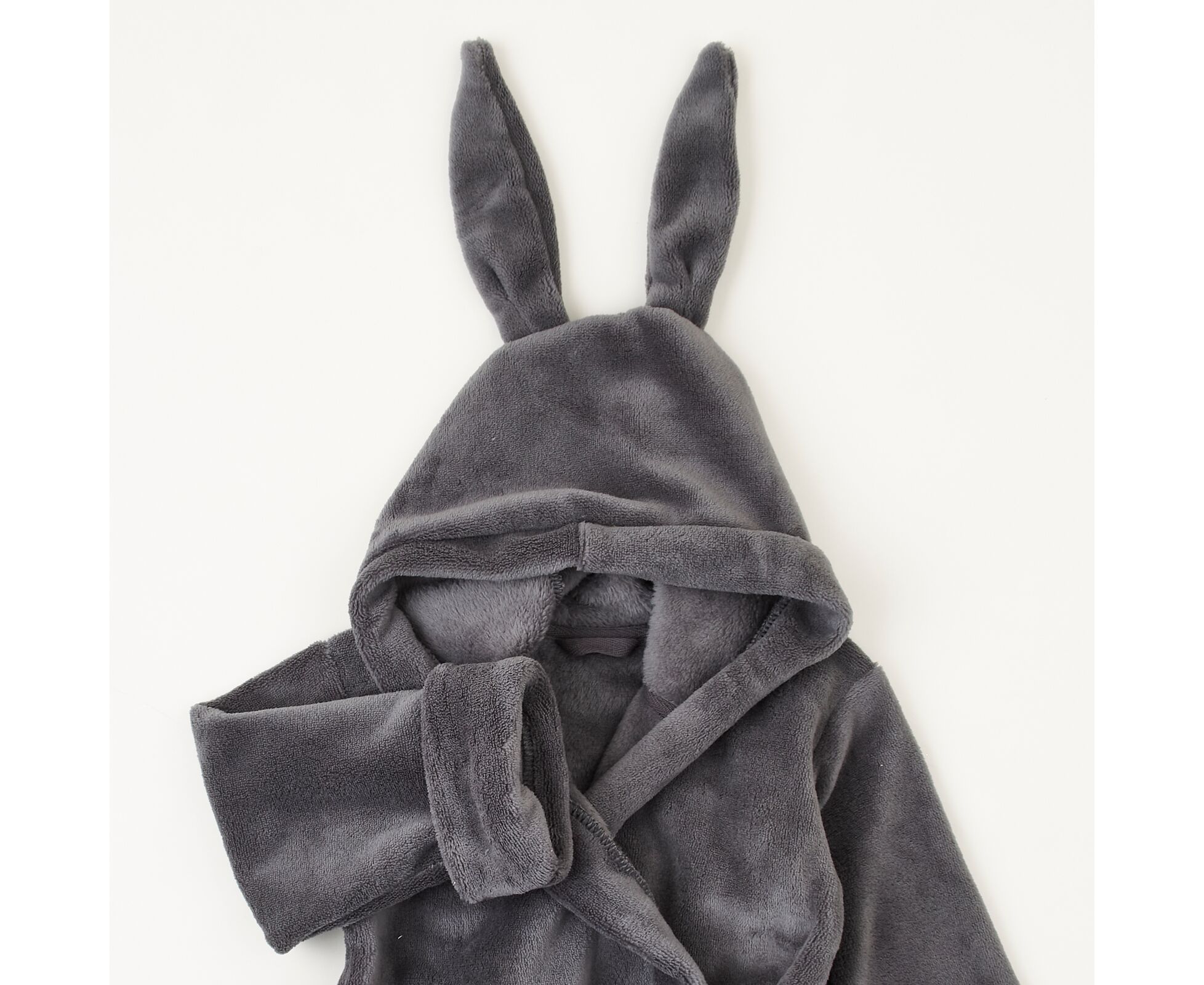 Теплий дитячий халат з каптуром з прикольними декоративними вушками, з м'якого приємного на дотик вельсофту. Шов горловини закритий бавовняною тасьмою, на пілочці накладна кишеня. Пояс продітий через шльовки. Рукава з широкими відворотами.