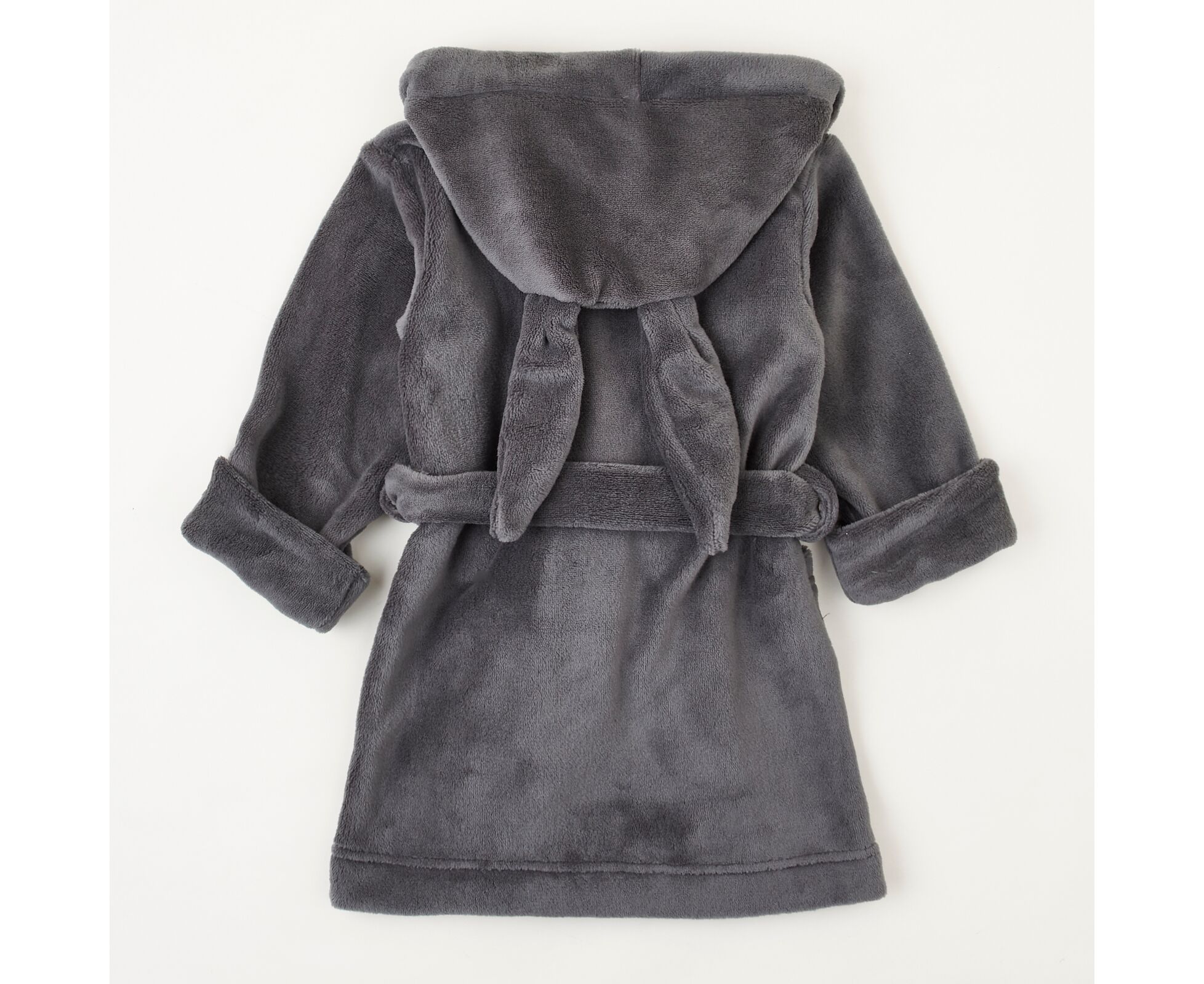 Теплий дитячий халат з каптуром з прикольними декоративними вушками, з м'якого приємного на дотик вельсофту. Шов горловини закритий бавовняною тасьмою, на пілочці накладна кишеня. Пояс продітий через шльовки. Рукава з широкими відворотами.