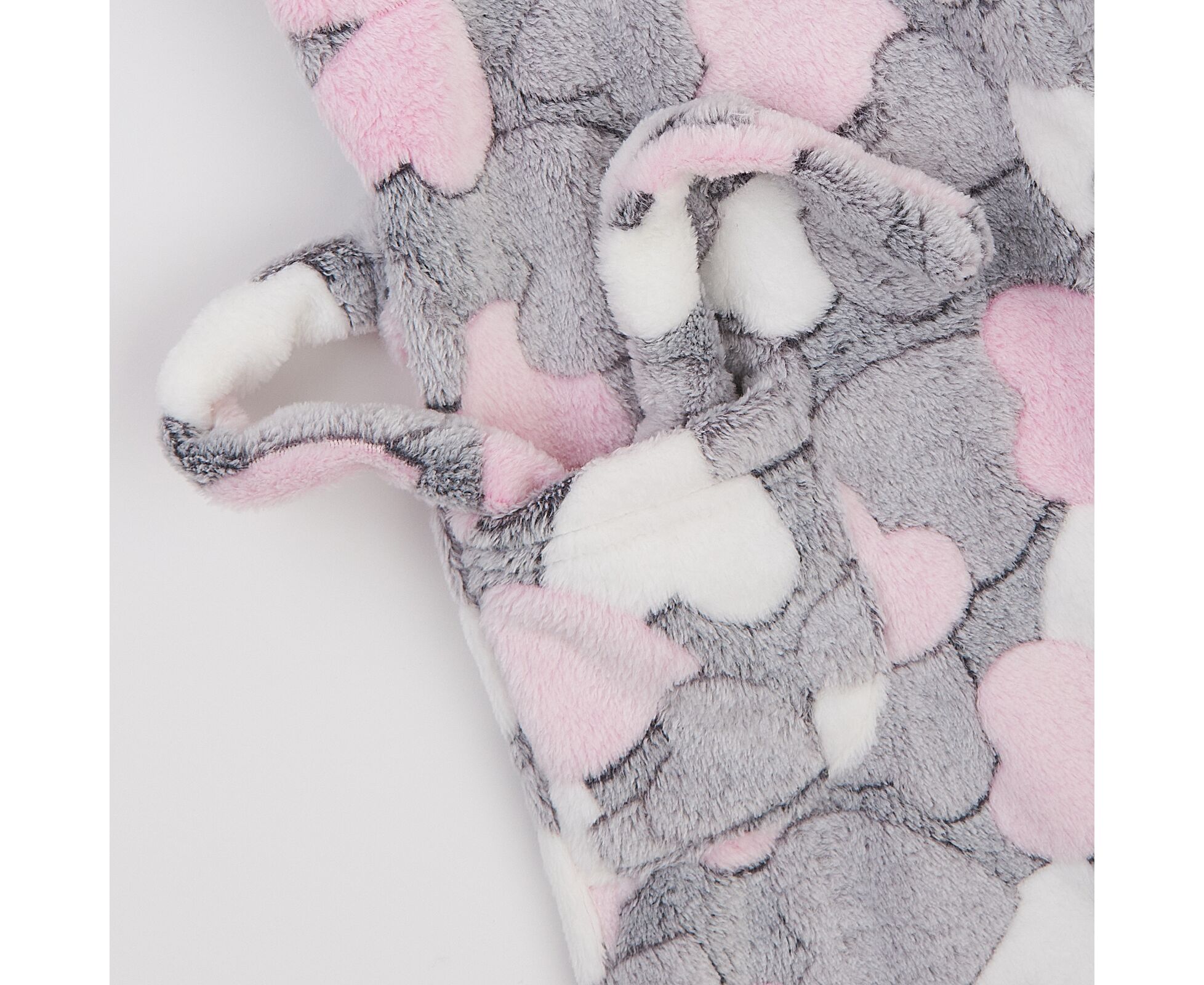 Теплий дитячий халат з каптуром з прикольними декоративними вушками. Виготовлений з м'якого, дуже приємного на дотик вельсофту. Шов горловини закритий бавовняною тасьмою, на пілочці накладна кишеня. Пояс продітий через шльовки. Рукава з широкими відворотами.