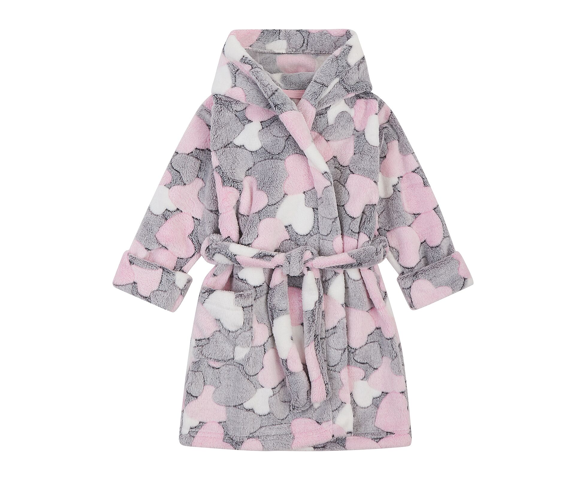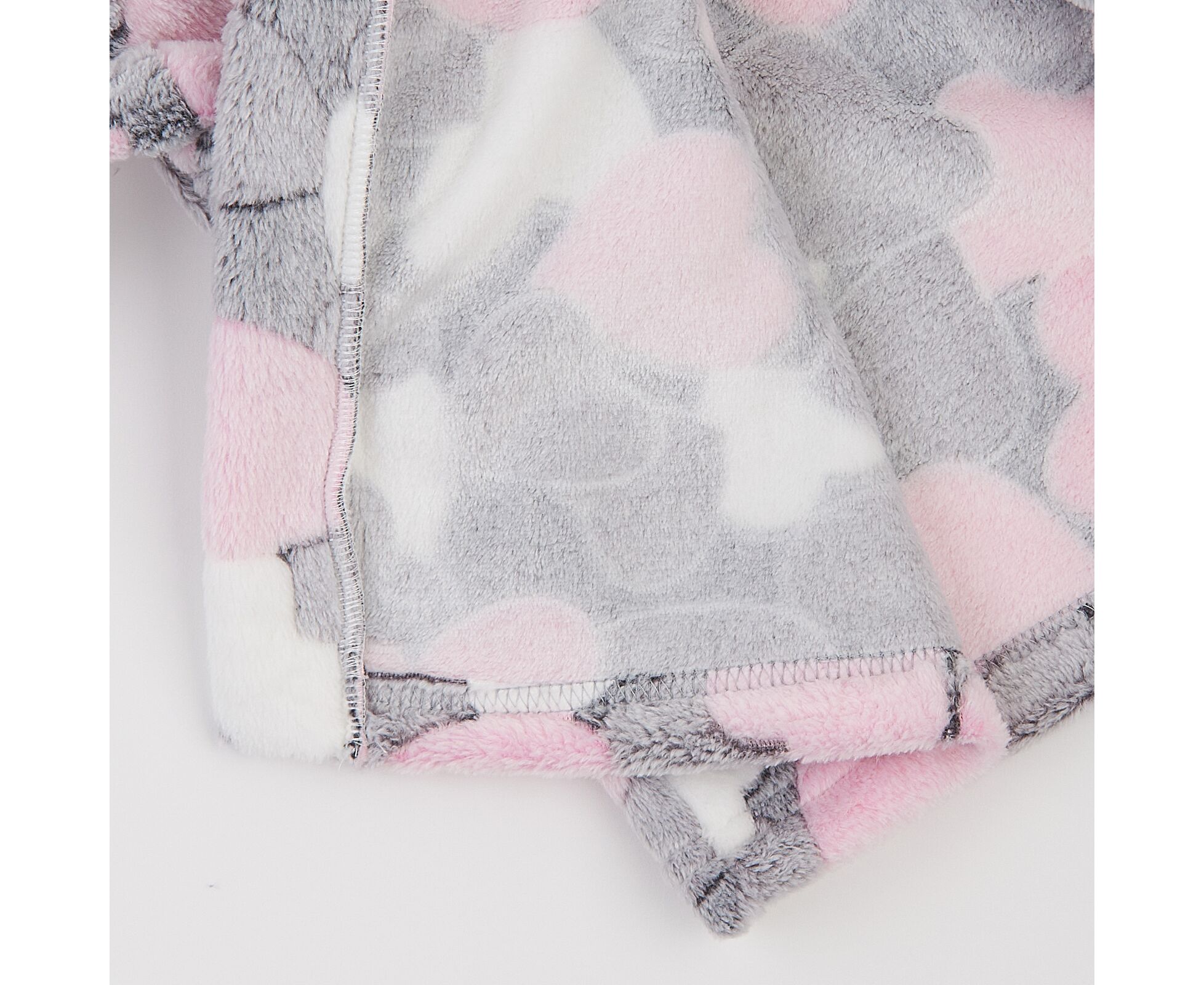 Теплий дитячий халат з каптуром з прикольними декоративними вушками. Виготовлений з м'якого, дуже приємного на дотик вельсофту. Шов горловини закритий бавовняною тасьмою, на пілочці накладна кишеня. Пояс продітий через шльовки. Рукава з широкими відворотами.