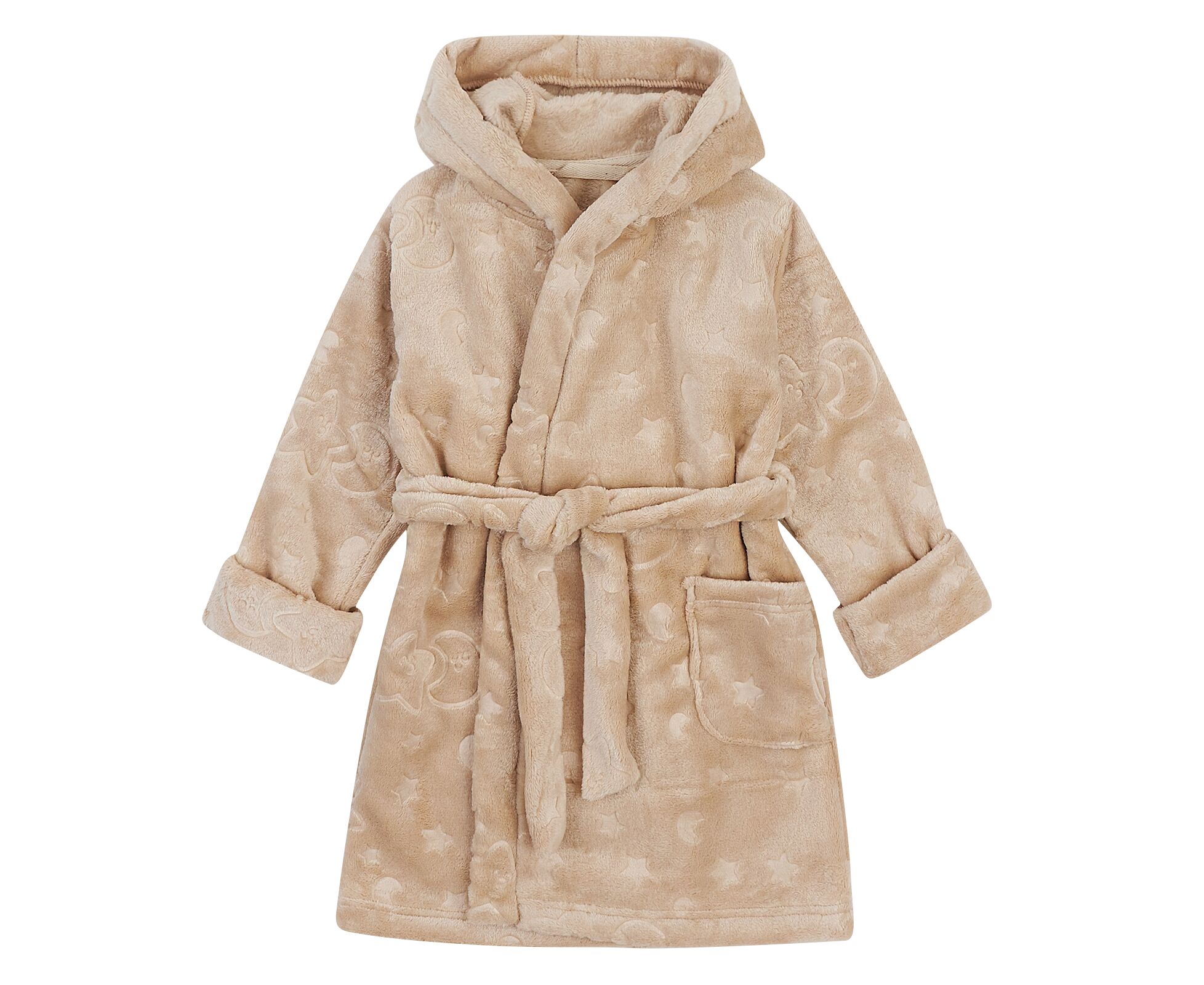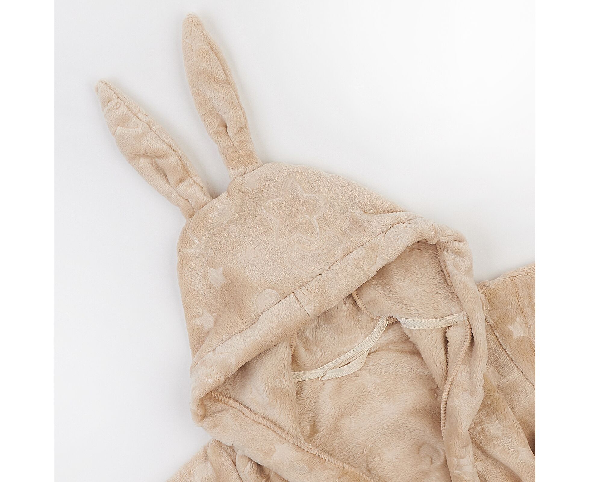 Теплий дитячий халат з каптуром з прикольними декоративними вушками, з м'якого приємного на дотик вельсофту. Шов горловини закритий бавовняною тасьмою, на пілочці накладна кишеня. Пояс продітий через шльовки. Рукава з широкими відворотами.