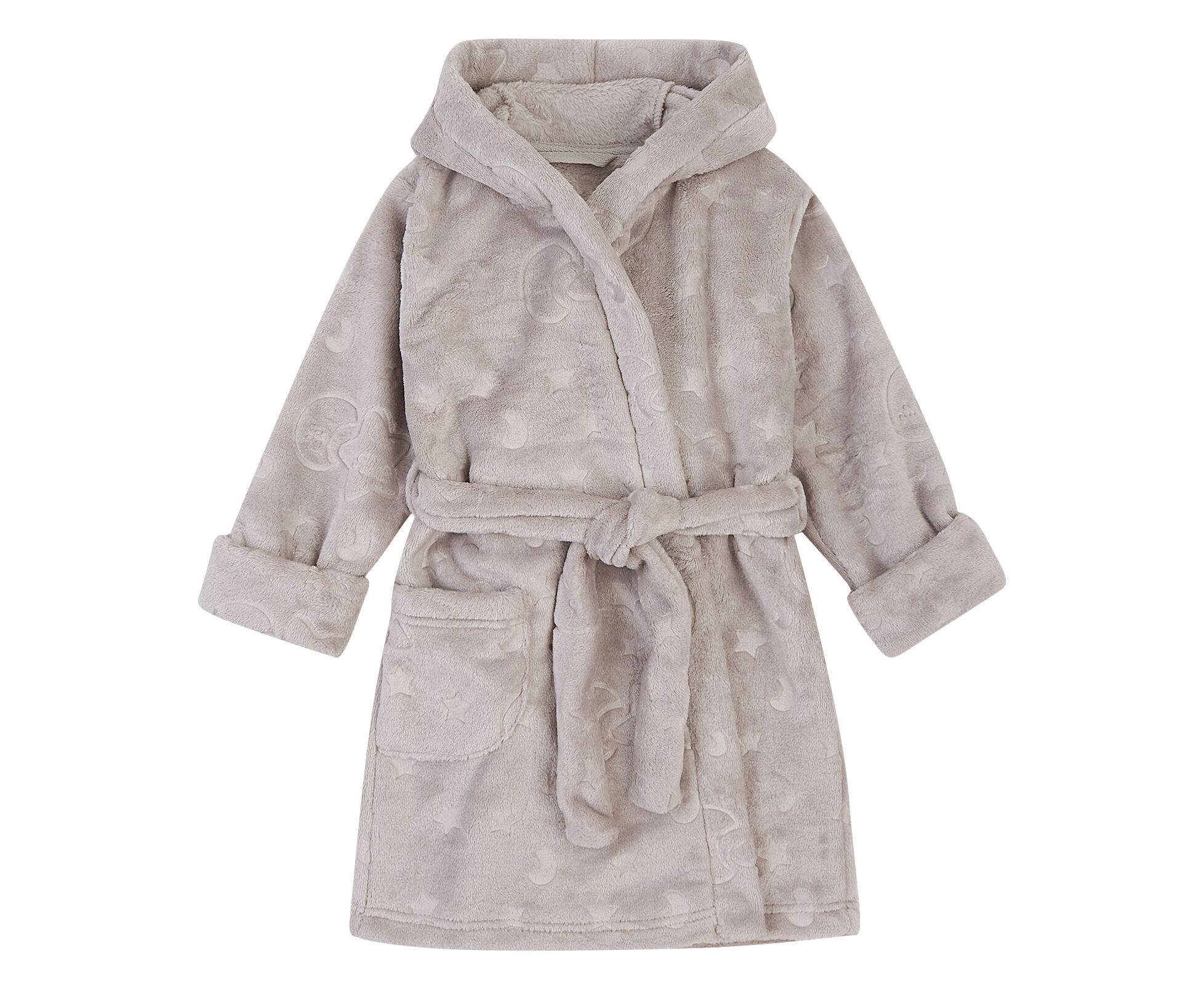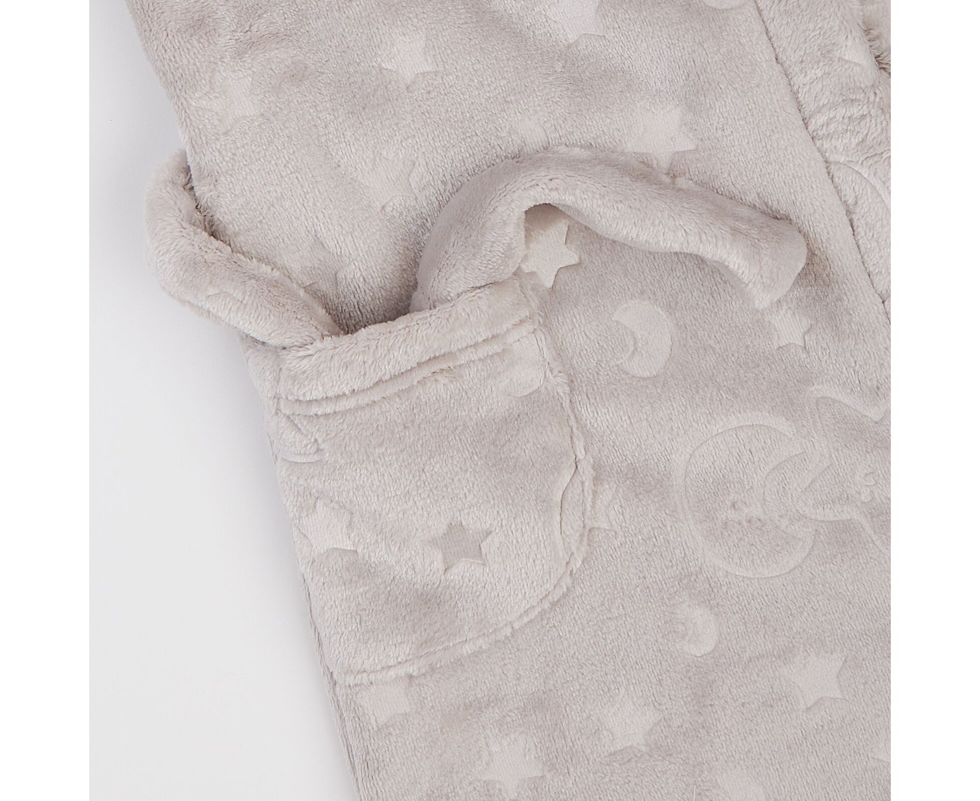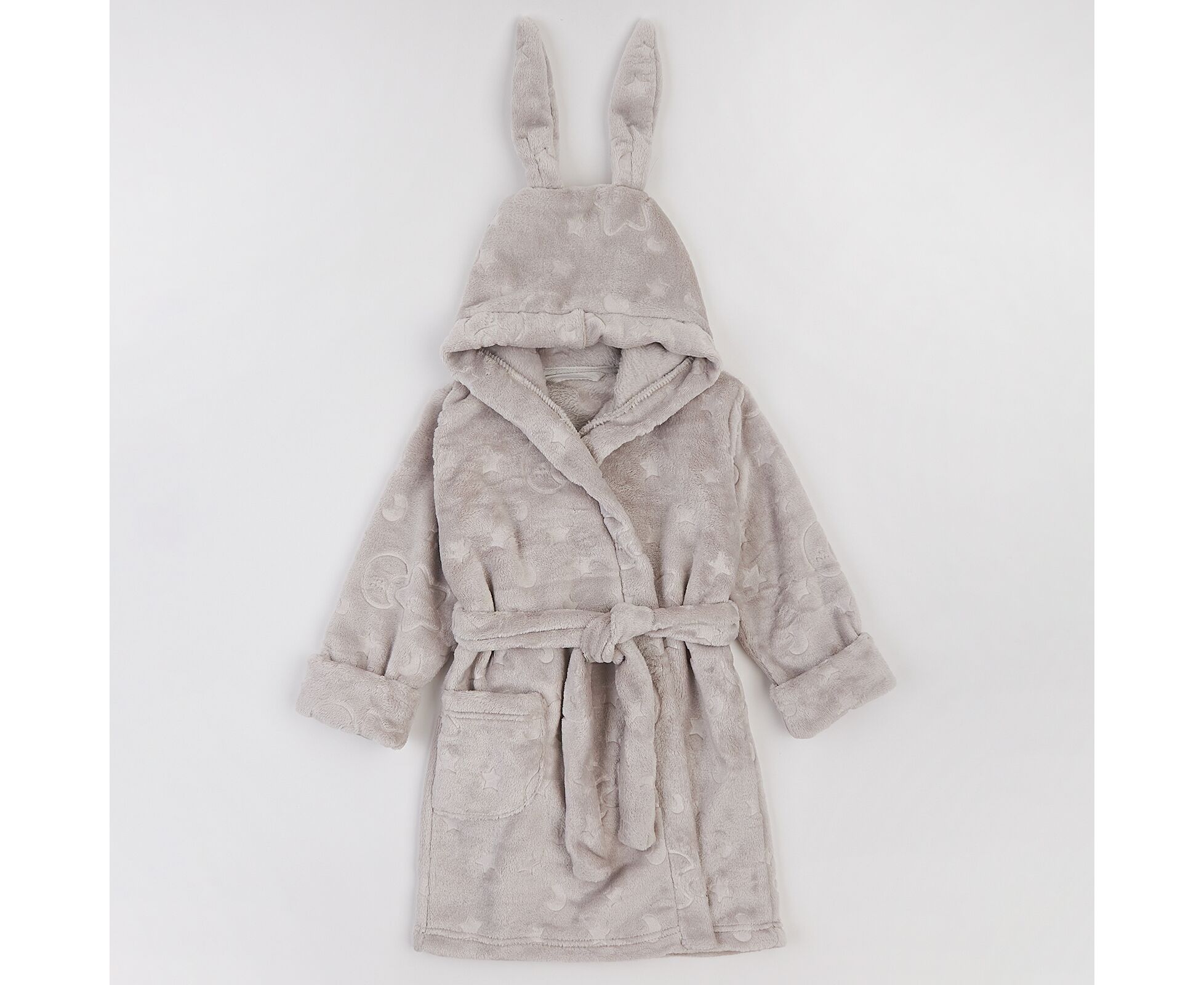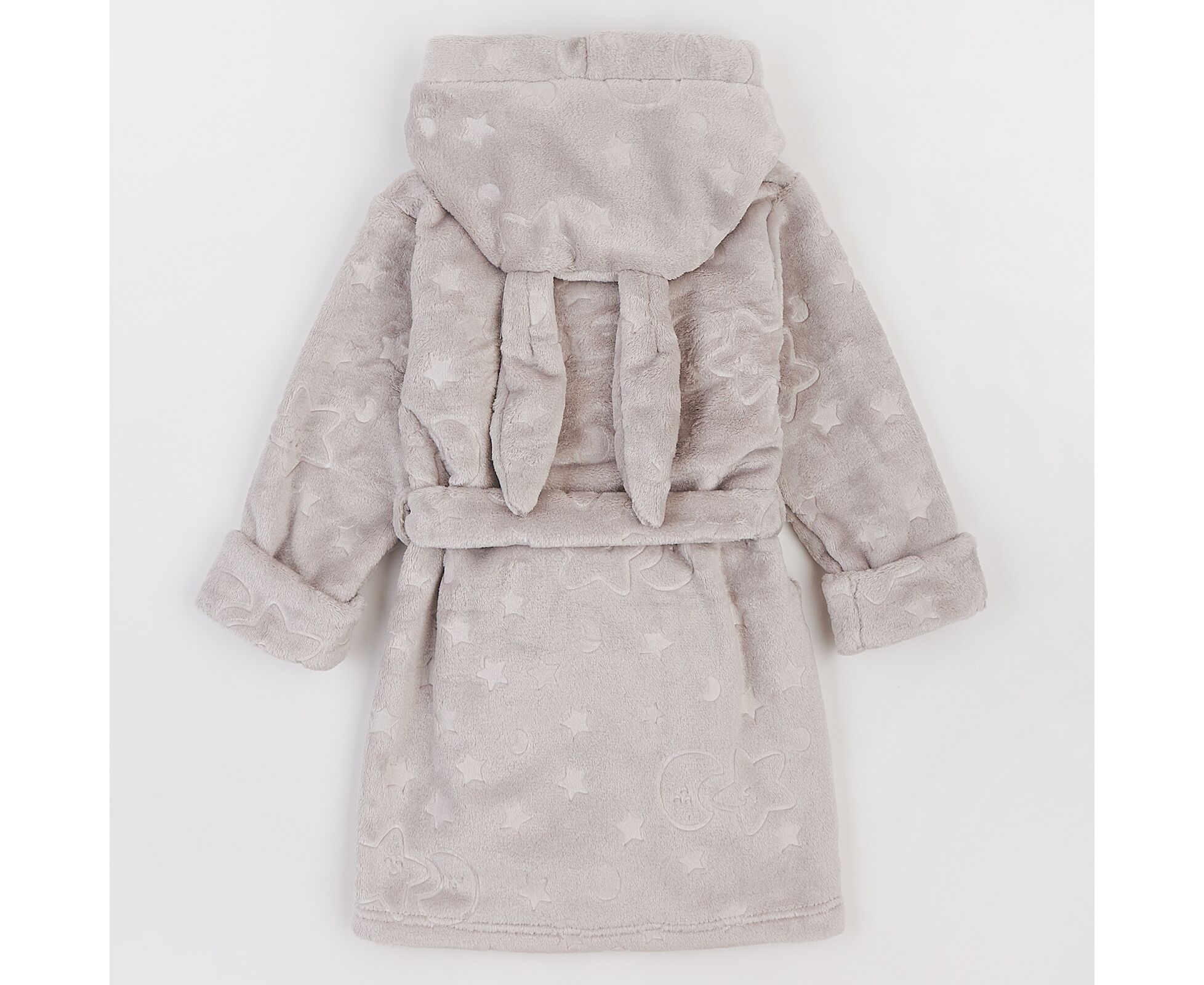 Теплий дитячий халат з каптуром з прикольними декоративними вушками, з м'якого приємного на дотик вельсофту. Шов горловини закритий бавовняною тасьмою, на пілочці накладна кишеня. Пояс продітий через шльовки. Рукава з широкими відворотами.
