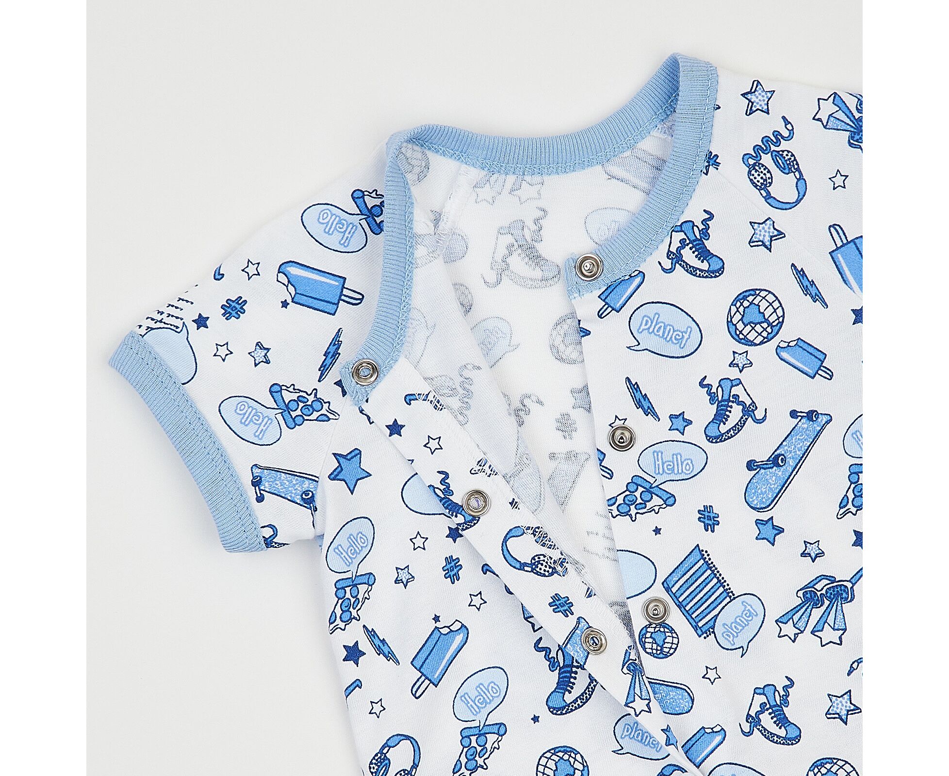 Літній боді для новонароджених з легенкого, приємного на дотик бавовняного куліру.. Боді з центрально застібкою на кнопки по борту та по ніжкам, з рукавом реглан. Низ рукавів та горловина оброблені бавовняною рібаною контрасного кольору.. Натуральний склад полотна виключає будь-який дискомфорт та подразнення у вашого малюка.