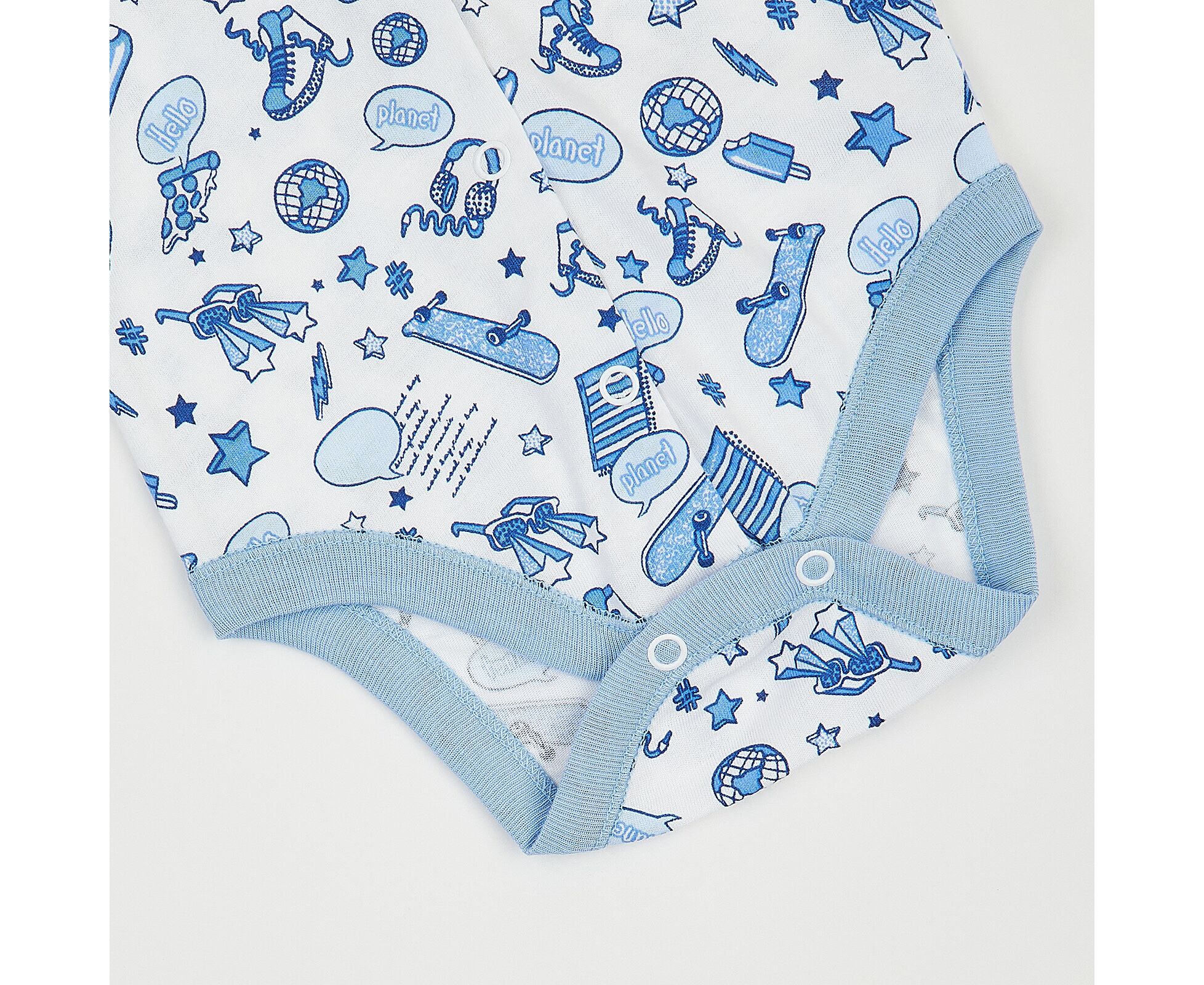Літній боді для новонароджених з легенкого, приємного на дотик бавовняного куліру.. Боді з центрально застібкою на кнопки по борту та по ніжкам, з рукавом реглан. Низ рукавів та горловина оброблені бавовняною рібаною контрасного кольору.. Натуральний склад полотна виключає будь-який дискомфорт та подразнення у вашого малюка.