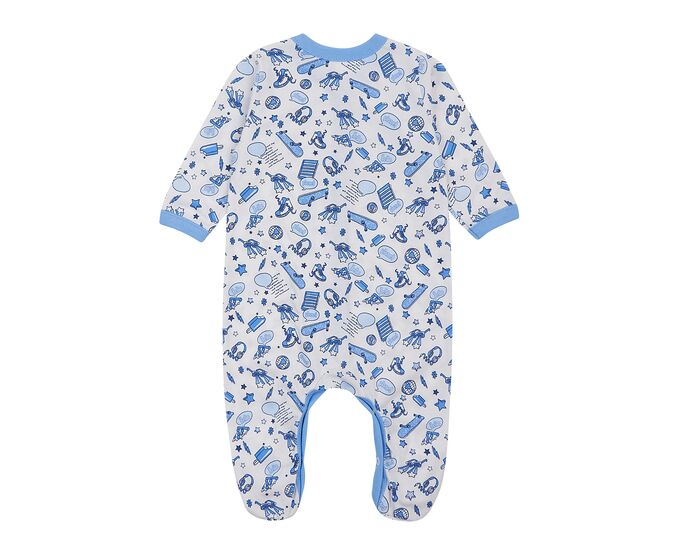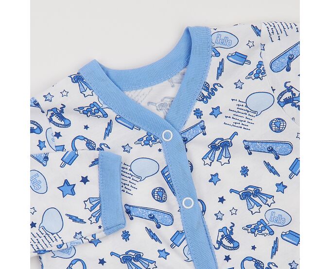 Літній легенький чоловічок для новонародженого, з наздвичайно м'якого, тоненького, приємного на дотик 100% бавовняного набивного куліру. Чоловічок з центральною застібкою на кнопки по борту та по ніжкам, з рукавом реглан, Зрізи застібки та низки рукавів оброблені окантовкою з бавовняної рібани контрасного кольору.