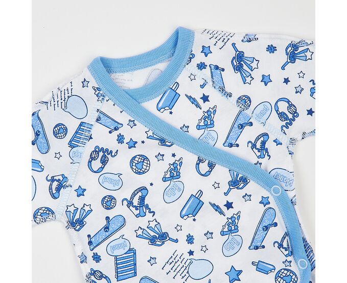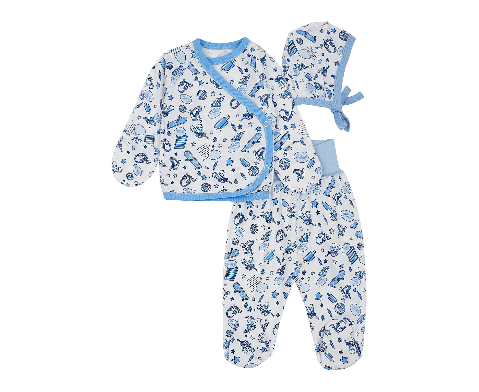 Літній комплект для новонароджених з легенкого, приємного на дотик бавовняного куліру.. Складається з льолі, повзунків та чепчику. Льоля з запахом, з застібкою на кнопки, з рукавом реглан, з цільнокроєною рукавичкою по низу, яка дозволяє ручкам вашого малюка бути як відкритими, так і закритими з метою його безпеки .Повзунки з пласкими середніми швами, з поясом з еластичної рібани. Чепчик із зав'язками під підборіддям. Модель чепчику з чотирьох деталей, що забезпечує щільність прилягання виробу. Натуральний склад полотна та шви назовні в усіх виробах комплекту, які не торкаються шкіри малюка, виключають будь-який дискомфорт та подразнення.