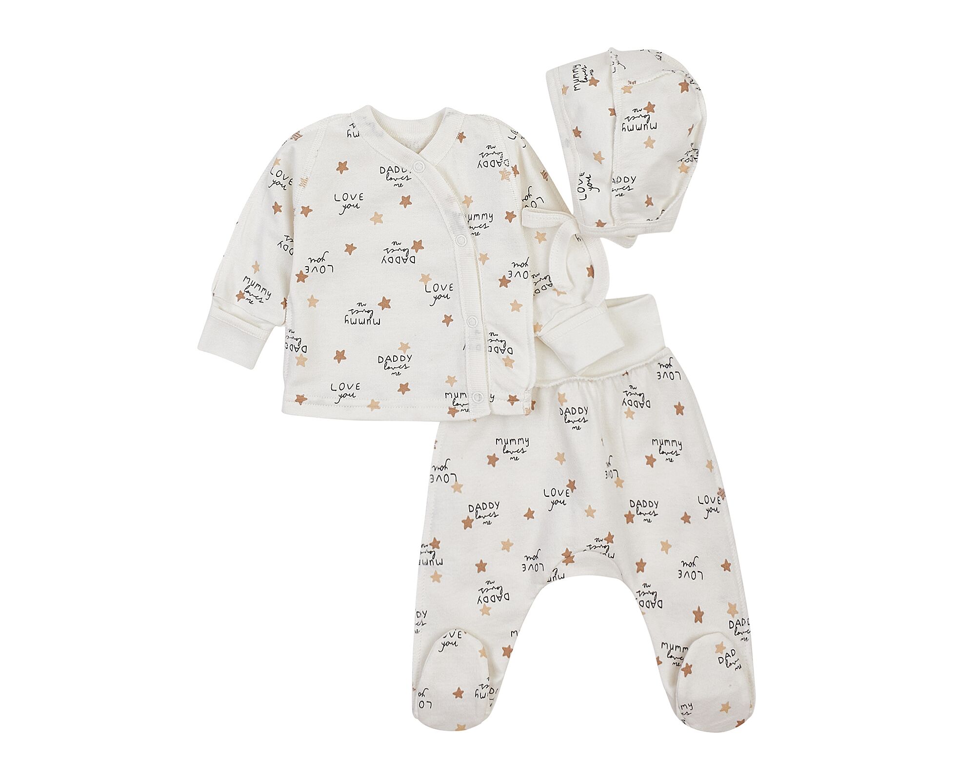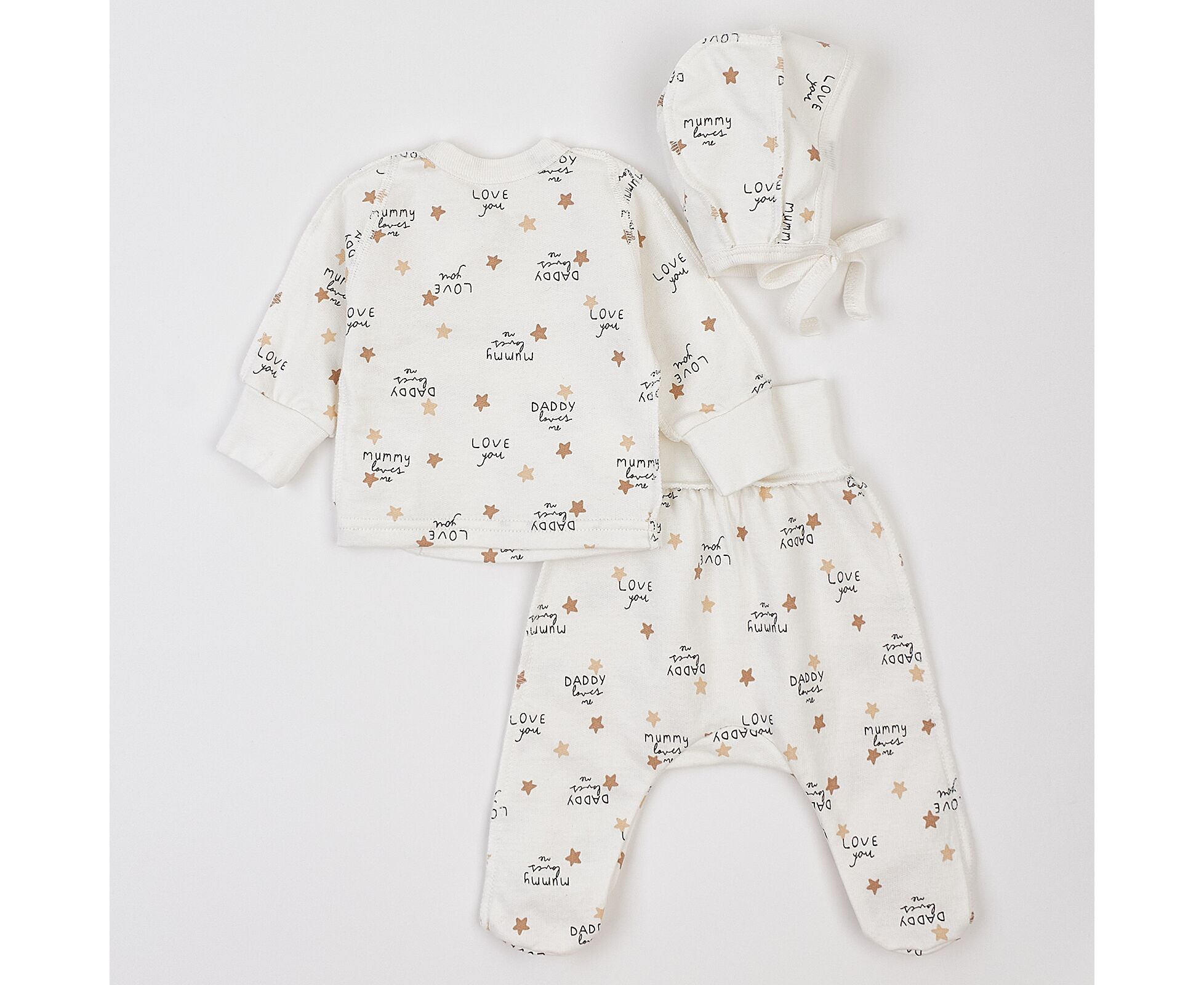Тепленький комплект для новонароджених з м'якого, приємного на дотик футеру з начосом. Складається з льолі, повзунків та чепчику. Льоля з асиметричною застібкою на кнопки на запах. Рукав реглан, манжети льолі з еластичної рібани та з відворотом, що дозволяє перетворити їх в царапки. Повзунки з ластовицею, без середніх швів, з поясом з еластичної рібани. Чепчик із зав'язками під підборіддям. Модель чепчику з чотирьох деталей, що забезпечує щільність прилягання виробу. Натуральний склад полотна та шви назовні в усіх виробах комплекту, які не торкаються шкіри малюка, виключають будь-який дискомфорт та подразнення.
