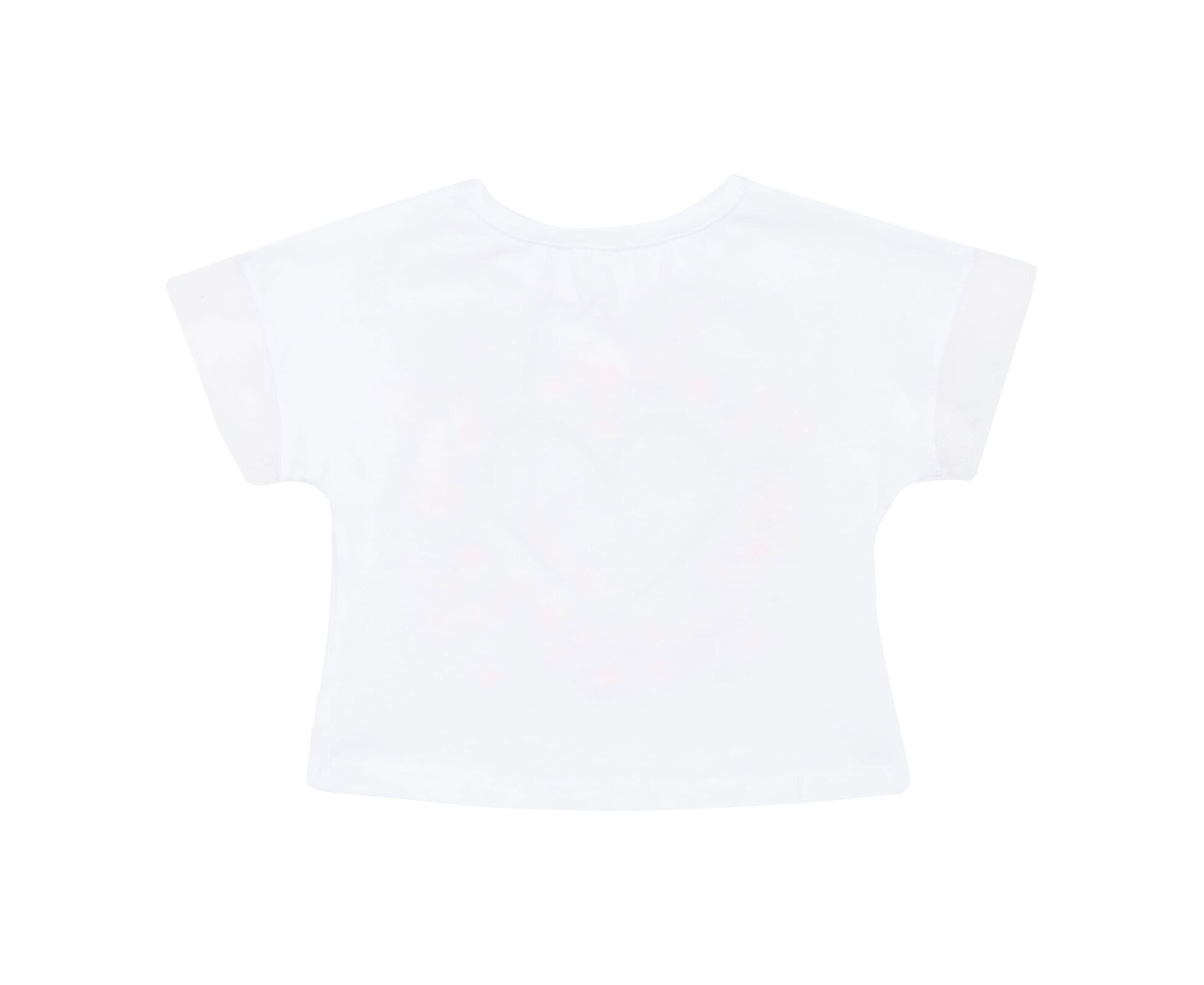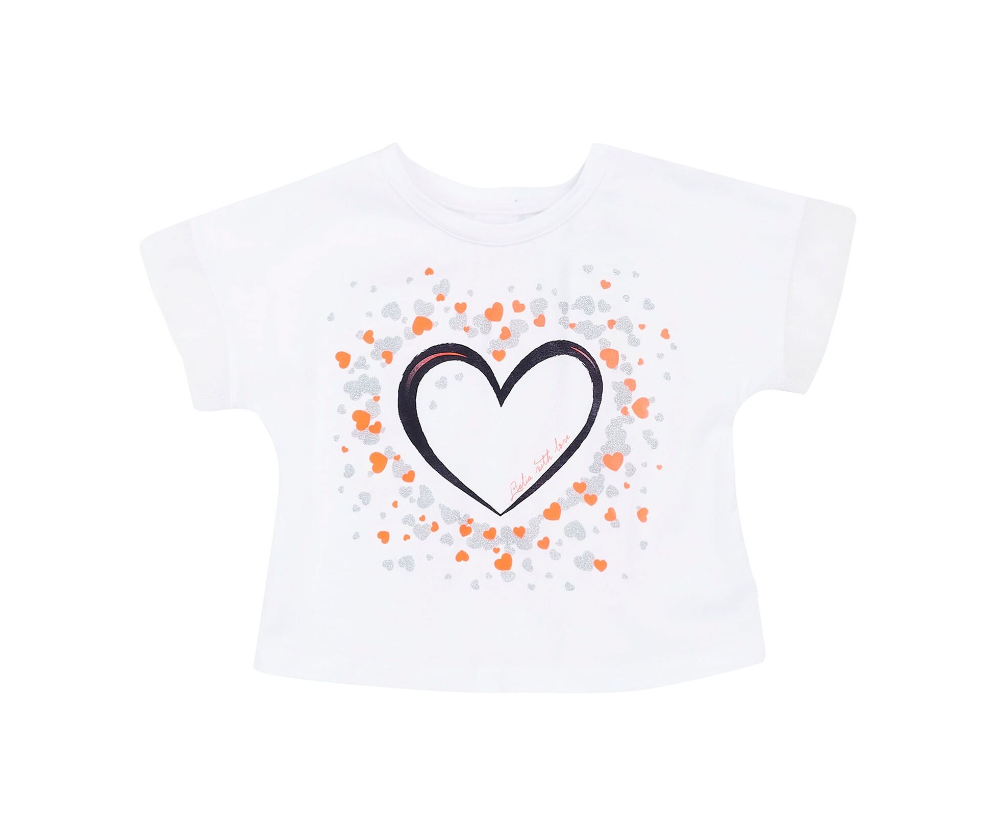 Літній комплект для дівчинки, з футболки та шорт, з якісного стрейч-куліру, який добре тримає колір та форму навіть після багаторазового прання. Футболка зі стильним принтом з блискучими елементами на переді , з спущеним плечем та рукавом-рюшею з м'якої еластичної євросітки. Шорти з притачним поясом з резинкою, з боковими кишенями, з фігурною лінією низу, оздобленою декоративними деталями з приємної м'якої еластичної євросітки..