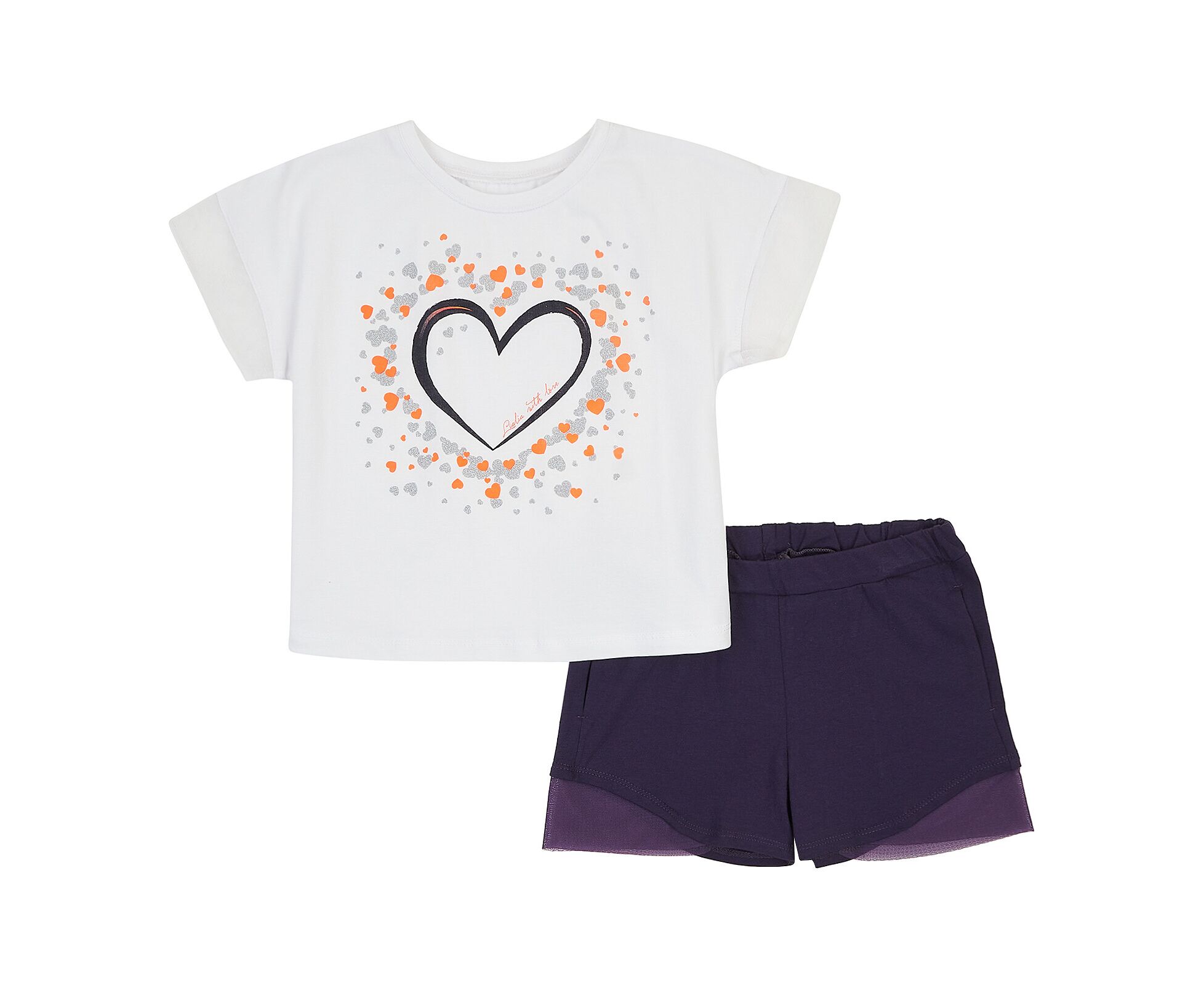Літній комплект для дівчинки, з футболки та шорт, з якісного стрейч-куліру, який добре тримає колір та форму навіть після багаторазового прання. Футболка зі стильним принтом з блискучими елементами на переді , з спущеним плечем та рукавом-рюшею з м'якої еластичної євросітки. Шорти з притачним поясом з резинкою, з боковими кишенями, з фігурною лінією низу, оздобленою декоративними деталями з приємної м'якої еластичної євросітки..