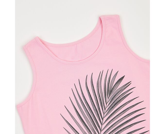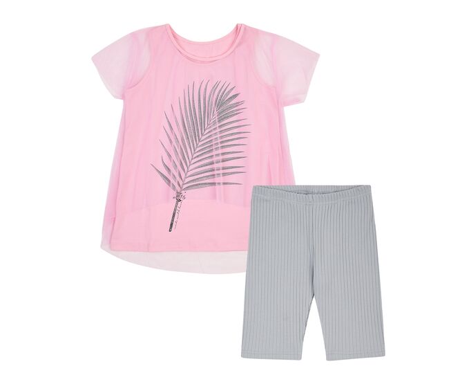 Комплект для дівчинки, з подовженої майки з накидкою та шортів-велосипедок. Майка виготовлена з якісного стрейч-куліру, знімна накидка - з м'якої еластичної напівпрозорої євросітки, велосипедки - з приємного на дотик стрейч-куліру з фактурою рубчику. Майка з стильним принтом на переді, горловина та пройми окантовані руликом. Накидка вільного широкого крою, з необробленими зрізами. Круглий визір горловини окантований руликом. Велосипедки до колін, з цільнокроєним поясом з застроченою гумкою, добре облягають фігуру, не сковують рухи дитини.