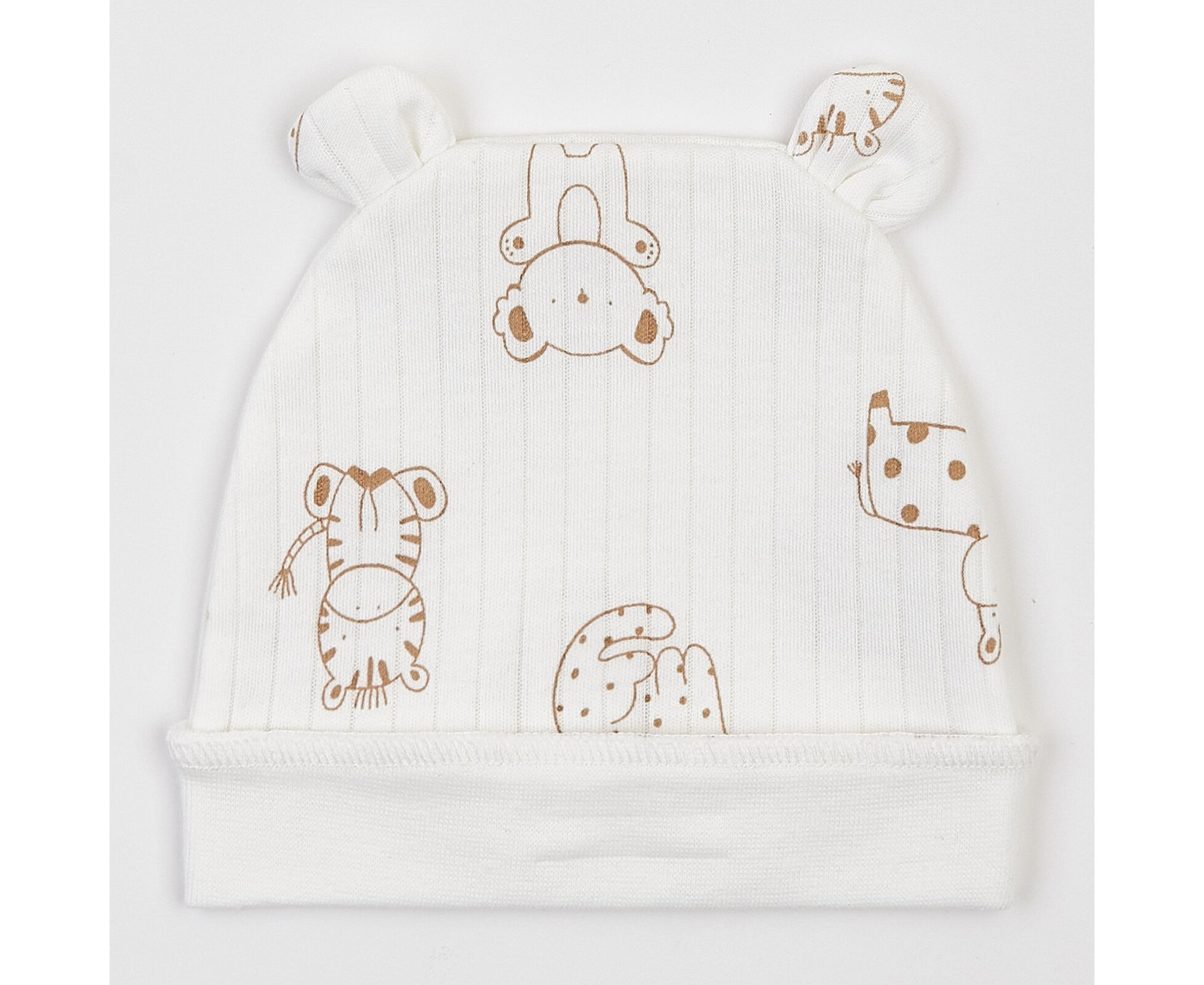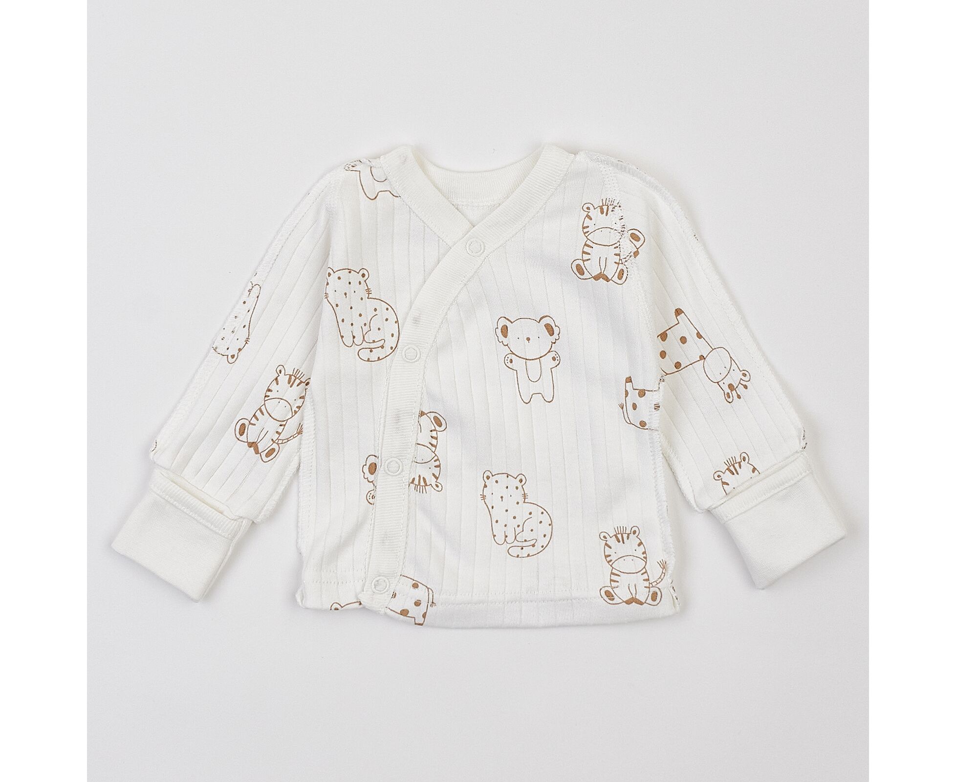 Дитячий комплект для новонароджених. Складається з льолі, повзунків та шапочки. Виготовлений з бавовняного інтерлока преміум якості. Льоля з асиметричною застібкою на кнопки на запах. Зрізи льолі оброблені окантовкою з бавовняної рібани. Рукав реглан, манжети льолі з еластичної рібани та з відворотом, що дозволяє перетворити їх в царапки. Повзунки з ластовицею, без середніх швів, з поясом з еластичної рібани. Шапочка з симпатичними вушками та відворотом по низу з еластичного полотна. Натуральний склад полотна та шви назовні в усіх виробах комплекту, які не торкаються шкіри малюка, виключають будь-який дискомфорт та подразнення.