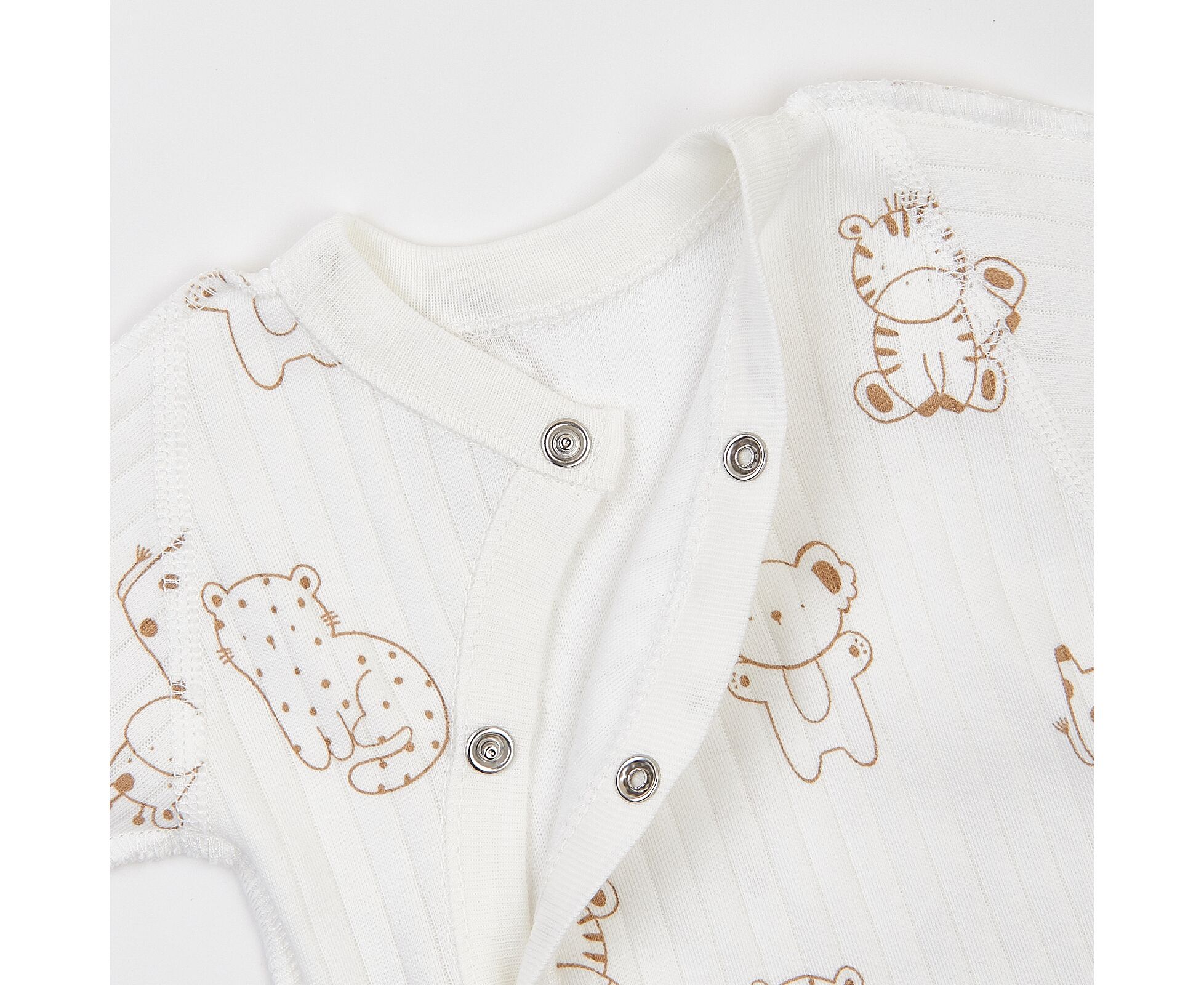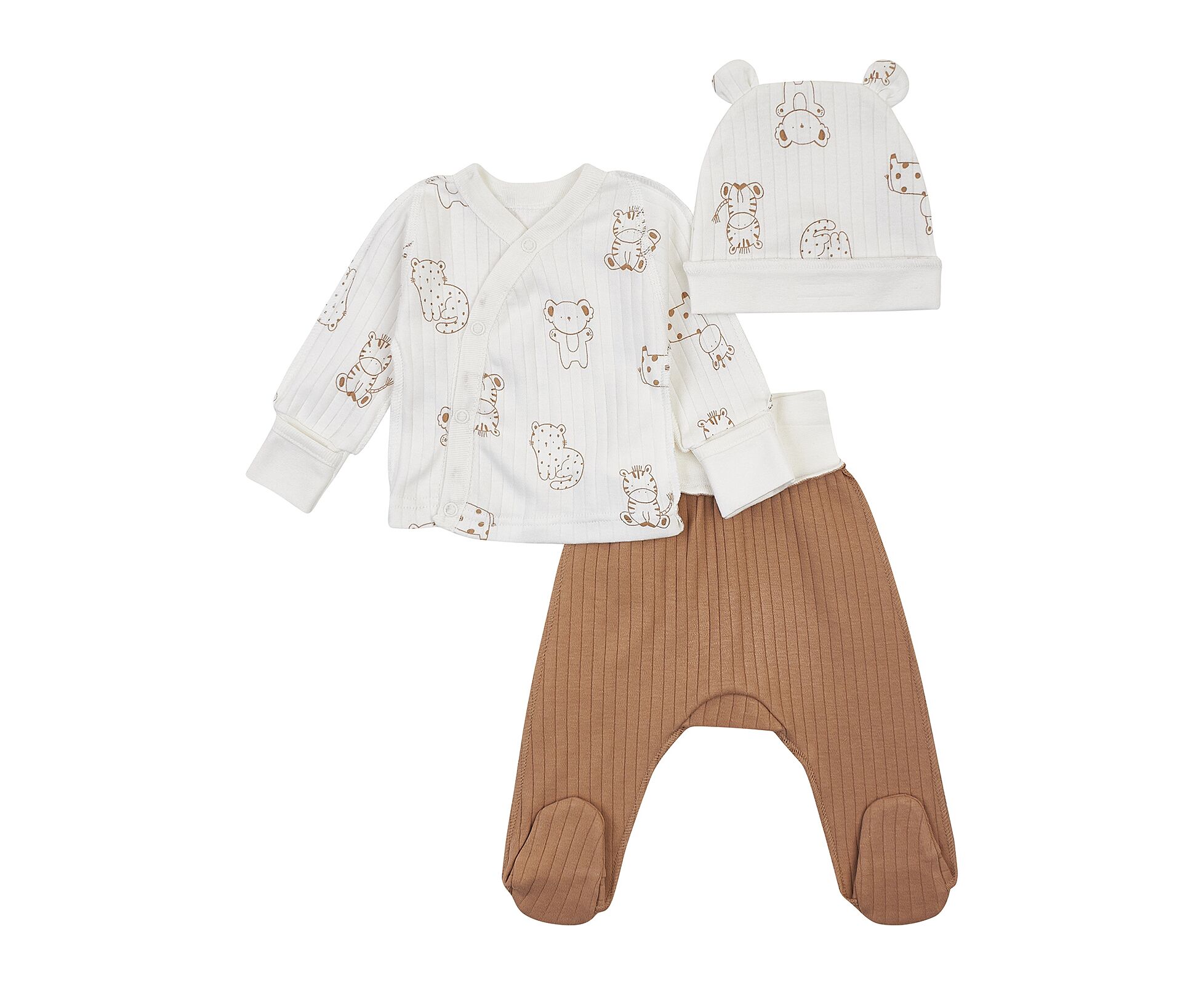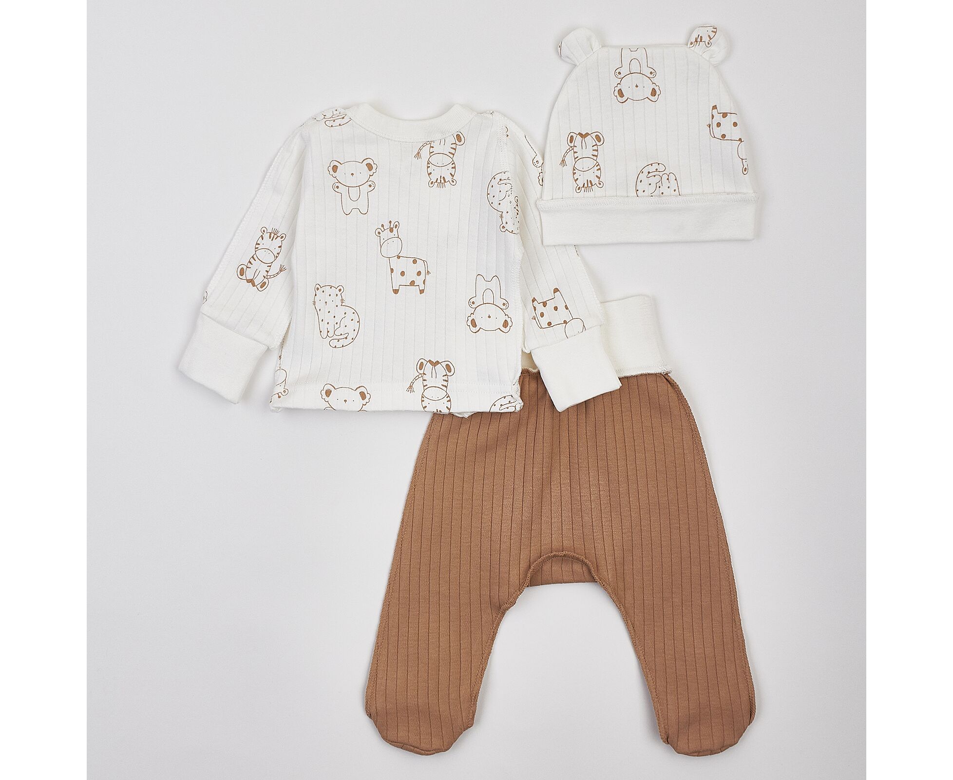 Дитячий комплект для новонароджених. Складається з льолі, повзунків та шапочки. Виготовлений з бавовняного інтерлока преміум якості. Льоля з асиметричною застібкою на кнопки на запах. Зрізи льолі оброблені окантовкою з бавовняної рібани. Рукав реглан, манжети льолі з еластичної рібани та з відворотом, що дозволяє перетворити їх в царапки. Повзунки з ластовицею, без середніх швів, з поясом з еластичної рібани. Шапочка з симпатичними вушками та відворотом по низу з еластичного полотна. Натуральний склад полотна та шви назовні в усіх виробах комплекту, які не торкаються шкіри малюка, виключають будь-який дискомфорт та подразнення.