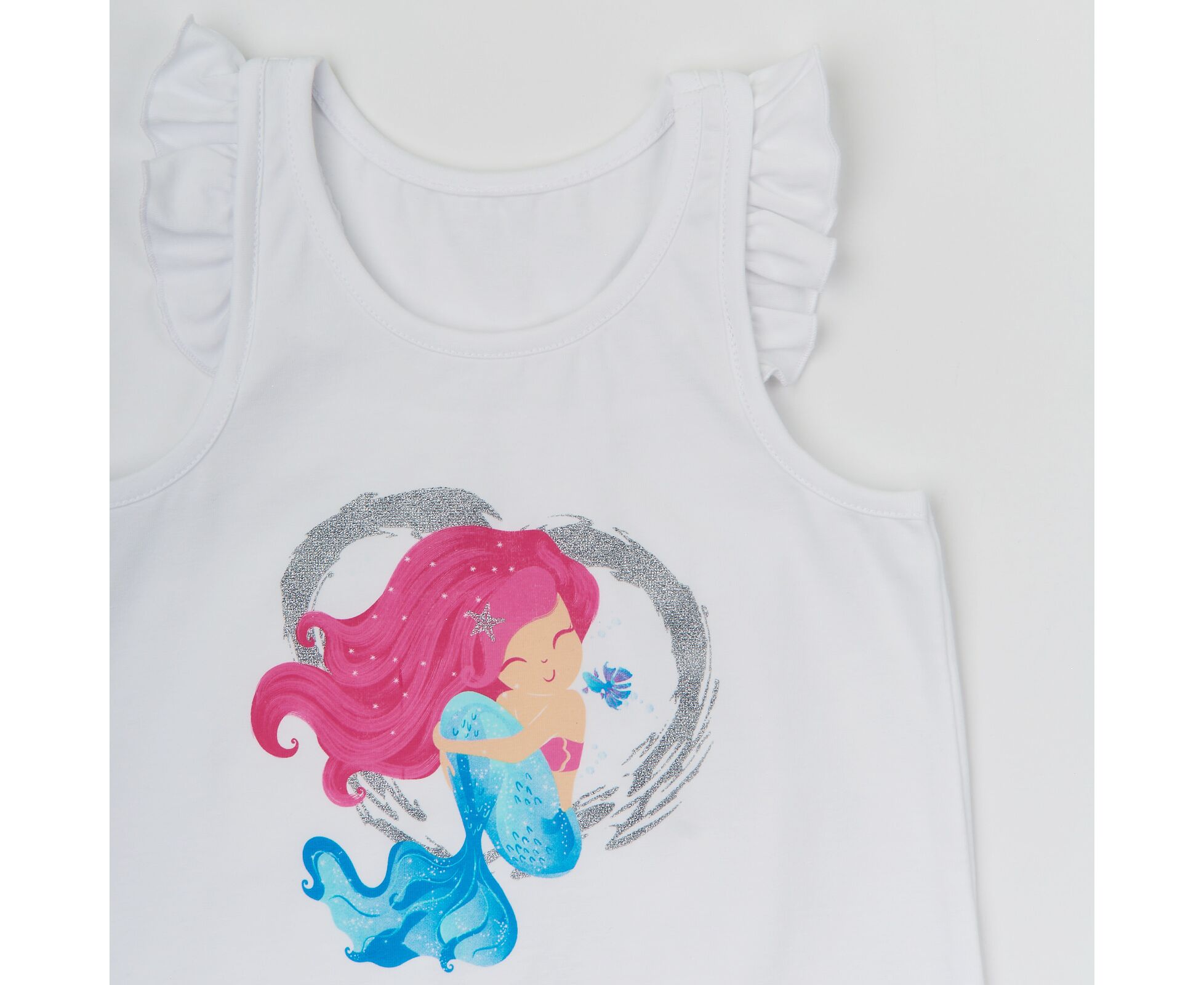 Літній комплект майка для дівчинки, з майки-туніки та лосин. Комплект з якісного стрейч-куліру, який добре тримає форму та колір навіть після багаторазового прання. Майка-туніка з яскравим принтом на переді, рюшами-крильцями на плечах, горловина та пройми окантовані руликом. Спинка з кокеткою та призборкою, з фігурною лінією низа - трошки подовженою. Лосини з цільнокроєним поясом на резинці, добре облягають фігуру, не сковують рухи дитини.