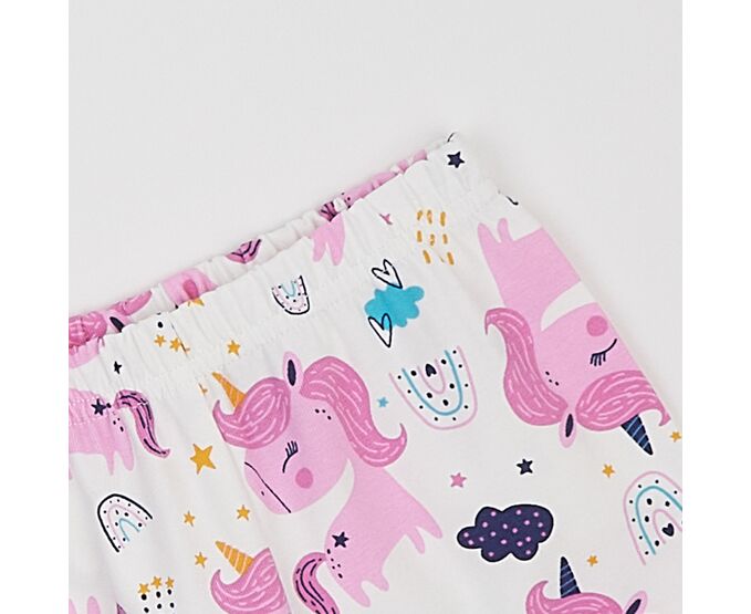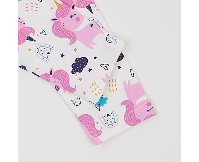 Дитячий комплект з туніки та лосин. Виготовлений з якісного, дуже м'якого, приємного на дотик, тоненького стрейч-куліру з легким начосом, який добре тримає форму навіть після багаторазового прання. Силует туніки трошки розширений на бедрах, завужується донизу. Перед оздоблений яскравим друком. Рукава реглан, по низу манжети з основного полотна. В бокових швах вмісткі кишені.. Круглий виріз горловини оброблений оздоблювальним лампасом з внутрішнього боку, без застібки. Лосини з цільнокроєним поясом на резинці, добре облягають фігуру, не сковують рухи дитини.