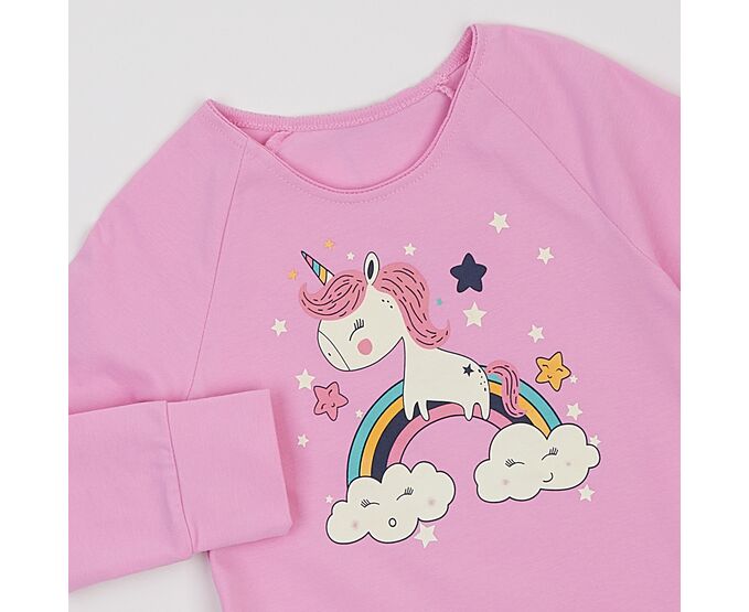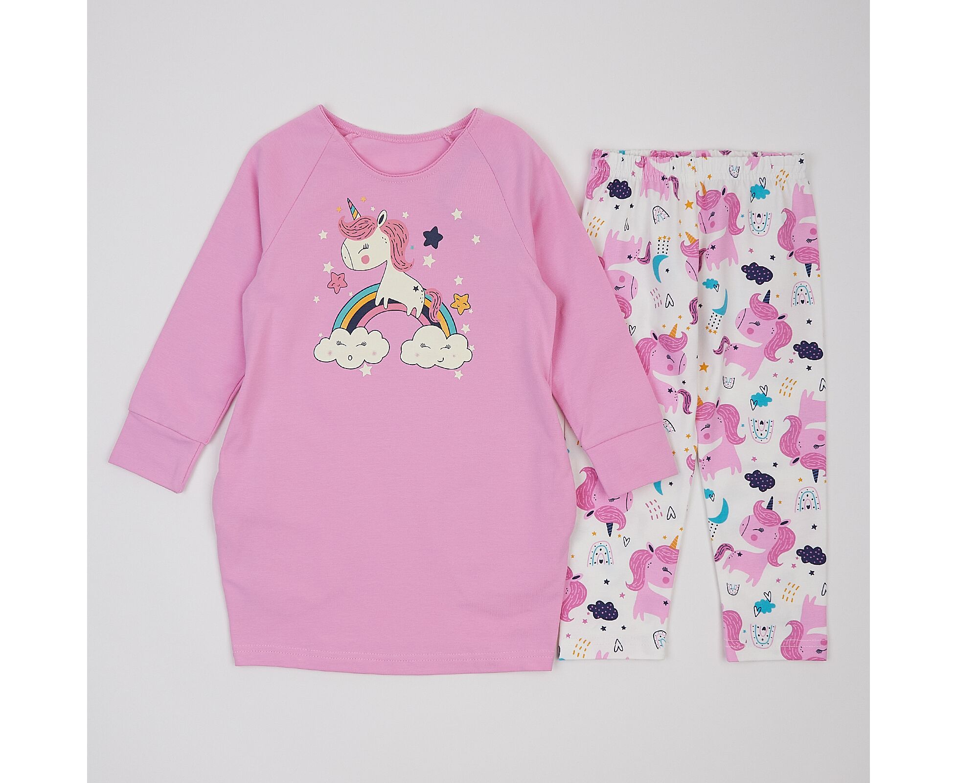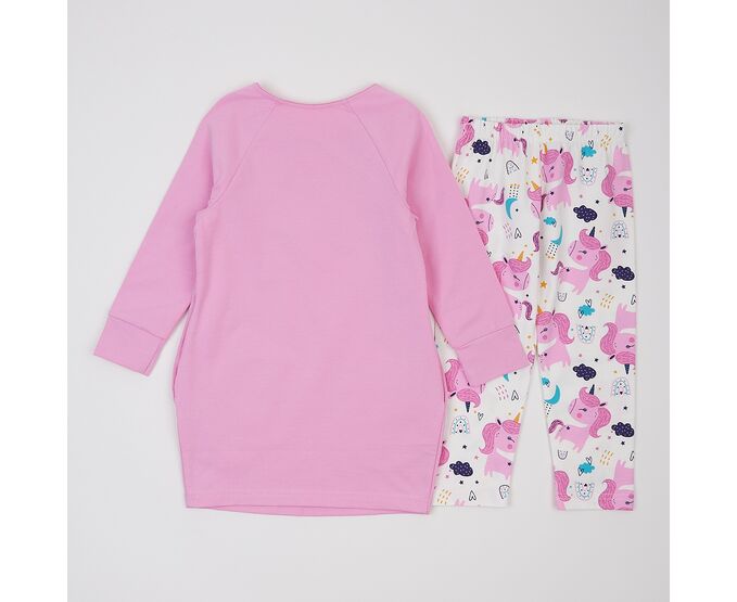 Дитячий комплект з туніки та лосин. Виготовлений з якісного, дуже м'якого, приємного на дотик, тоненького стрейч-куліру з легким начосом, який добре тримає форму навіть після багаторазового прання. Силует туніки трошки розширений на бедрах, завужується донизу. Перед оздоблений яскравим друком. Рукава реглан, по низу манжети з основного полотна. В бокових швах вмісткі кишені.. Круглий виріз горловини оброблений оздоблювальним лампасом з внутрішнього боку, без застібки. Лосини з цільнокроєним поясом на резинці, добре облягають фігуру, не сковують рухи дитини.