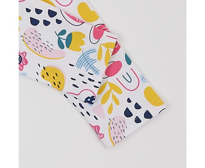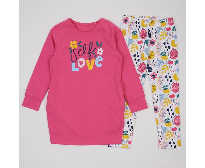 Дитячий комплект з туніки та лосин. Виготовлений з якісного, дуже м'якого, приємного на дотик, тоненького стрейч-куліру з легким начосом, який добре тримає форму навіть після багаторазового прання. Силует туніки трошки розширений на бедрах, завужується донизу. Перед оздоблений яскравим друком. Рукава реглан, по низу манжети з основного полотна. В бокових швах вмісткі кишені.. Круглий виріз горловини оброблений оздоблювальним лампасом з внутрішнього боку, без застібки. Лосини з цільнокроєним поясом на резинці, добре облягають фігуру, не сковують рухи дитини.
