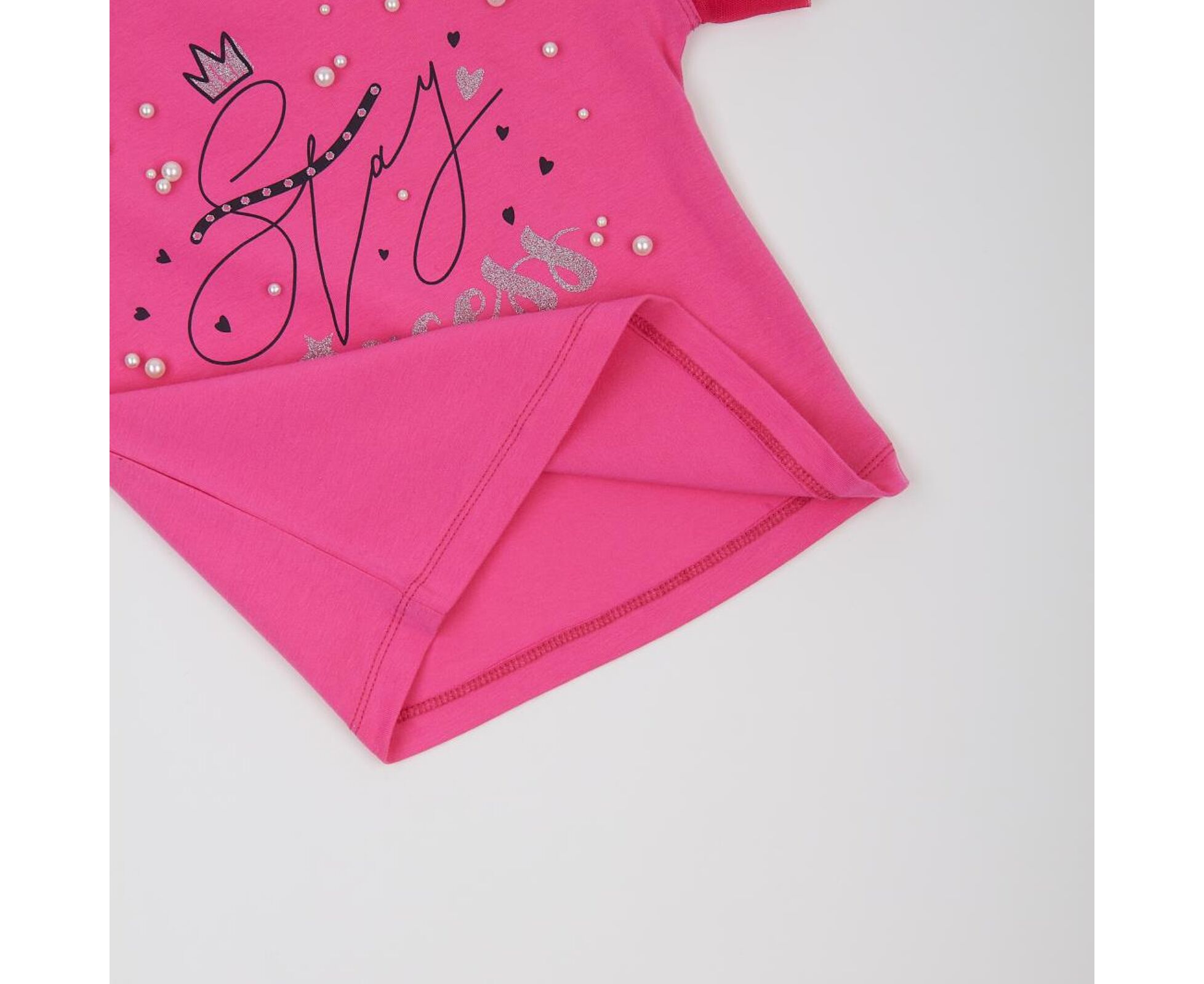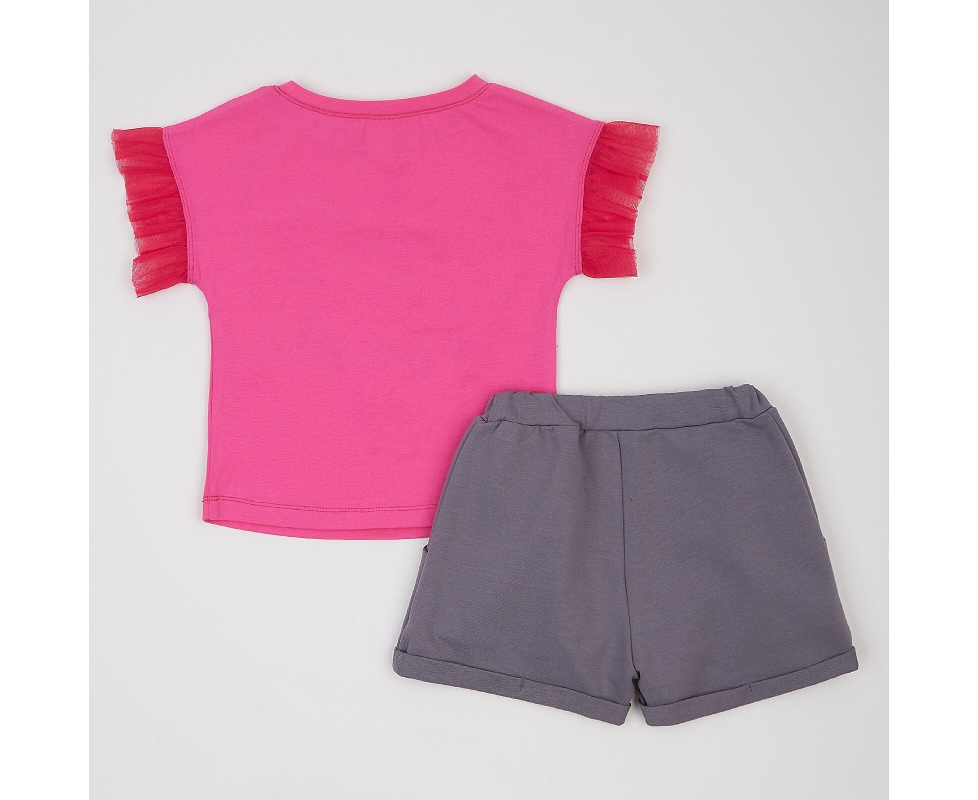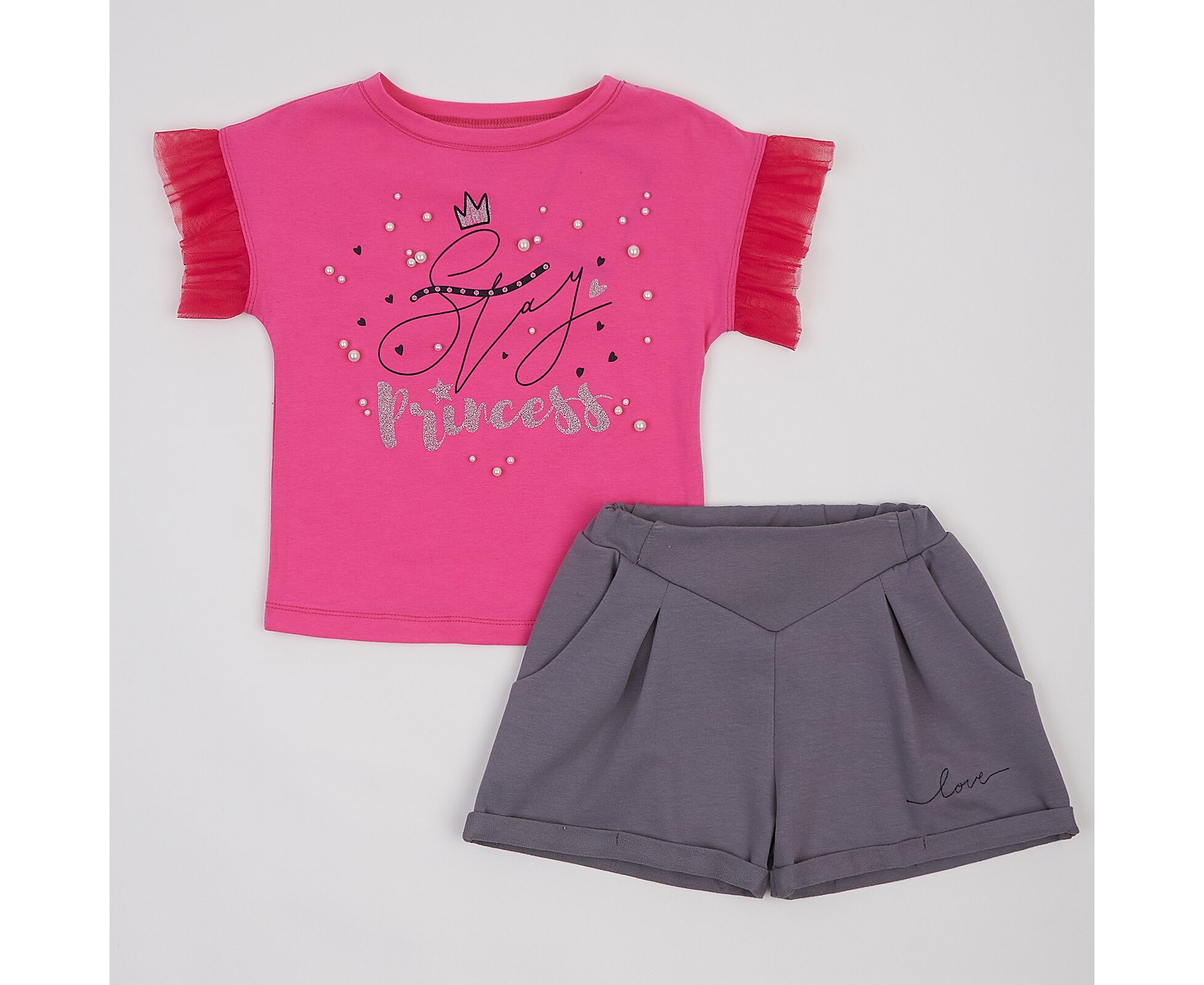 Стильний комплект з футболки та шортів для дівчинки. Футболка з якісного стрейч-куліру, який добре тримає колір та форму навіть після багаторазового прання. Футболка зі стильним принтом з блискучими елементами та декоративними намистинками-перлинками на переді , з спущеним плечем та рукавом-рюшею з двох шарів м'якої еластичної євросітки. Шорти з тоненької двонитки-петлі. Фігурний пояс, на передніх половинках зустрічні склади, бокові кишені. По низкам шорт подвійний відворот, закріплений в декількох місцях.