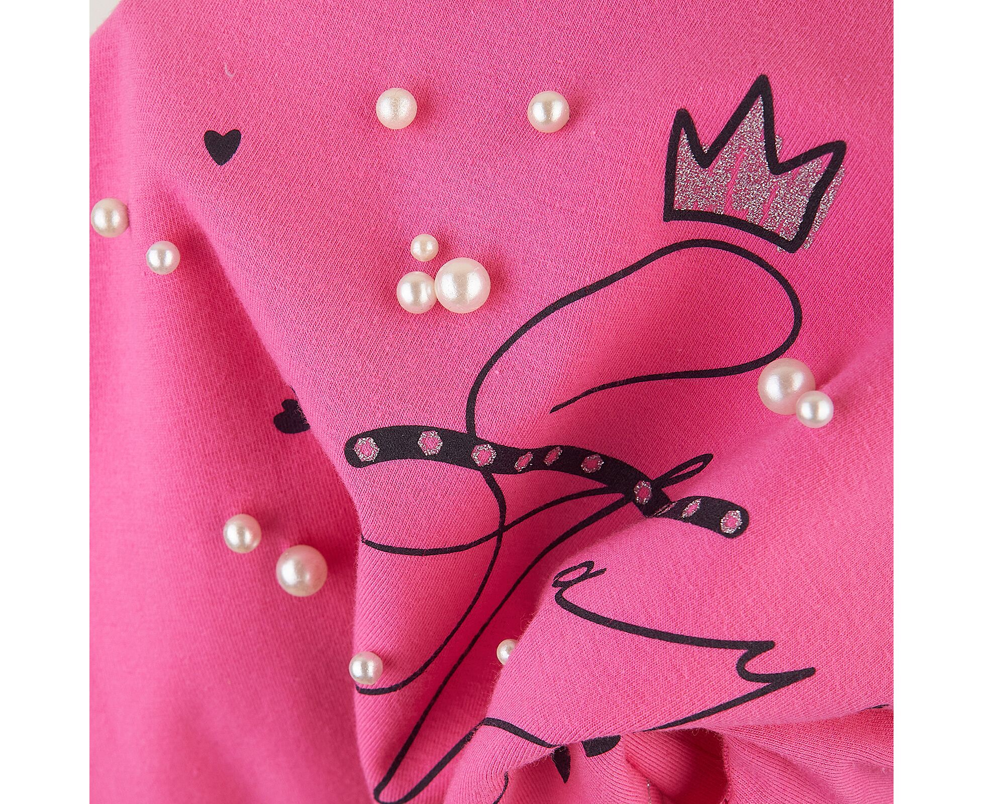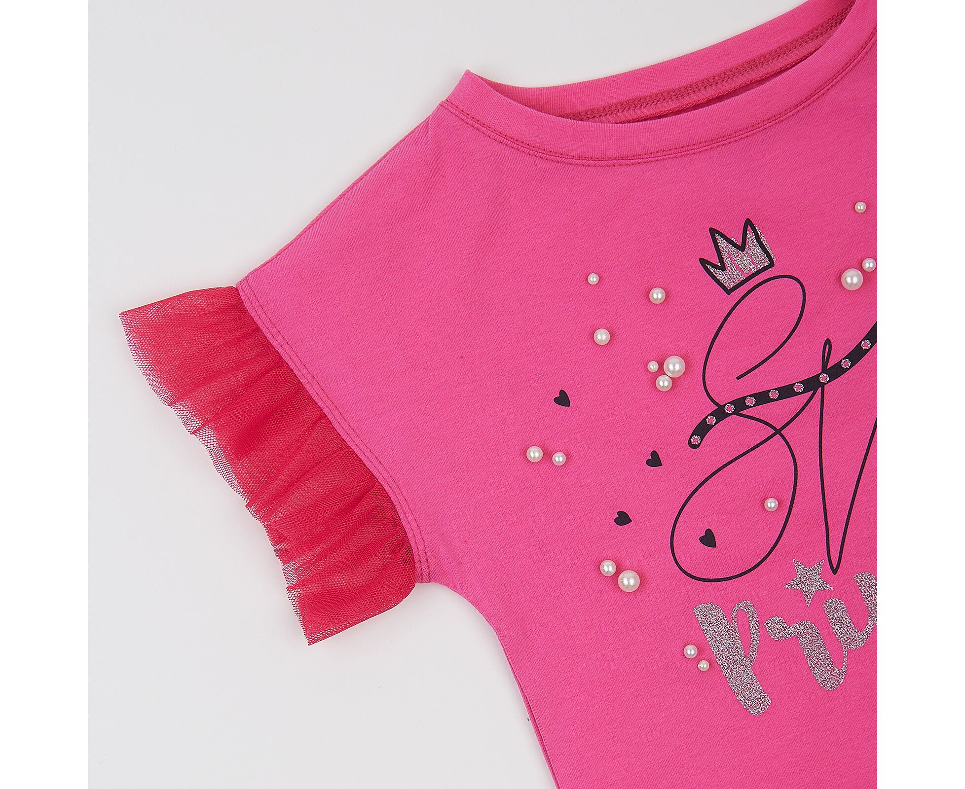 Стильний комплект з футболки та шортів для дівчинки. Футболка з якісного стрейч-куліру, який добре тримає колір та форму навіть після багаторазового прання. Футболка зі стильним принтом з блискучими елементами та декоративними намистинками-перлинками на переді , з спущеним плечем та рукавом-рюшею з двох шарів м'якої еластичної євросітки. Шорти з тоненької двонитки-петлі. Фігурний пояс, на передніх половинках зустрічні склади, бокові кишені. По низкам шорт подвійний відворот, закріплений в декількох місцях.