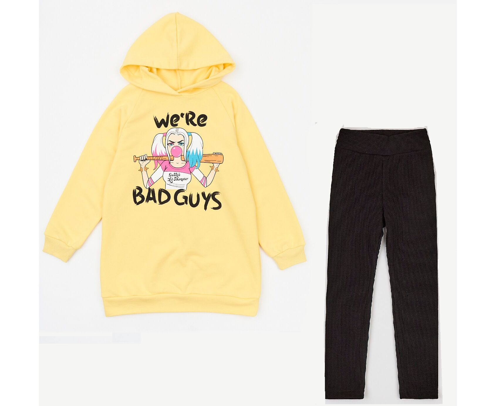 Дитячий комплект з жовтої худі-туніки з каптуром та фактурних чорних утеплених лосин. Комплект ідеально підійде на прохолодну погоду, коли наверх можна накинути жилет чи курточку, а ніжкам буде тепло без додаткових зусиль. Туніка вільного силуету, з якісної, приємної на дотик тринитки-петлі, яка не скачується та добре тримає форму навіть після багаторазового прання. Перед оздоблений стильним друком. Рукава реглан, по низу рукавів манжети з еластичного рубчику. По низу виробу пояс з основного полотна. Еластичні , з тоненьким начосиком всередині, дитячі лосини з з якісного, дуже м'якого, приємного на дотик, фактурного рубчику . Без бокових швів, на широкому поясі без резинки, еластичність тканини забезпечує щільне та комфортне прилігання до тіла.