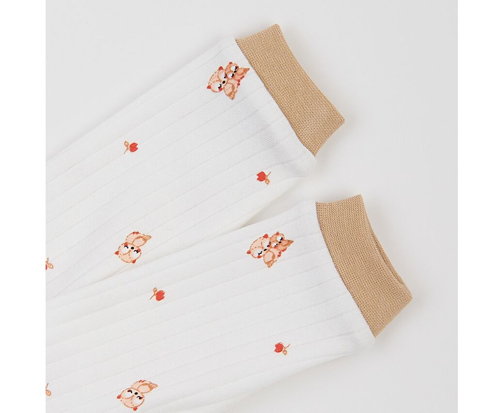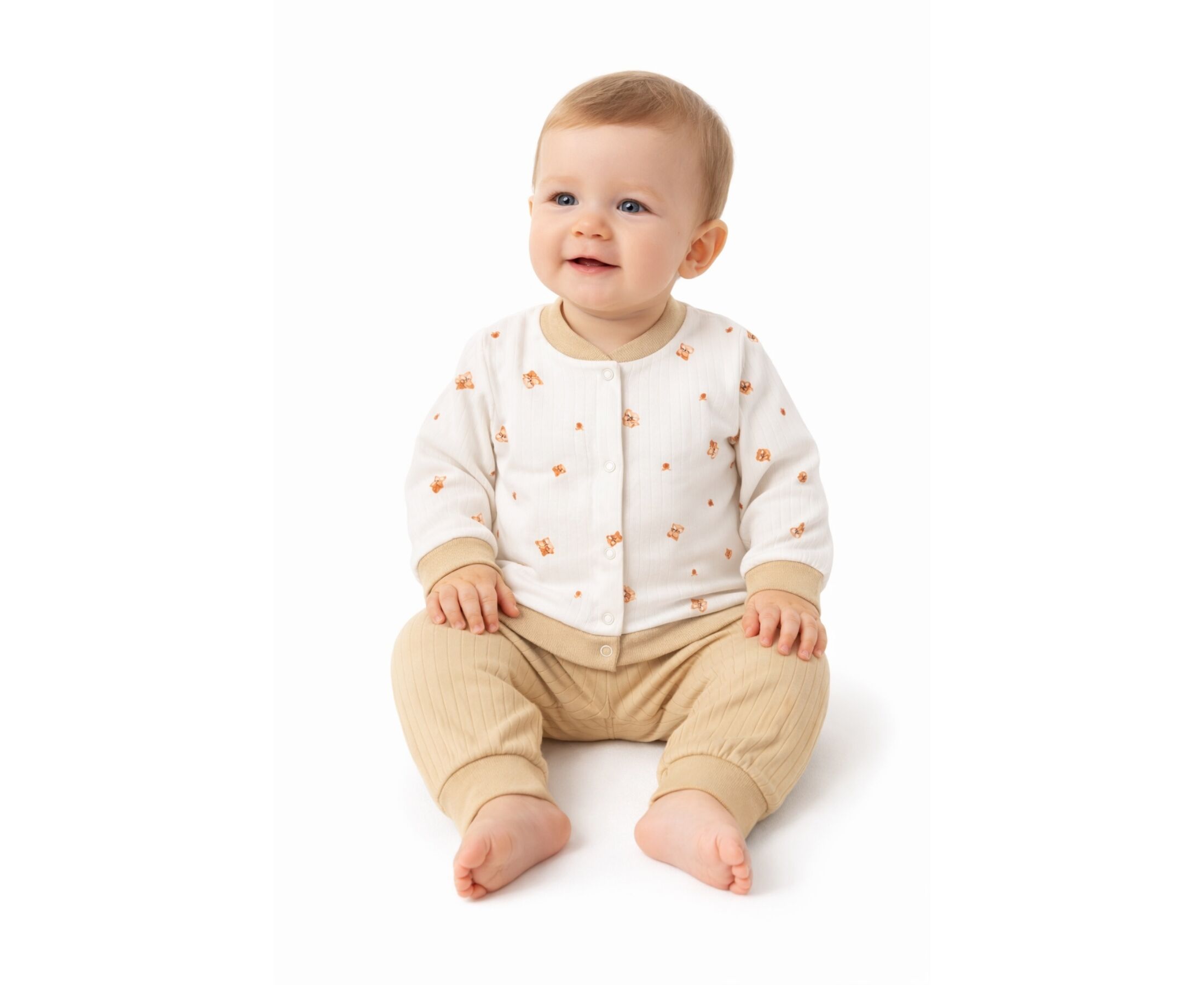 Дитячий комплект з кофточки та штанців, виготовлений з натурального, м'якого інтерлоку преміум якості. Кофточка з принтованої тканини, з центральною застібкою на кнопки. Рукав втачний. Стійка, манжети по низу рукавів та пояс по низу кофти з еластичного полотна. Штани однотонні, з притачним поясом з продітою еластичною тасьмою. Пояс та манжети штанів з еластичного полотна.