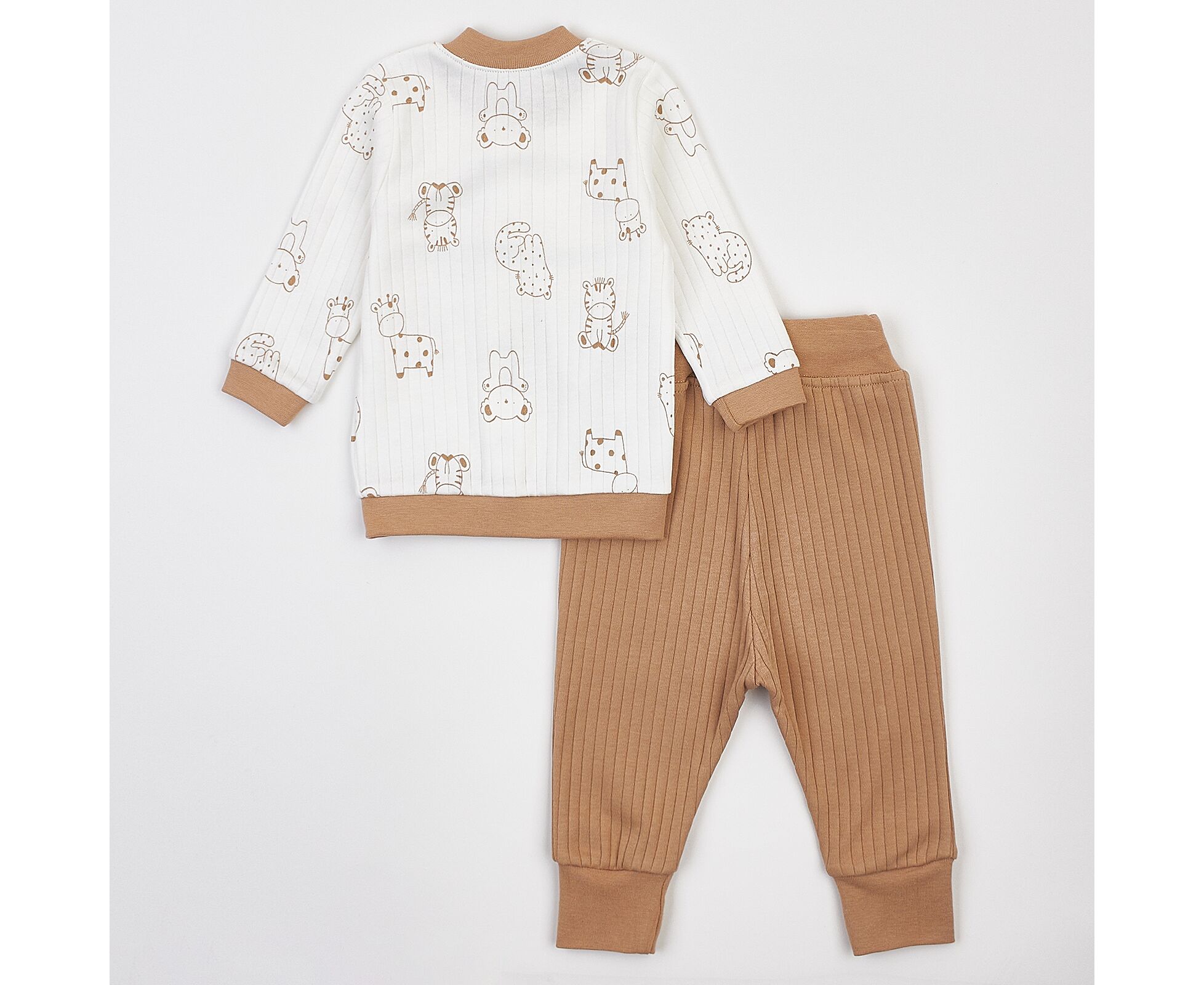 Дитячий комплект з кофточки та штанців, виготовлений з натурального, м'якого інтерлоку преміум якості. Кофточка з принтованої тканини, з центральною застібкою на кнопки. Рукав втачний. Стійка, манжети по низу рукавів та пояс по низу кофти з еластичного полотна. Штани однотонні, з притачним поясом з продітою еластичною тасьмою. Пояс та манжети штанів з еластичного полотна.