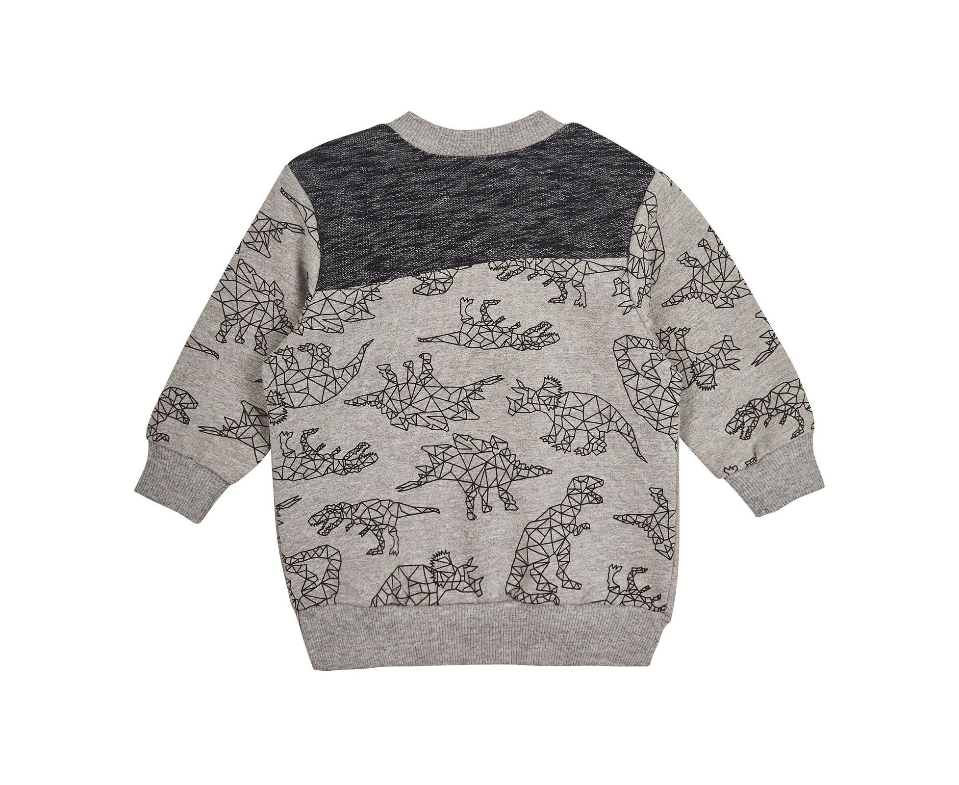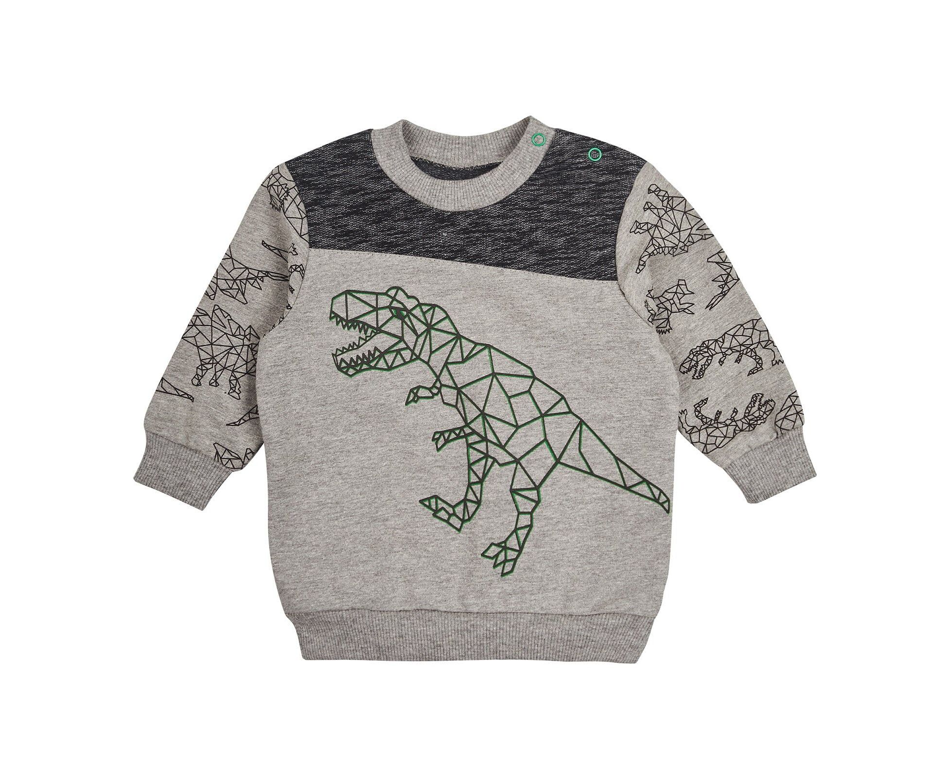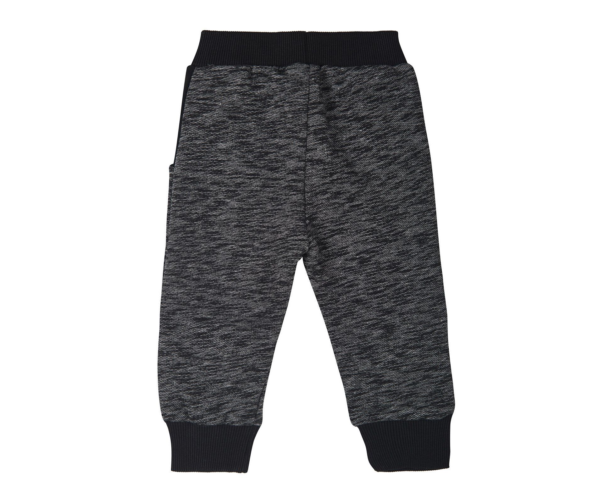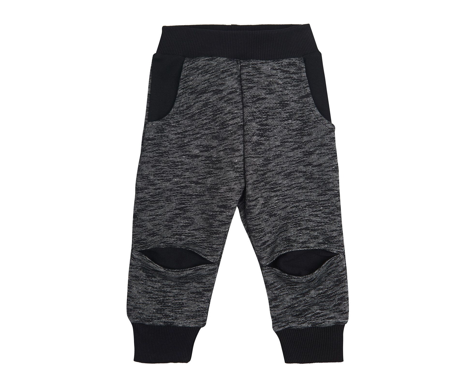 Дитячий костюм з світшоту та штанів. Костюм з дуже якісної меланжевої двонитки. На переді світшоту принт. Перед та спинка з кокеткою, на плечі застібка на дві кнопки. Стійка горловини, пояс по низу світшоту та манжети рукавів з еластичного полотна. Штани з боковими кишенями на передніх половинках та з декоративними щілинами на рівні коліна.Пояс та манжети по низкам штанів з фактурного еластичного полотна. В пояс продіта еластична гумка.