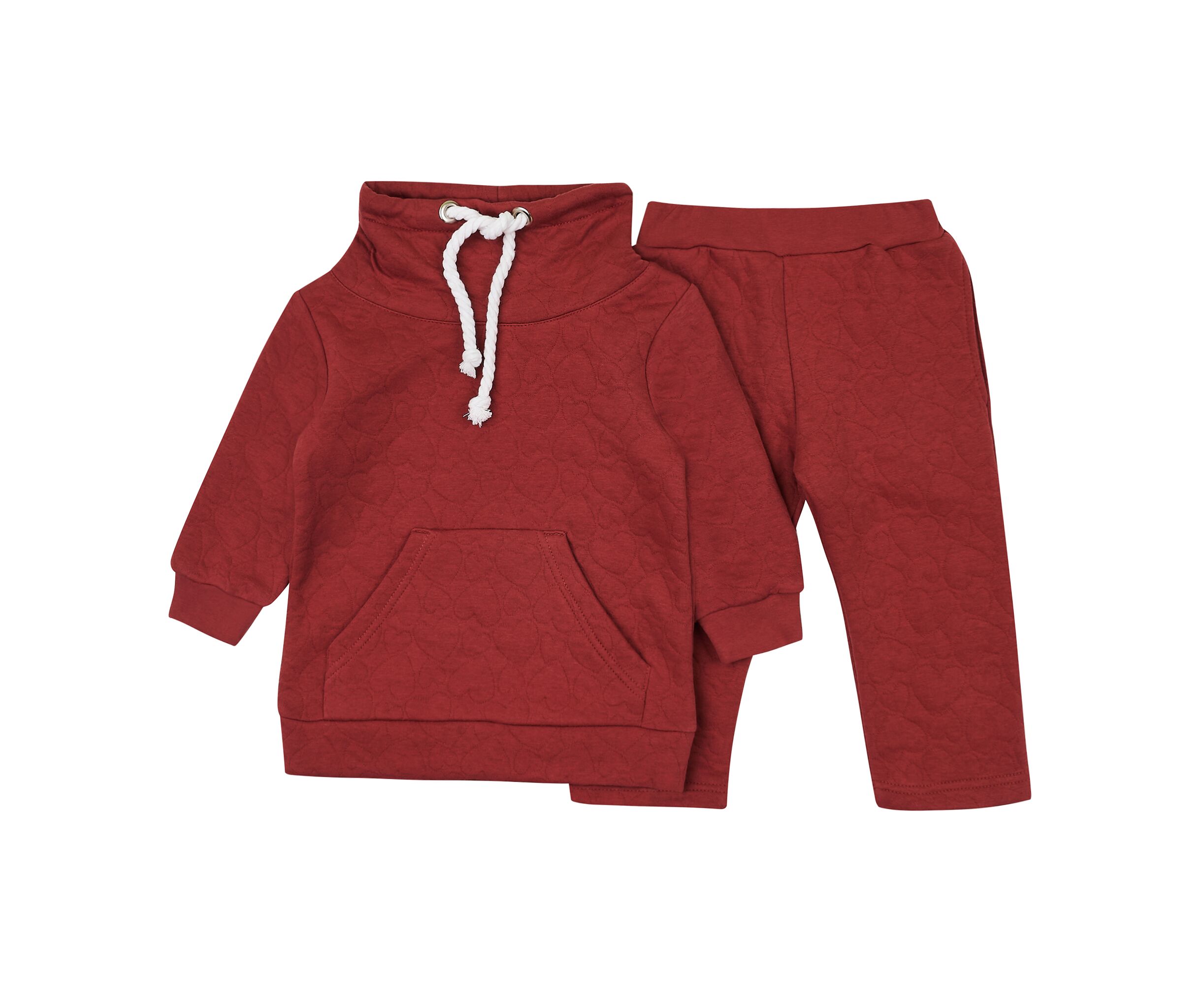 Дитячий комплект з толстовки та штанів з приємного м'якого бавовняного капітону модного теракотового кольору. Толстовка з високою стійкою з продітим через люверси функціональним шнуром та з вмісткою кишенею-кенгуру на переді. Рукав втачний, по низу рукава манжети з еластичного рубчику. Штани з кишенями в бокових швах, низки прямі (без манжет).