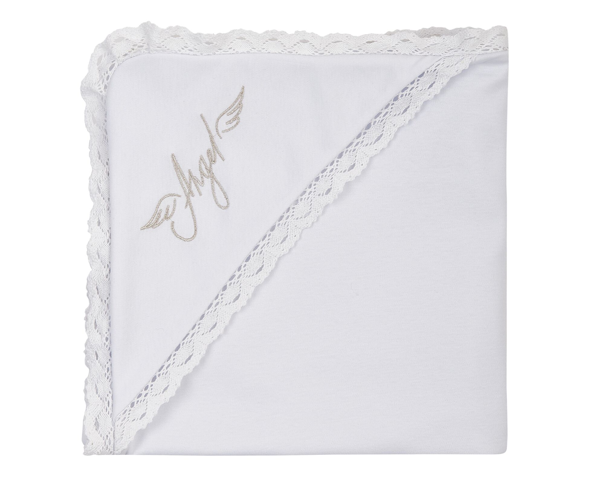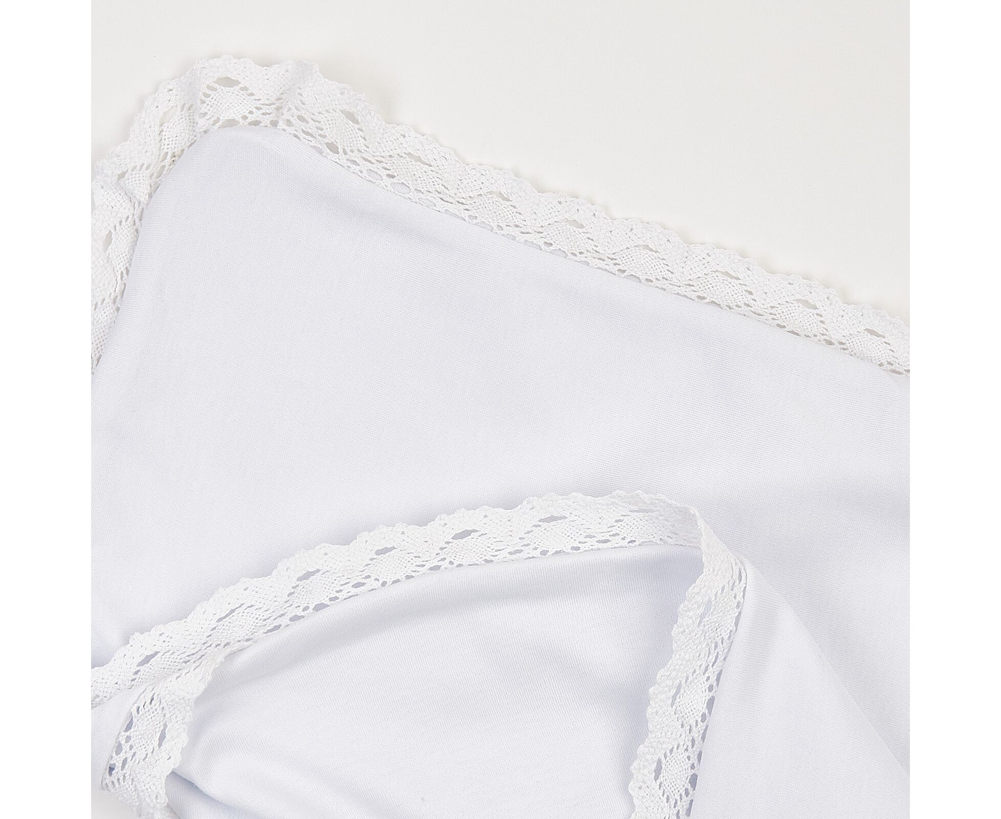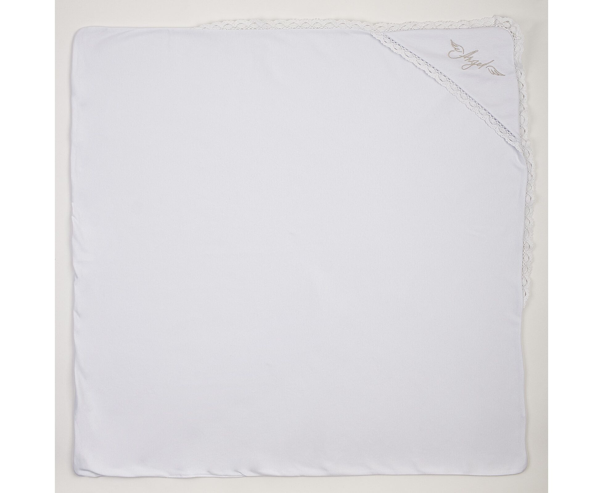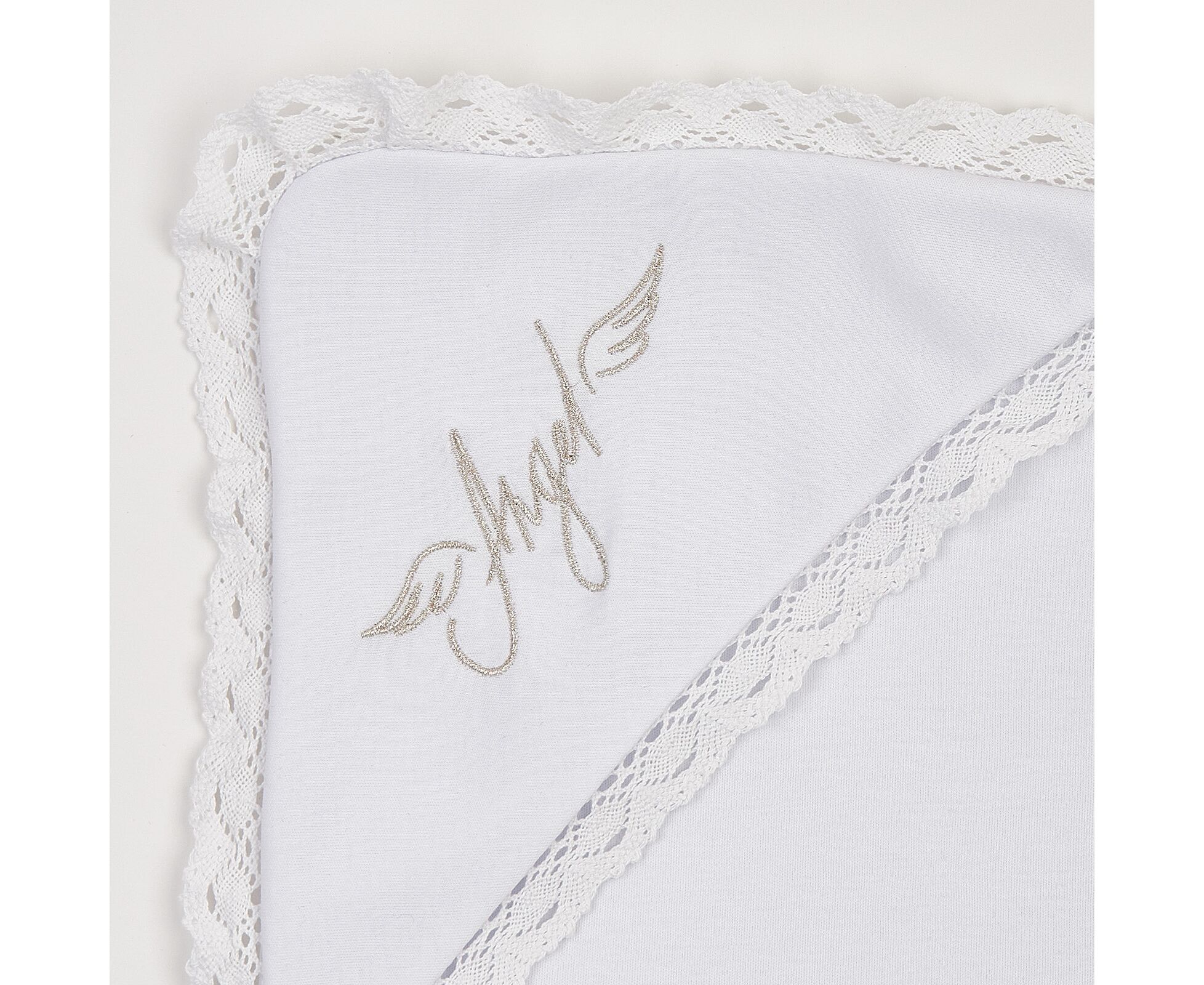 Крижма для хрещення новонароджених. Виготовлена з дуже приємної на дотик трикотажної бавовняної тканини преміум якості - інтерлок (два шари - і верх, і підкладка), з куточком, прикрашеним блискучою вишивкою та широким лляним мереживом по всьому периметру виробу.