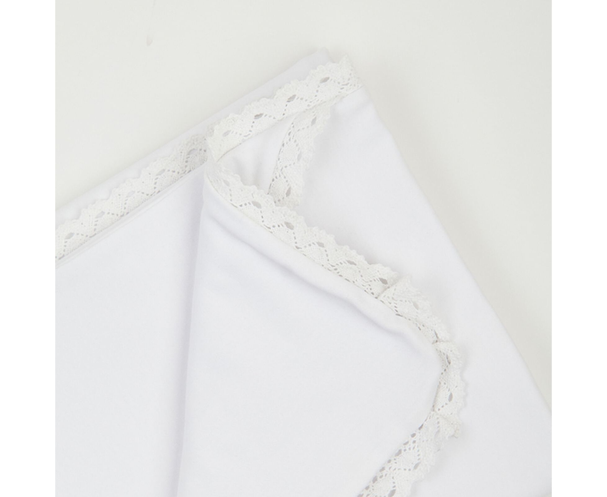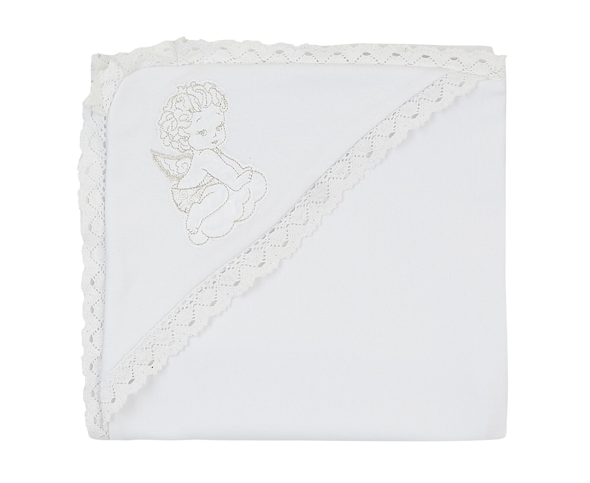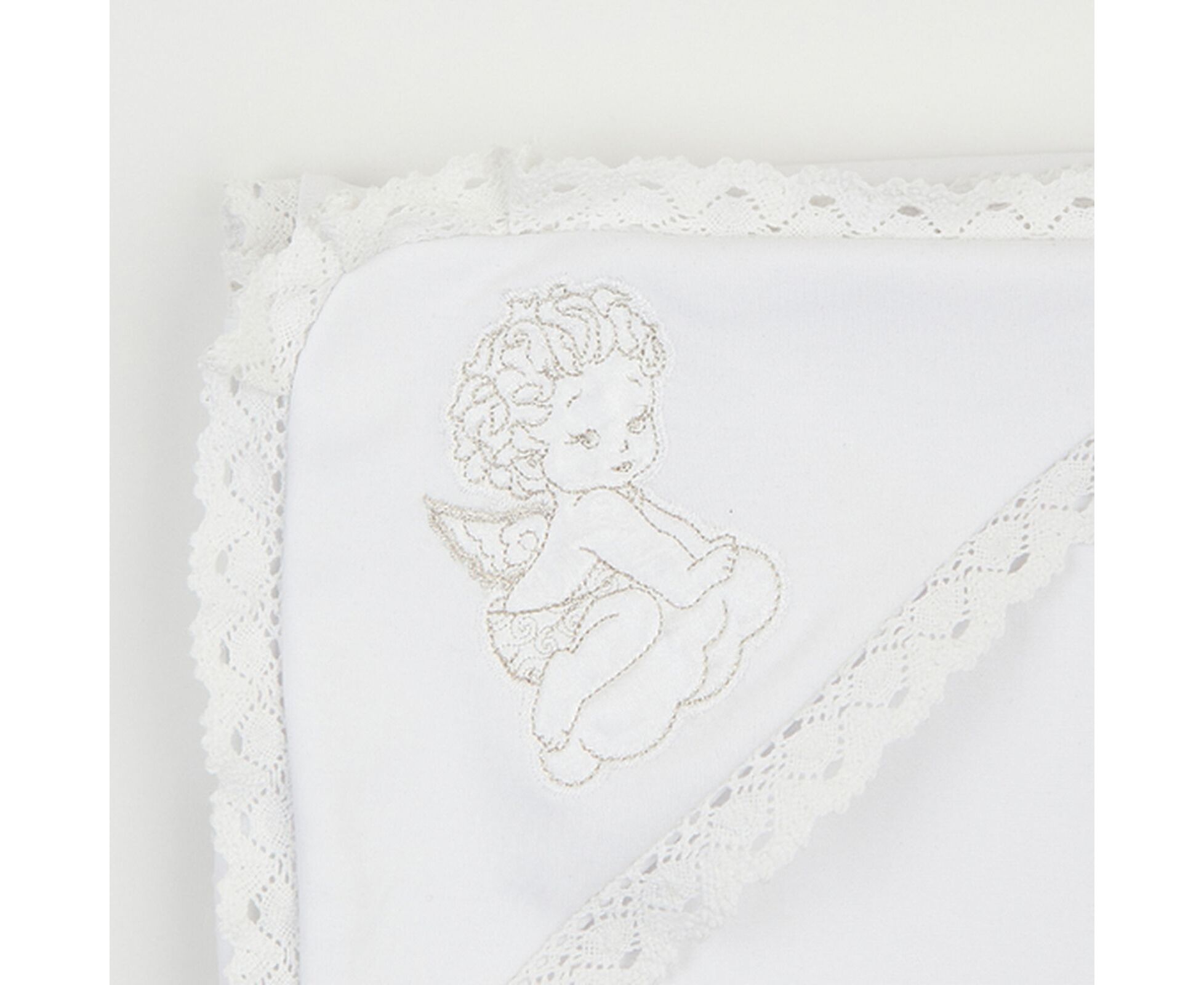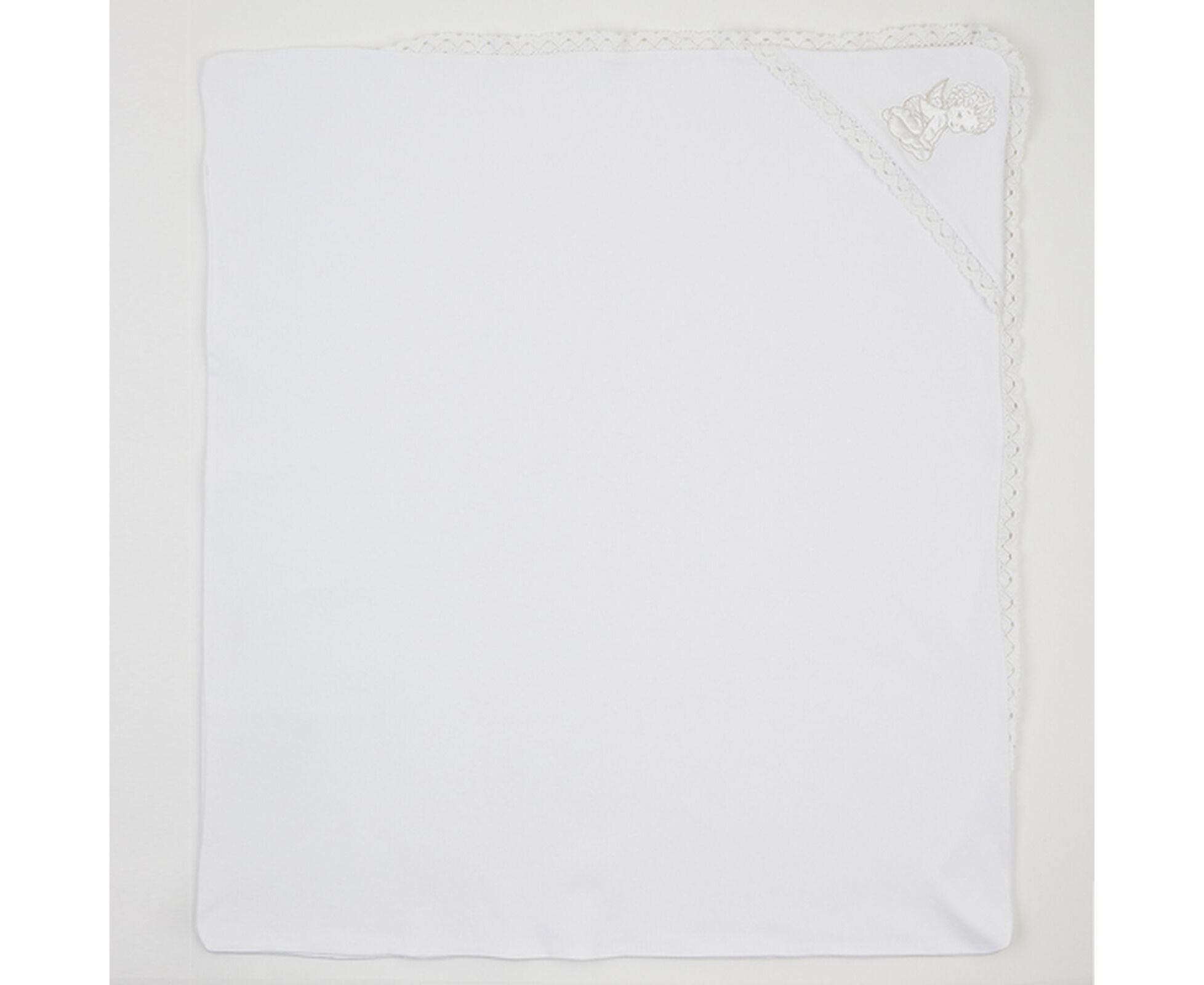 Крижма для хрещення новонароджених. Виготовлена з дуже приємної на дотик трикотажної бавовняної тканини преміум якості - інтерлок (два шари - і верх, і підкладка), з куточком, прикрашеним блискучою вишивкою та широким лляним мереживом по всьому периметру виробу.